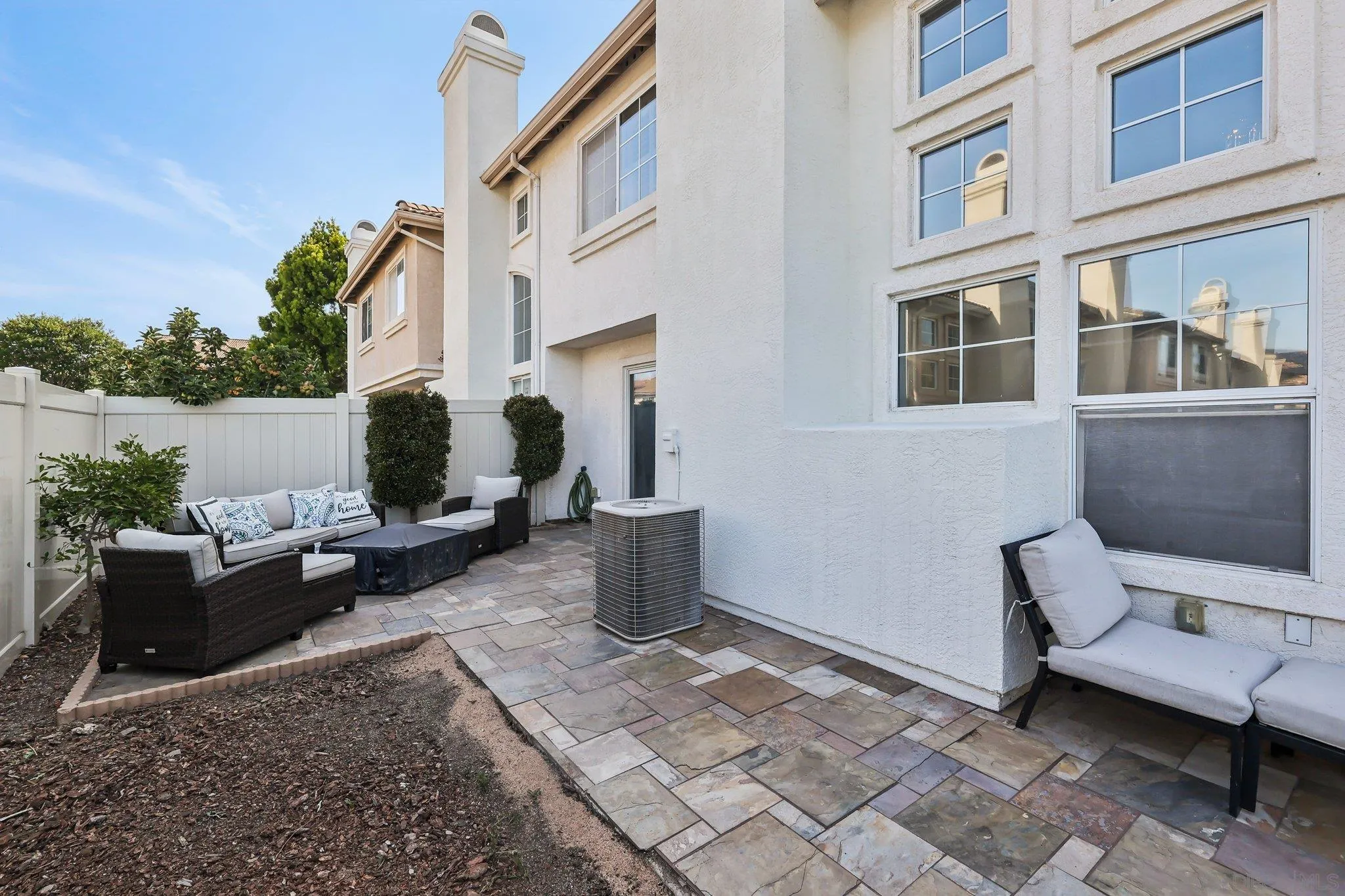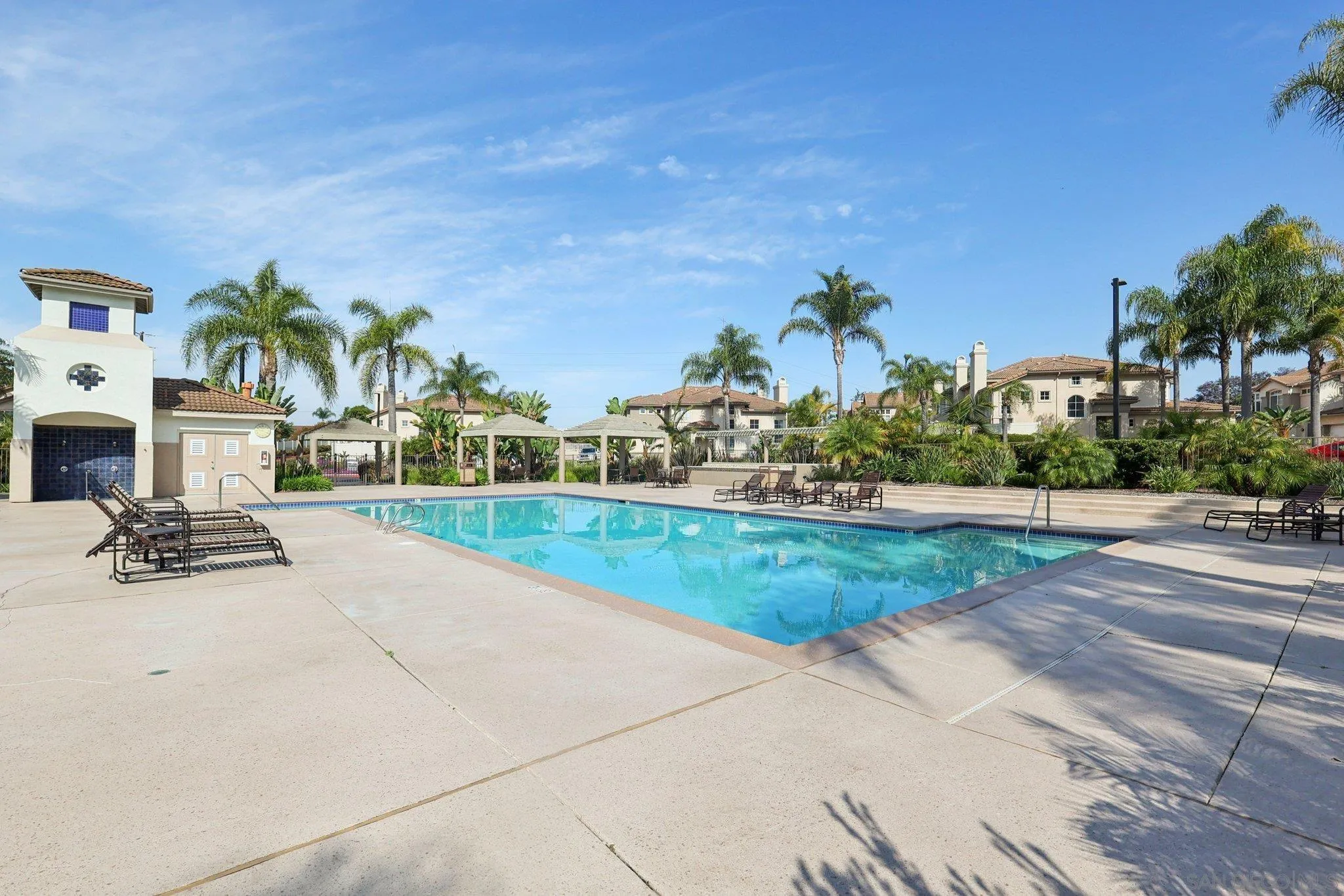 Nestled in a beautifully maintained gated community, this stylish 2-bedroom, 2.5-bathroom townhome offers the perfect blend of comfort, functionality, and charm. Spanning 1,236 square feet, the home features a light-filled open layout with tasteful updates and modern finishes throughout. Step inside to discover a spacious living area with a cozy fireplace, sleek flooring, and ample room for entertaining. The kitchen boasts stainless steel appliances, generous cabinet space, and a breakfast bar that flows seamlessly into the dining area. Upstairs, both bedrooms offer en-suite bathrooms and large closets, providing an ideal setup for privacy or guests. Enjoy the convenience of in-unit laundry, an attached garage, and your own private patio — perfect for morning coffee, outdoor dining, or a quiet escape. The community offers a resort-like atmosphere with amenities that include a pool, spa, and lush green spaces. Ideally located near shopping, dining, and a short drive to the beach, this home offers relaxed Southern California living with gated security and low-maintenance comfort.
