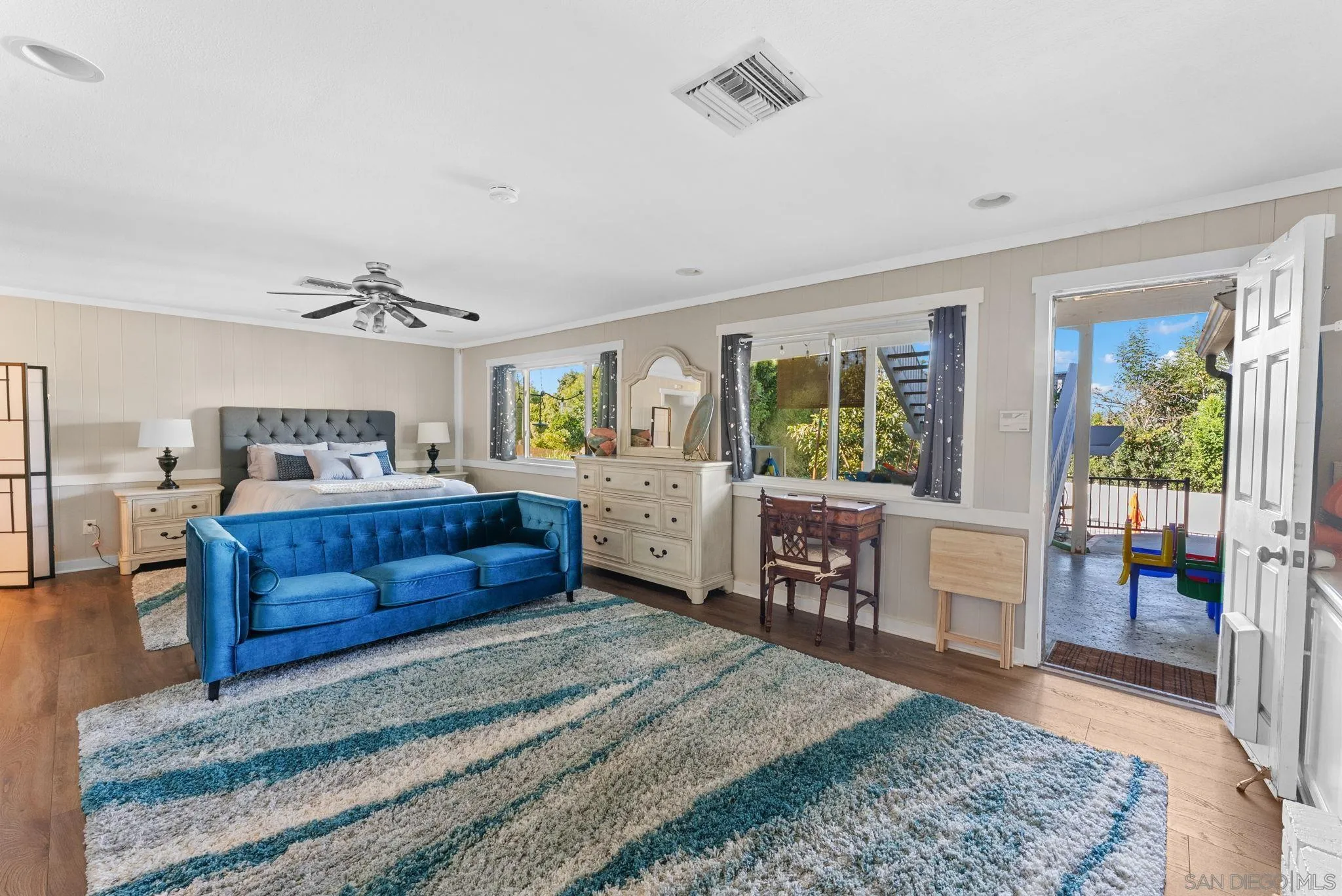 Welcome to luxury powered by 68 OWNED solar panels, including 3 Tesla power walls. Unparalleled elegance, sustainability and self-sufficiency are nestled in the hills of South Escondido delivering modern comfort while keeping operating costs remarkably low. With 5,368 sq.ft including an attached ADU, this palace is meticulously designed with living space ideal for family function & entertainment. A massive granite island highlights the open-concept kitchen which flows effortlessly into the upper-level living area where a 400+ sq. ft. covered terrace is the perfect spot to unwind with panoramic sunset views. The primary suite has striking vaulted ceilings with exposed beams, a spacious walk-in closet, and a luxurious spa-inspired bath ideal for relaxing. Additional bedrooms are thoughtfully placed on both levels. The lower level boasts a fully equipped ADU with private exterior access, a full kitchen, living room, an en-suite bath, laundry utilities, and it’s own outdoor area—ideal for generating income and/or multi-generational living. Exposure from the west side bathes the property in natural light & delivers breathtaking sunsets. The massive lot is highlighted by numerous fruit-bearing trees including Macadamia, Avocado, Pomegranate, Orange, Lemon, and more along with thriving grapevines—creating a private orchard retreat. Adding to it’s charm, the estate is home to six hens that produce over two dozen eggs weekly, enhancing the self-sustaining lifestyle. With a fully fenced & heated pool & spa, turf lawns, and a charming playhouse, this property is truly extraordinary!