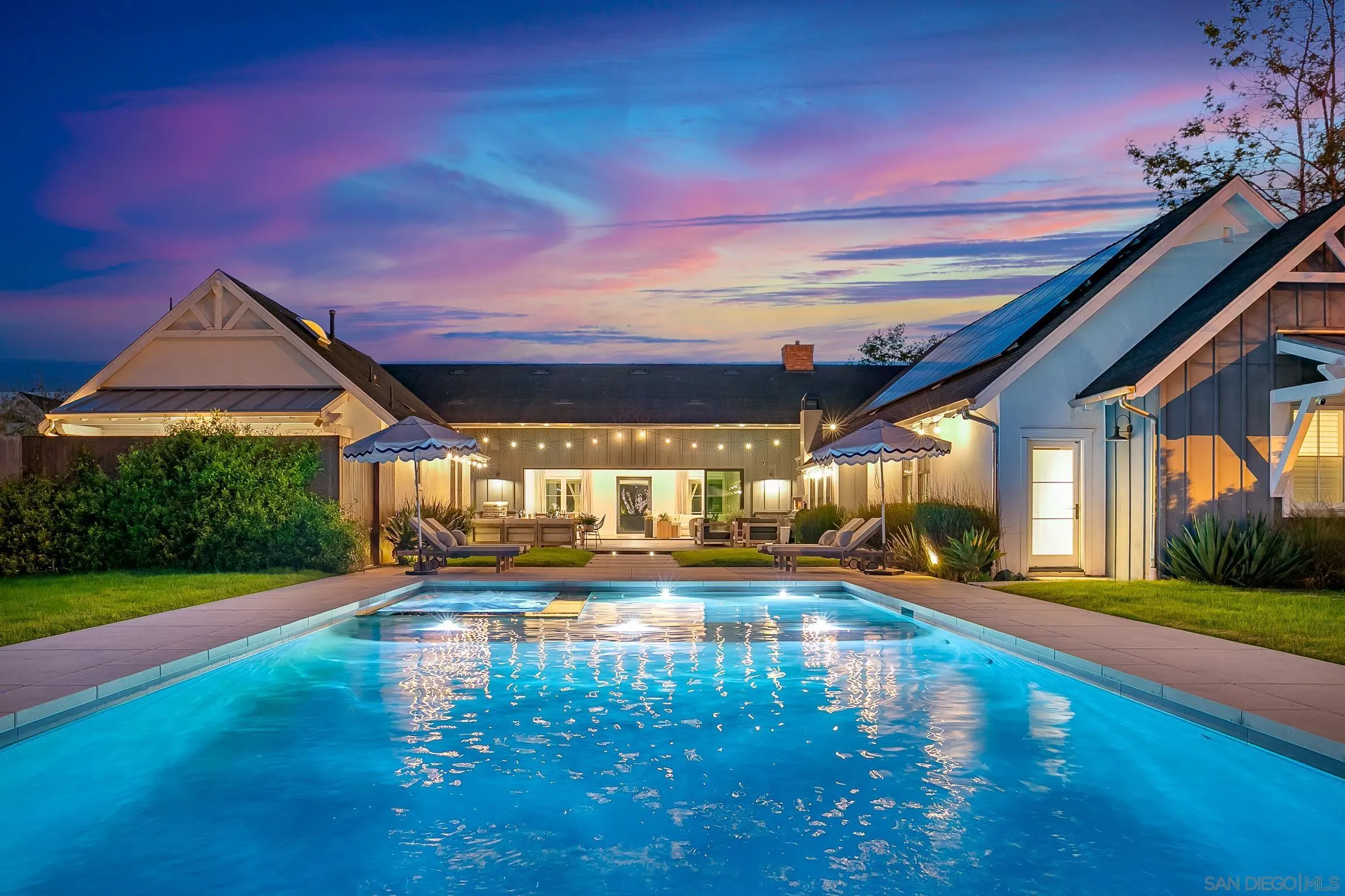 MID-TERM ONLY FURNISHED RENTAL - AVAILABLE STARTING JUNE 1 - Encinitas Coastal Farmhouse Retreat with Pool, Spa & Guest Suite Welcome to this luxurious coastal retreat blending farmhouse elegance with resort-style living just 1.5 miles from the beach. This expansive property features a main house and detached guest suite, offering the ideal setup for families, groups, or extended stays. The single-level main home includes four bedrooms and 3.5 baths with an open-concept layout, vaulted ceilings, and seamless indoor-outdoor living. The chef’s kitchen features stainless appliances, a large island with seating for four, and flows into a dining area for eight and a spacious living room with La Cantina doors opening to the backyard. Outside, enjoy a resort-style setting with a pool with waterfall and baja ledge, spa, fire pit, fireplace, built-in BBQ, and multiple lounge and dining areas surrounded by a large grassy yard. The primary suite offers a spa-like bath with soaking tub, dual vanities, glass shower, and access to an outdoor shower with cold plunge and cedar sauna. A second en-suite bedroom, two additional bedrooms with jack and jill bath, and a flexible fourth bedroom or gym complete the main house. Additional features include a game room with pool table, dedicated office with three workstations, air conditioning, laundry, and included bikes and beach gear. The detached guest suite provides a private living space with a queen bed. Sleeping setup accommodates up to twelve guests. Rates vary by season and length of stay. Published amounts are estimates.