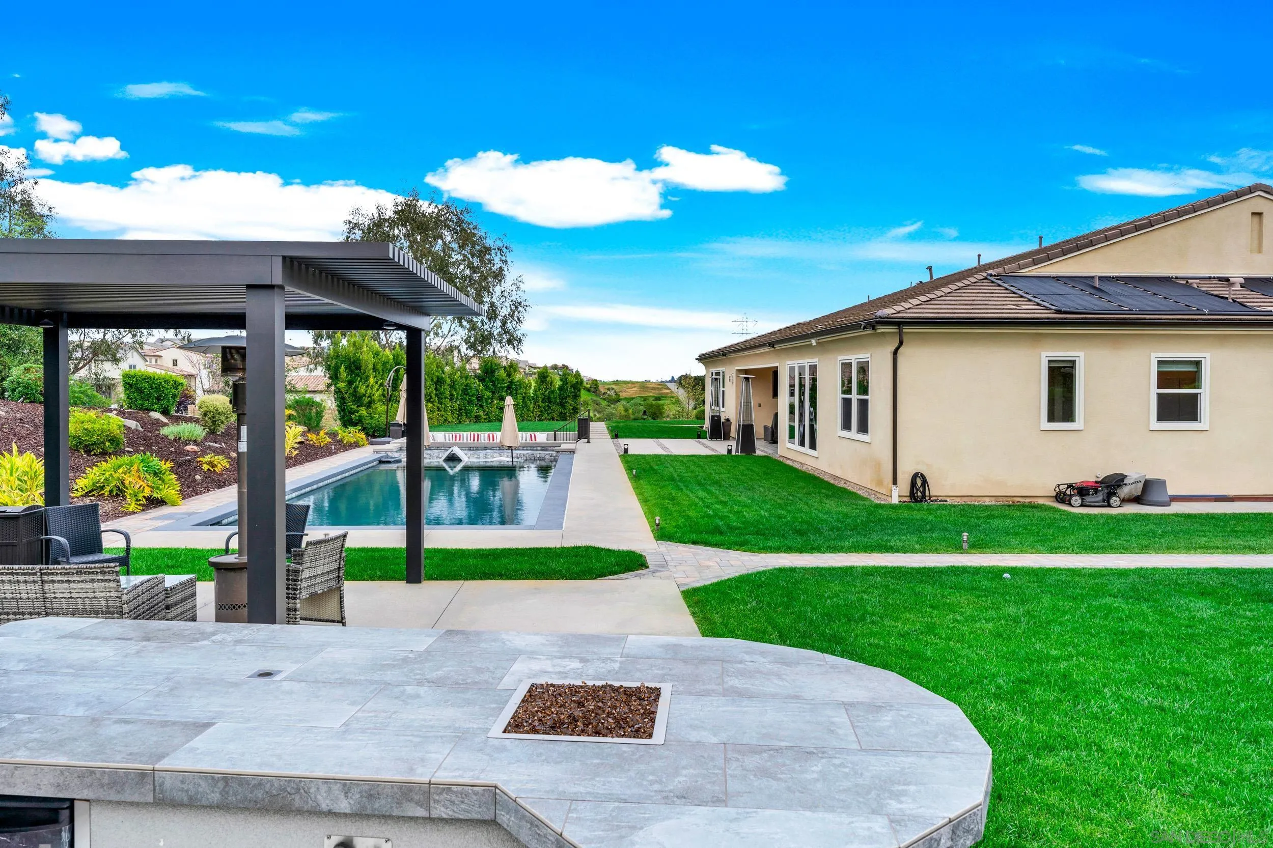 Exceptional single-story smart home on 1.5 private, view-filled acres, fully fenced and located on an elevated cul-de-sac with only two neighboring residences. This 2020 Lennar home features nearly $300,000 in resort-style landscaping, a saltwater pool and spa, and a dramatic fire-pit lounge with seating for 30—ideal for entertaining. Three-car garage with total parking for seven vehicles. Paid solar with Tesla batteries powers the estate and heats the pool/spa year-round. Elevated for sweeping vistas, privacy, and refined modern living. See supplement.