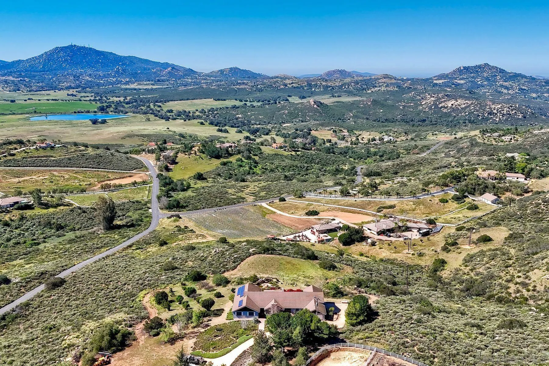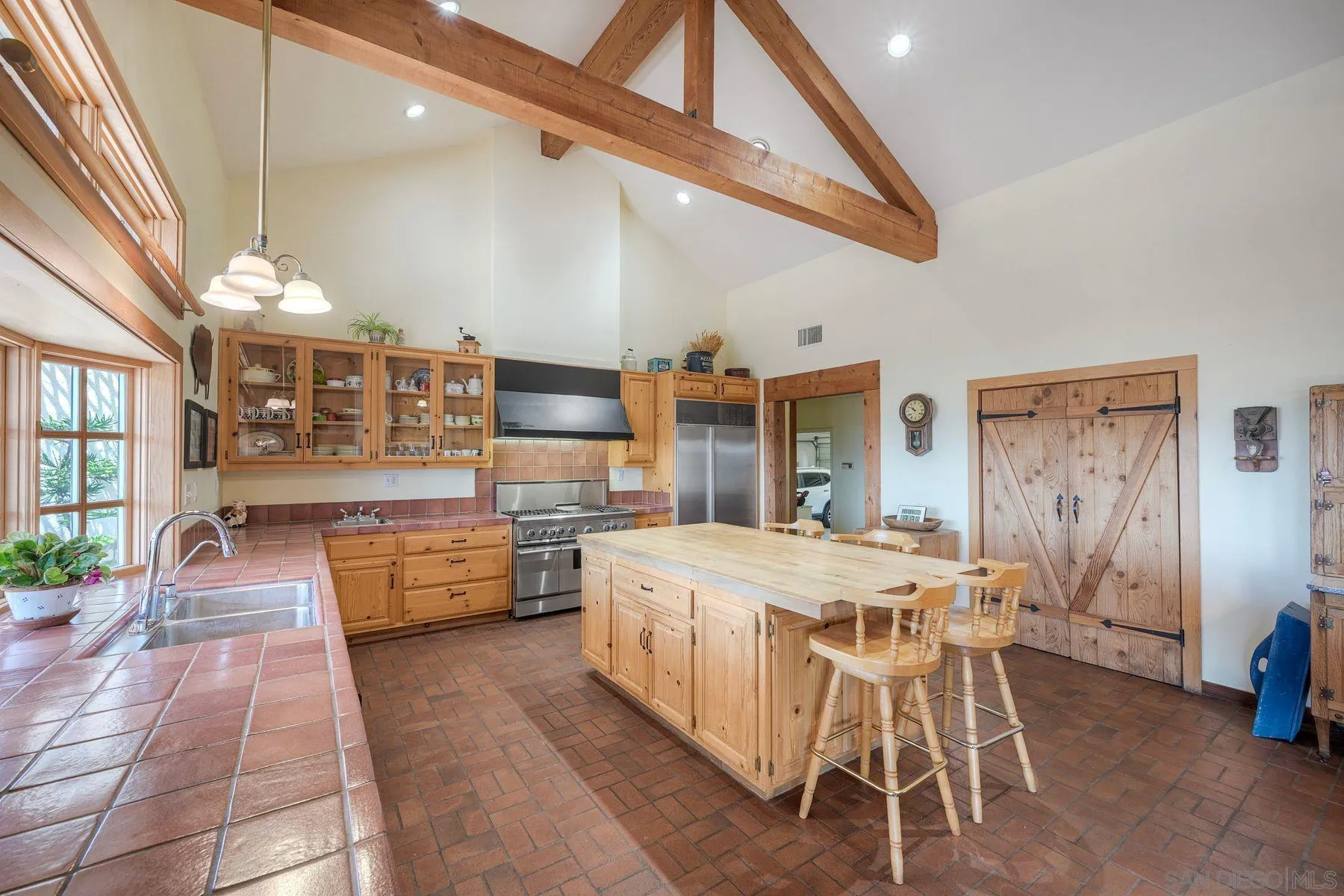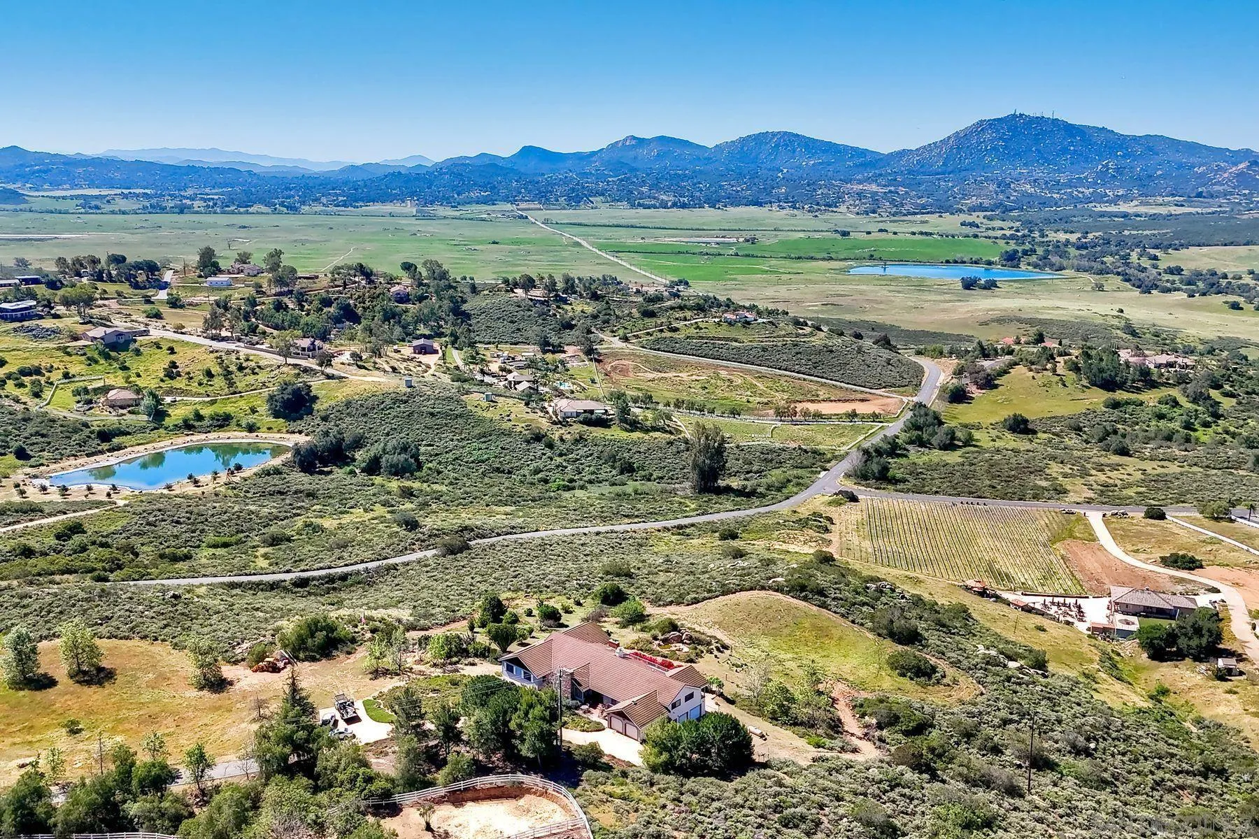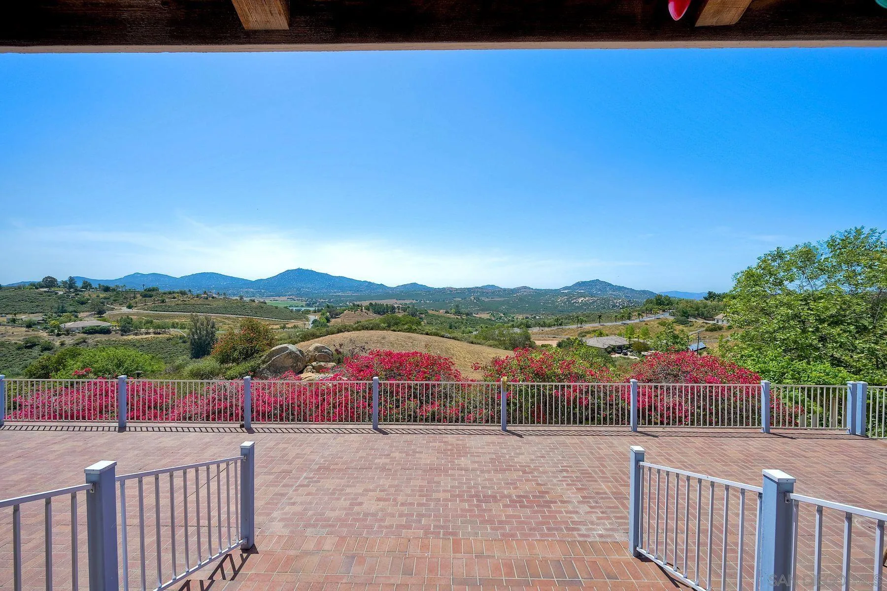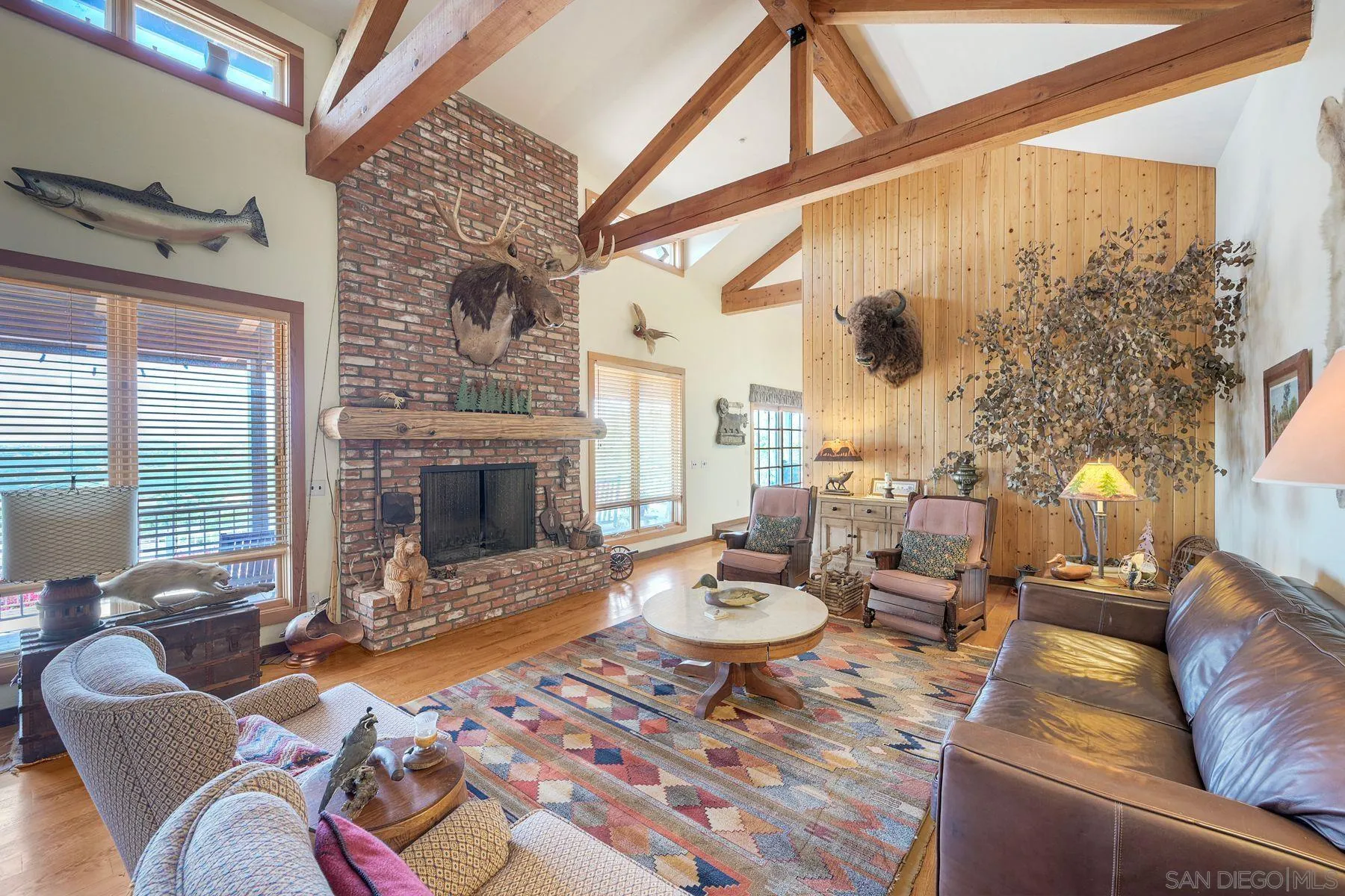 Set behind the gates of Highland Hills Estates on the west end of Ramona within close proximity to Poway rests this custom-built estate situated on 12.29 acres with views that stop you cold the moment you walk through the door. This home offers approximately 4,959 square feet, with 2 bedrooms, an office, a den/loft, and 3.5 baths, every room was designed to live large. Standout features include owned solar, dual AC and furnace systems, a private well, propane, and a walk-in basement round out a property that's as self-sufficient as it is stunning. The living room makes a statement from the start with soaring timber-framed vaulted ceilings, a floor-to-ceiling brick fireplace, and wood-paneled walls that bring the warmth of a mountain lodge to the Southern California countryside. The chef's kitchen is built to match, with its vaulted beamed ceilings, the massive butcher block island, professional-grade range with commercial hood, and terracotta tile floors that ground the whole space. A den/loft just off the kitchen gives you the flex space to make it your own. The primary suite is its own destination. Generous and airy under dramatic vaulted beams, it opens directly to the balcony through sliding glass doors framing mountain views that go on forever. Two walk-in closets, dual vanities, a walk-in shower, and a soaking tub complete the retreat. Outside, a sprawling split-level brick patio stretches across the back of the home, built for sunsets, dinners, entertaining or, if you prefer, doing absolutely nothing. Mature fruit dot the grounds (orange, lemon, grapefruit, avocado).