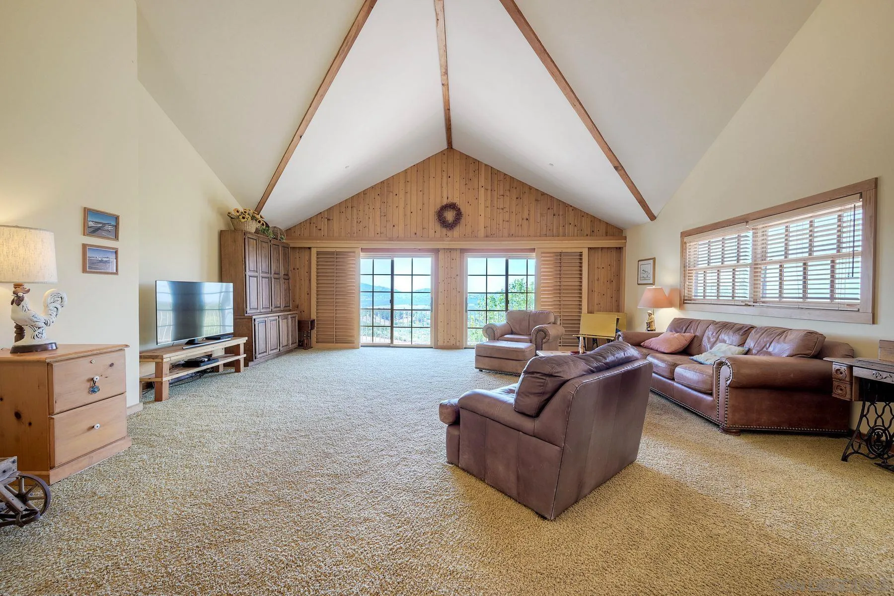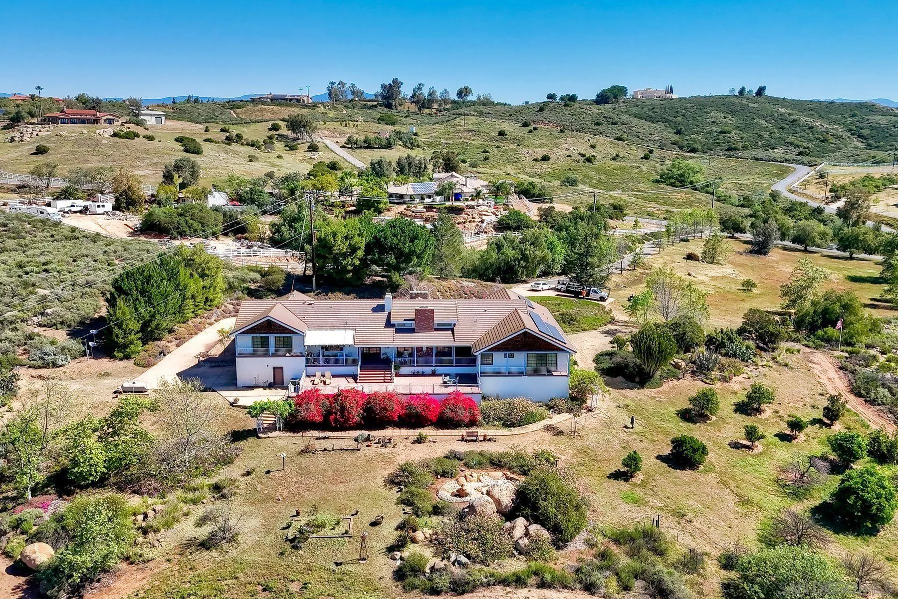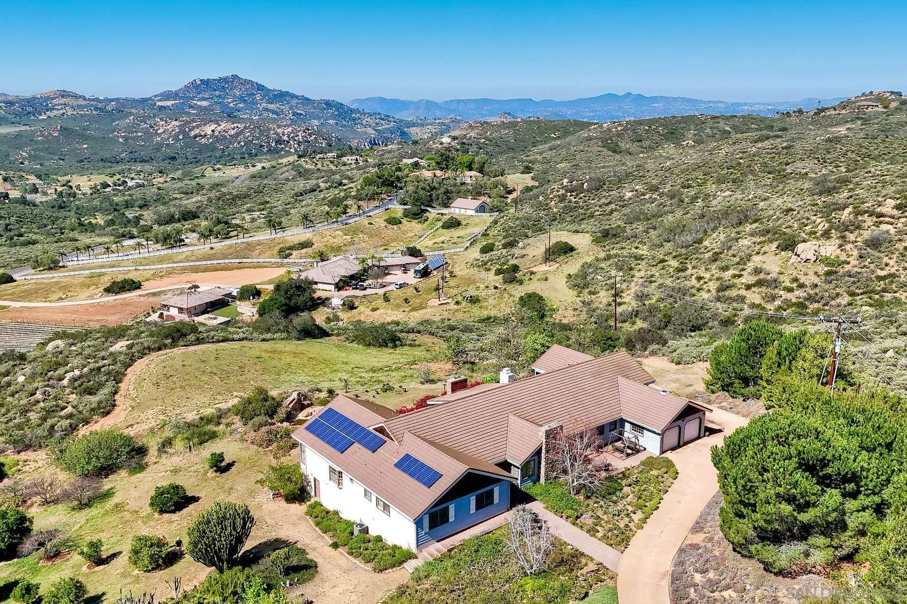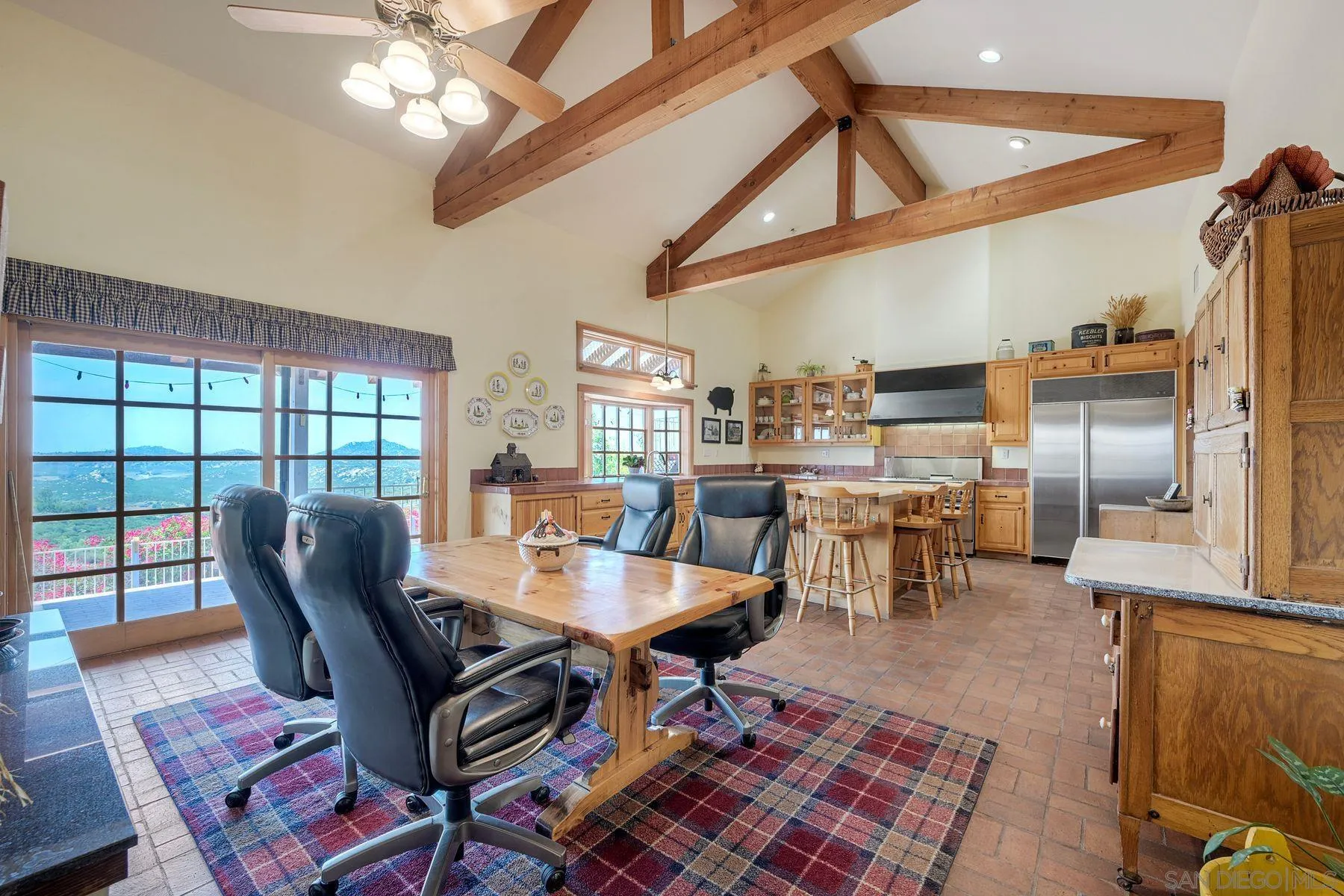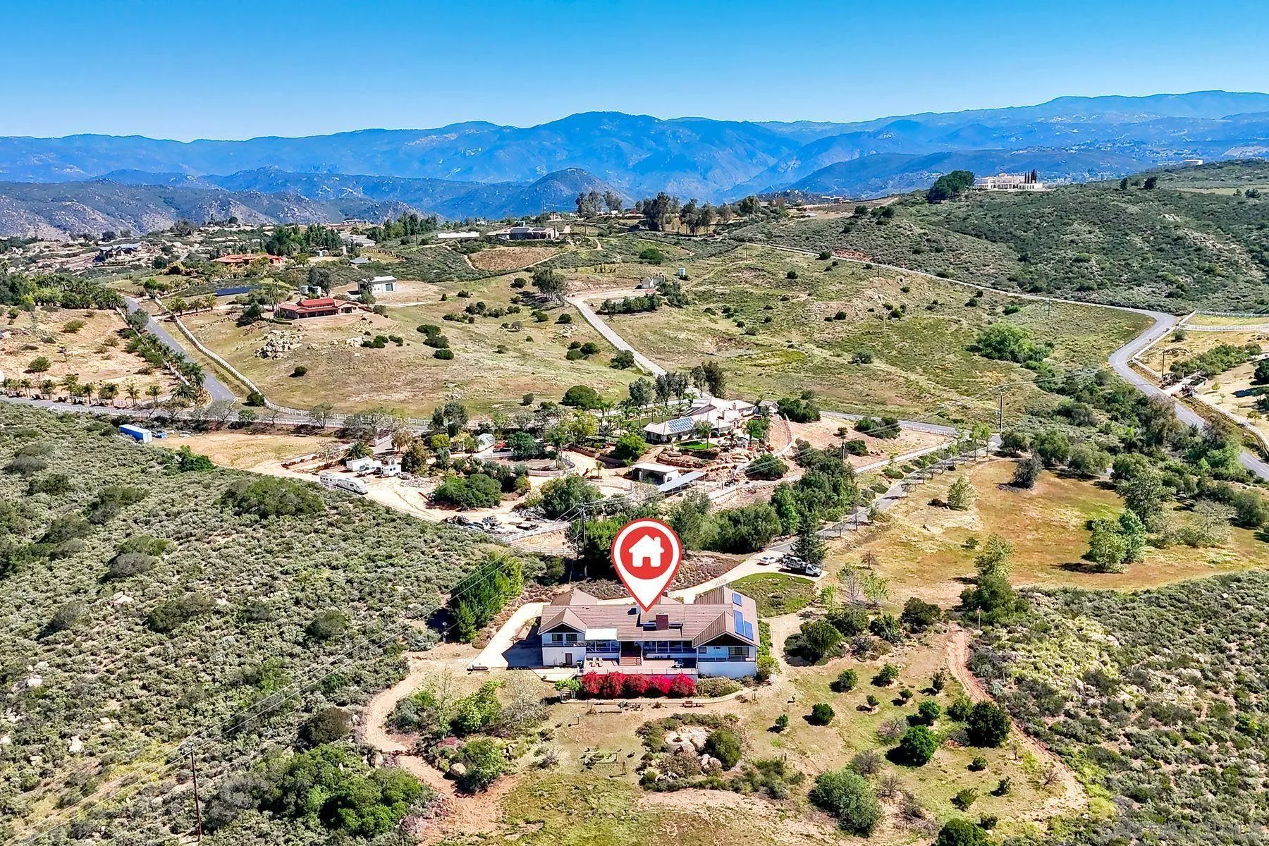 Set behind the gates of Highland Hills Estates on the west end of Ramona within close proximity to Poway rests this custom-built estate situated on 12.29 acres with views that stop you cold the moment you walk through the door. This home offers approximately 4,959 square feet, with 2 bedrooms, an office, a den/loft, and 3.5 baths, every room was designed to live large. Standout features include owned solar, dual AC and furnace systems, a private well, propane, and a walk-in basement round out a property that's as self-sufficient as it is stunning. The living room makes a statement from the start with soaring timber-framed vaulted ceilings, a floor-to-ceiling brick fireplace, and wood-paneled walls that bring the warmth of a mountain lodge to the Southern California countryside. The chef's kitchen is built to match, with its vaulted beamed ceilings, the massive butcher block island, professional-grade range with commercial hood, and terracotta tile floors that ground the whole space. A den/loft just off the kitchen gives you the flex space to make it your own. The primary suite is its own destination. Generous and airy under dramatic vaulted beams, it opens directly to the balcony through sliding glass doors framing mountain views that go on forever. Two walk-in closets, dual vanities, a walk-in shower, and a soaking tub complete the retreat. Outside, a sprawling split-level brick patio stretches across the back of the home, built for sunsets, dinners, entertaining or, if you prefer, doing absolutely nothing. Mature fruit dot the grounds (orange, lemon, grapefruit, avocado).