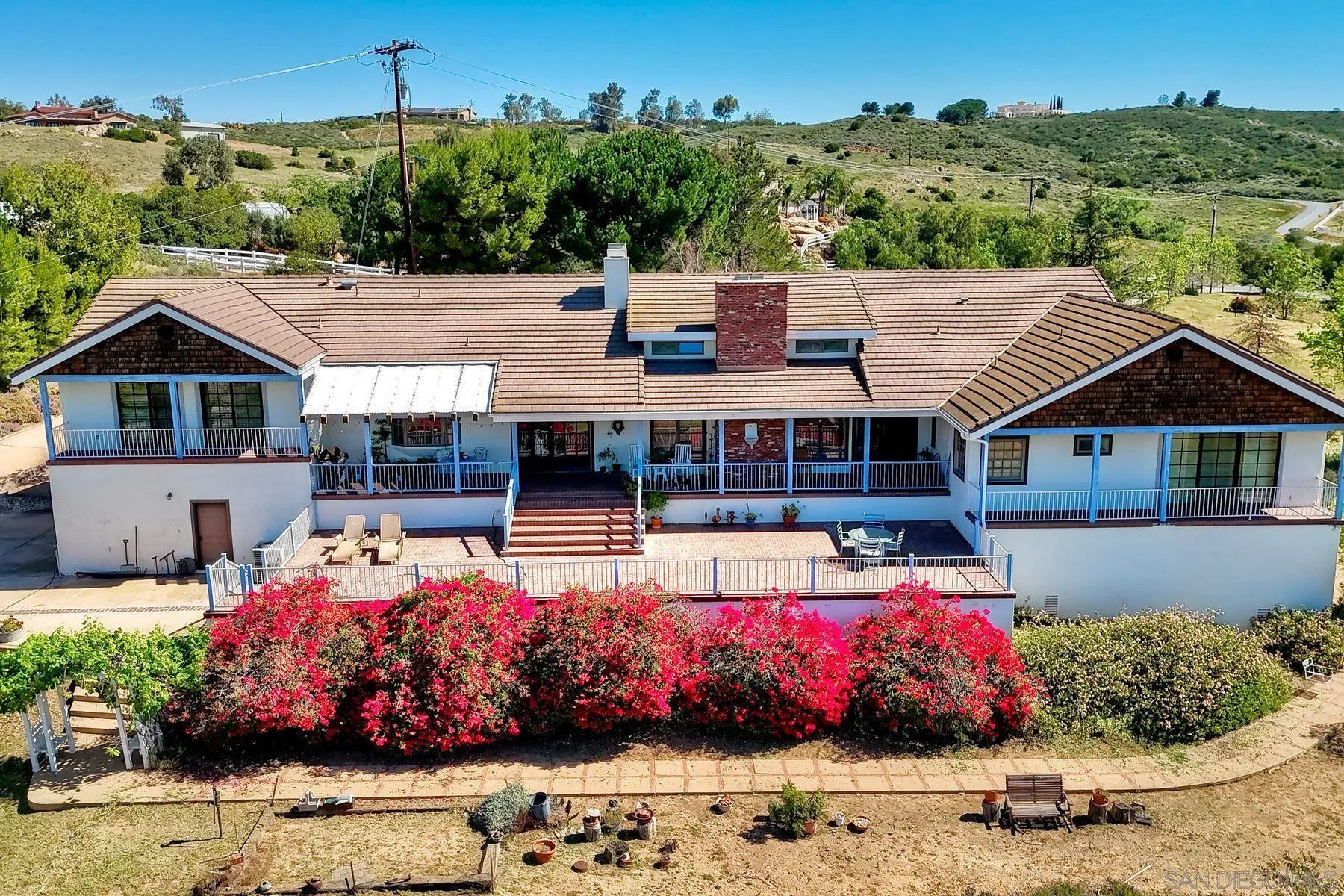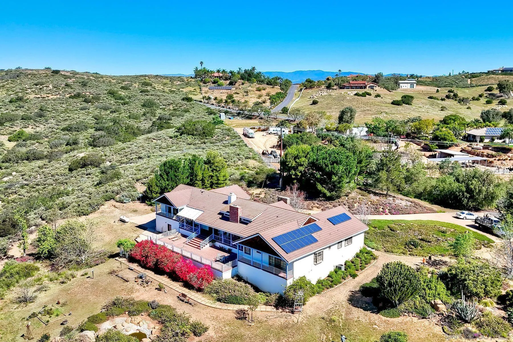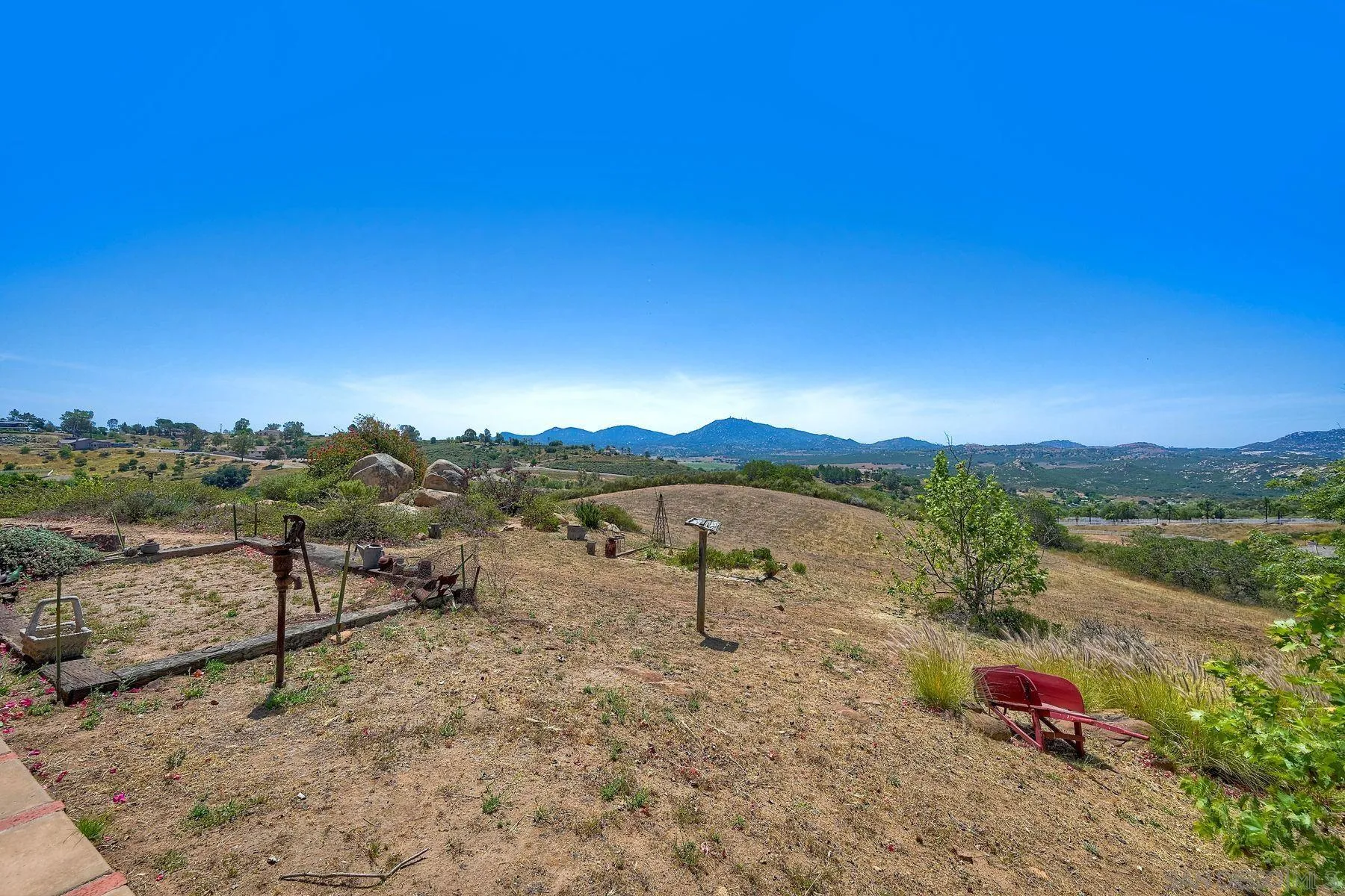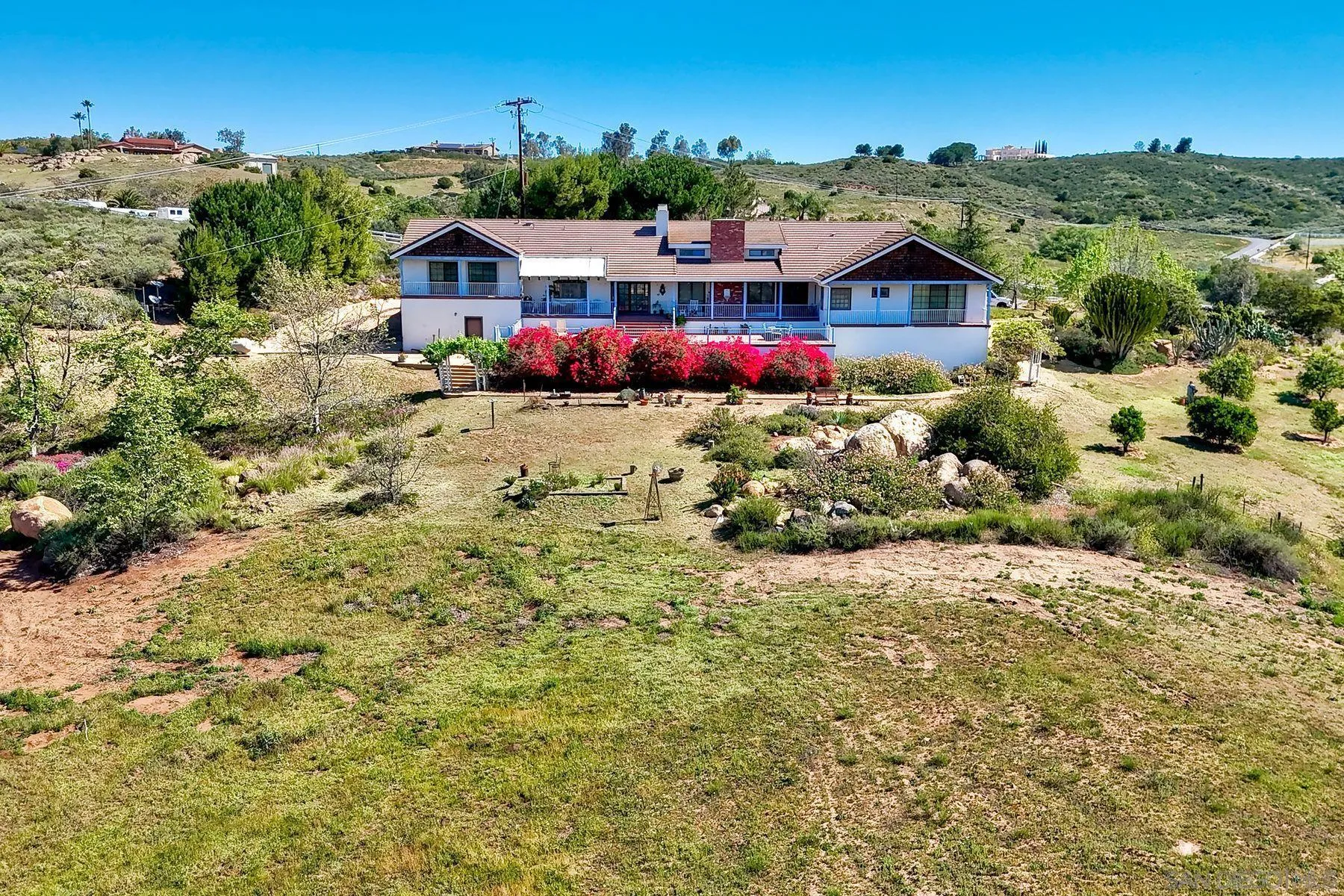 Set behind the gates of Highland Hills Estates on the west end of Ramona within close proximity to Poway rests this custom-built estate situated on 12.29 acres with views that stop you cold the moment you walk through the door. This home offers approximately 4,959 square feet, with 2 bedrooms, an office, a den/loft, and 3.5 baths, every room was designed to live large. Standout features include owned solar, dual AC and furnace systems, a private well, propane, and a walk-in basement round out a property that's as self-sufficient as it is stunning. The living room makes a statement from the start with soaring timber-framed vaulted ceilings, a floor-to-ceiling brick fireplace, and wood-paneled walls that bring the warmth of a mountain lodge to the Southern California countryside. The chef's kitchen is built to match, with its vaulted beamed ceilings, the massive butcher block island, professional-grade range with commercial hood, and terracotta tile floors that ground the whole space. A den/loft just off the kitchen gives you the flex space to make it your own. The primary suite is its own destination. Generous and airy under dramatic vaulted beams, it opens directly to the balcony through sliding glass doors framing mountain views that go on forever. Two walk-in closets, dual vanities, a walk-in shower, and a soaking tub complete the retreat. Outside, a sprawling split-level brick patio stretches across the back of the home, built for sunsets, dinners, entertaining or, if you prefer, doing absolutely nothing. Mature fruit dot the grounds (orange, lemon, grapefruit, avocado).