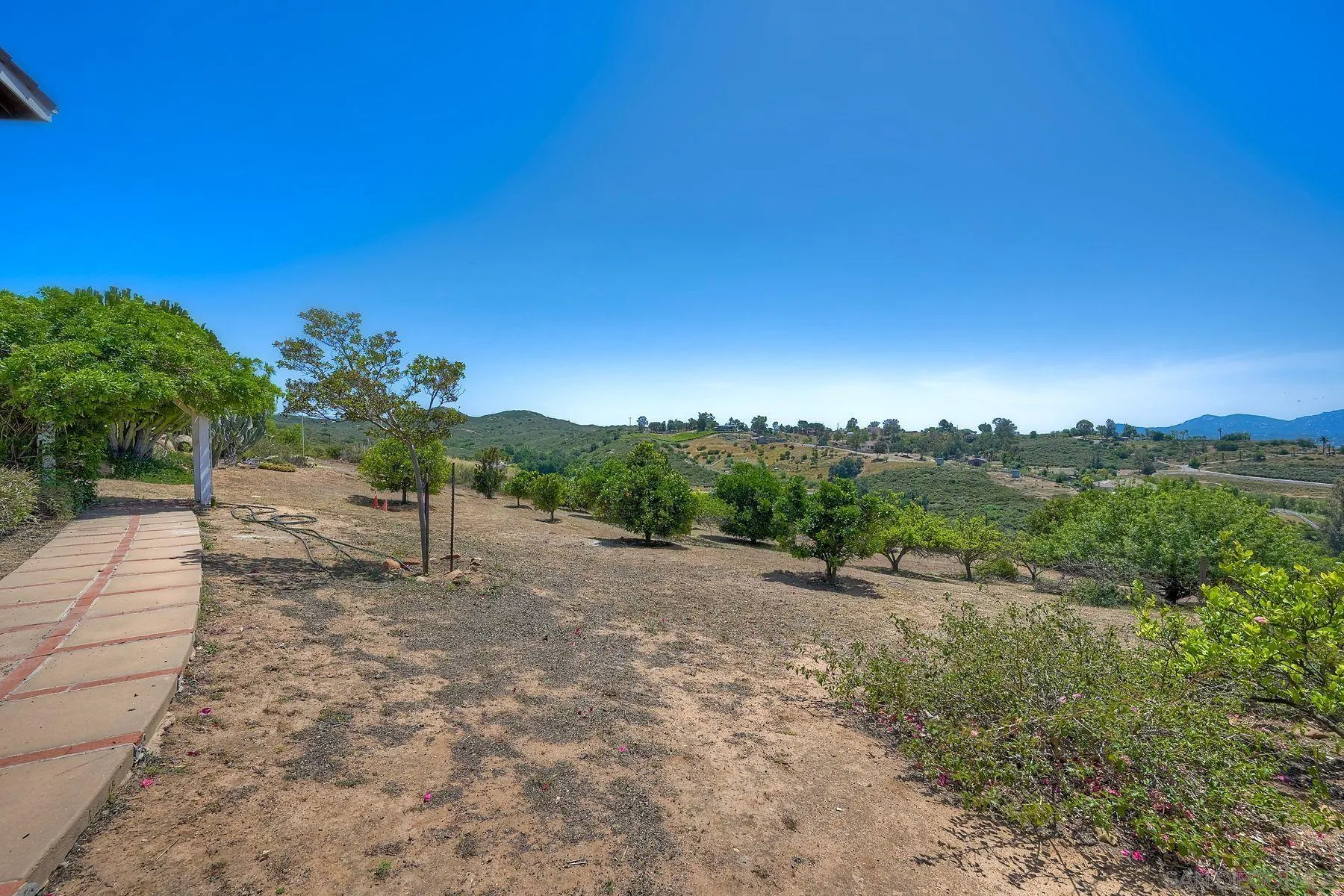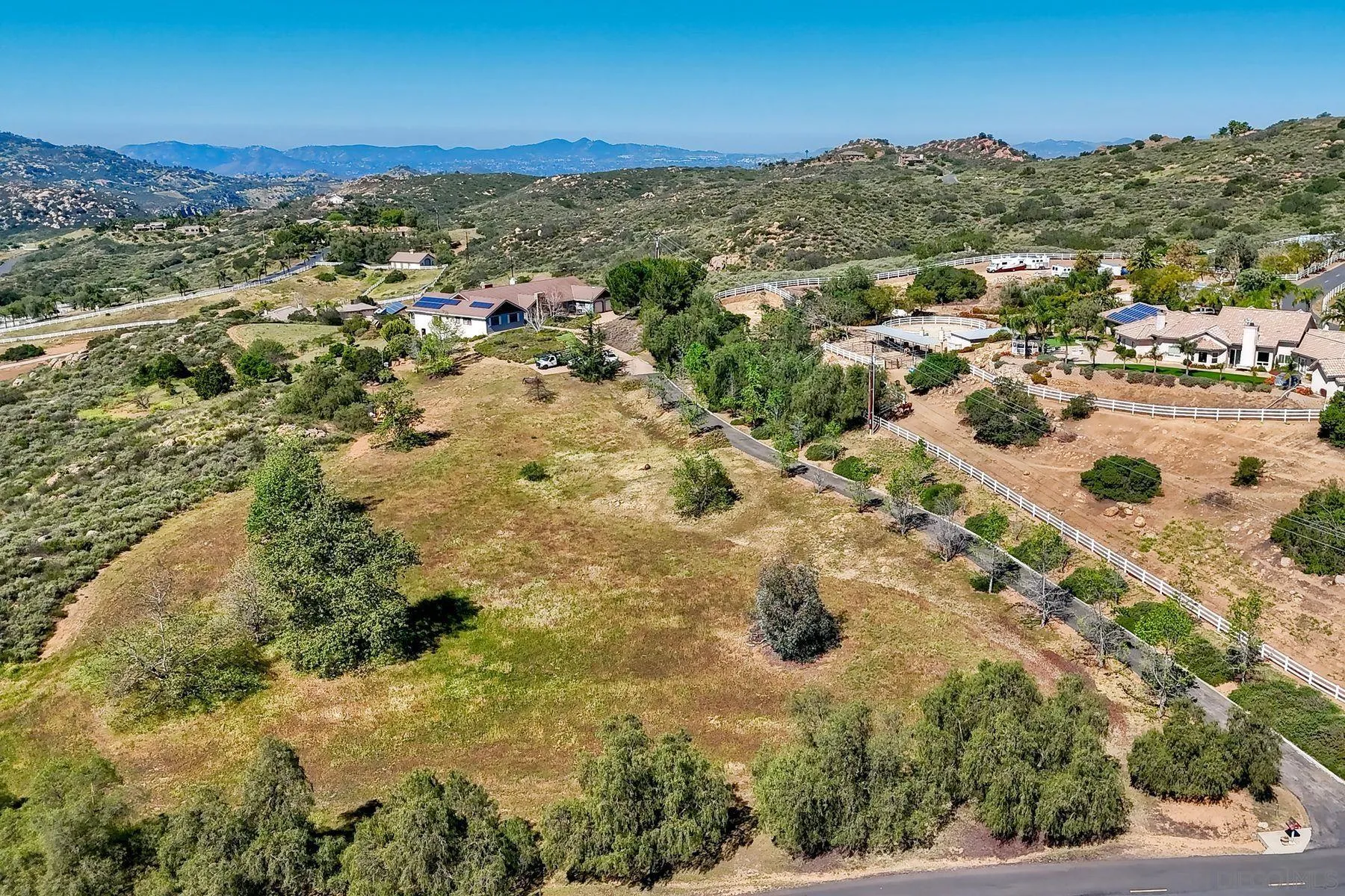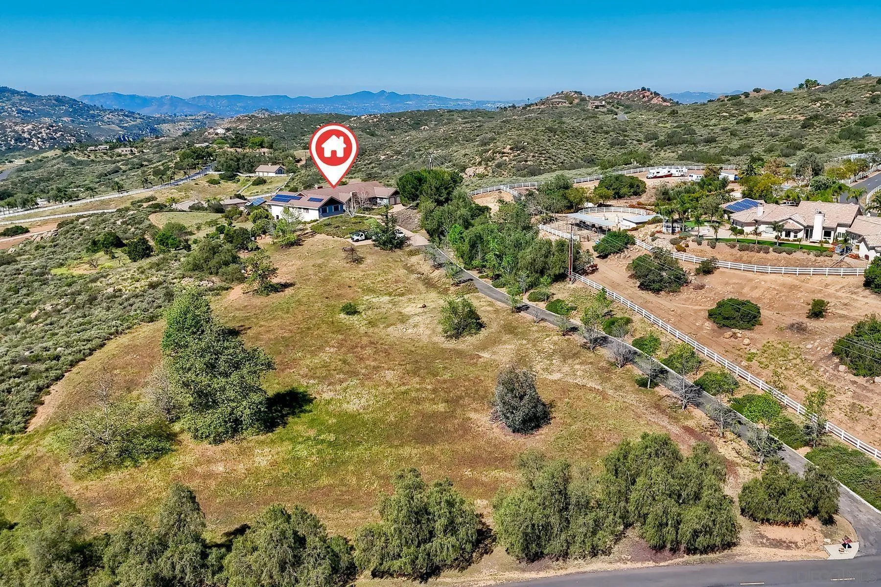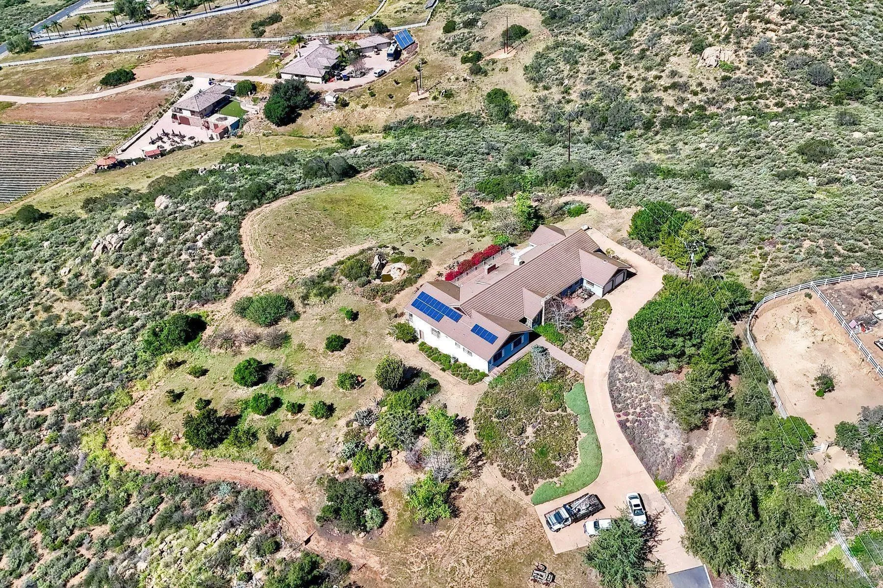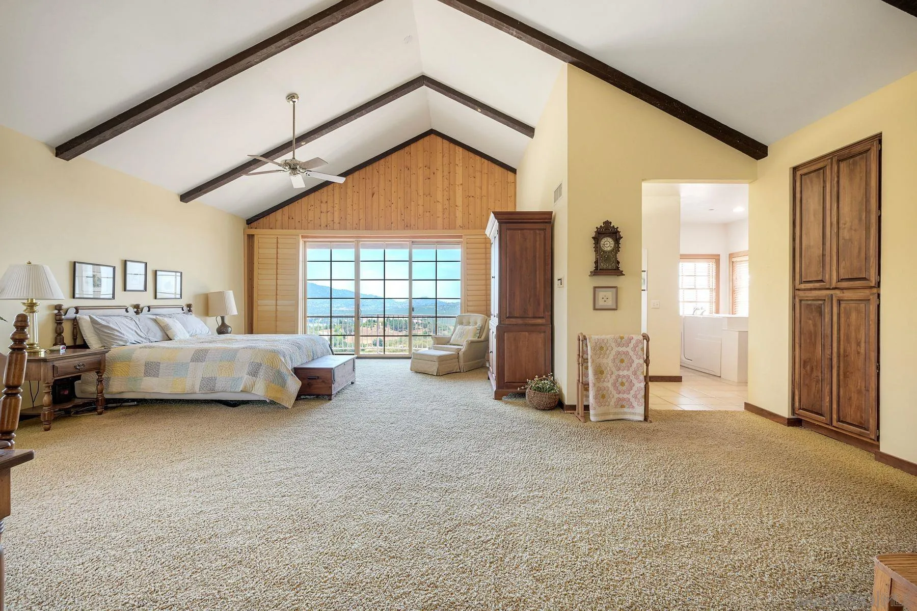 Set behind the gates of Highland Hills Estates on the west end of Ramona within close proximity to Poway rests this custom-built estate situated on 12.29 acres with views that stop you cold the moment you walk through the door. This home offers approximately 4,959 square feet, with 2 bedrooms, an office, a den/loft, and 3.5 baths, every room was designed to live large. Standout features include owned solar, dual AC and furnace systems, a private well, propane, and a walk-in basement round out a property that's as self-sufficient as it is stunning. The living room makes a statement from the start with soaring timber-framed vaulted ceilings, a floor-to-ceiling brick fireplace, and wood-paneled walls that bring the warmth of a mountain lodge to the Southern California countryside. The chef's kitchen is built to match, with its vaulted beamed ceilings, the massive butcher block island, professional-grade range with commercial hood, and terracotta tile floors that ground the whole space. A den/loft just off the kitchen gives you the flex space to make it your own. The primary suite is its own destination. Generous and airy under dramatic vaulted beams, it opens directly to the balcony through sliding glass doors framing mountain views that go on forever. Two walk-in closets, dual vanities, a walk-in shower, and a soaking tub complete the retreat. Outside, a sprawling split-level brick patio stretches across the back of the home, built for sunsets, dinners, entertaining or, if you prefer, doing absolutely nothing. Mature fruit dot the grounds (orange, lemon, grapefruit, avocado).