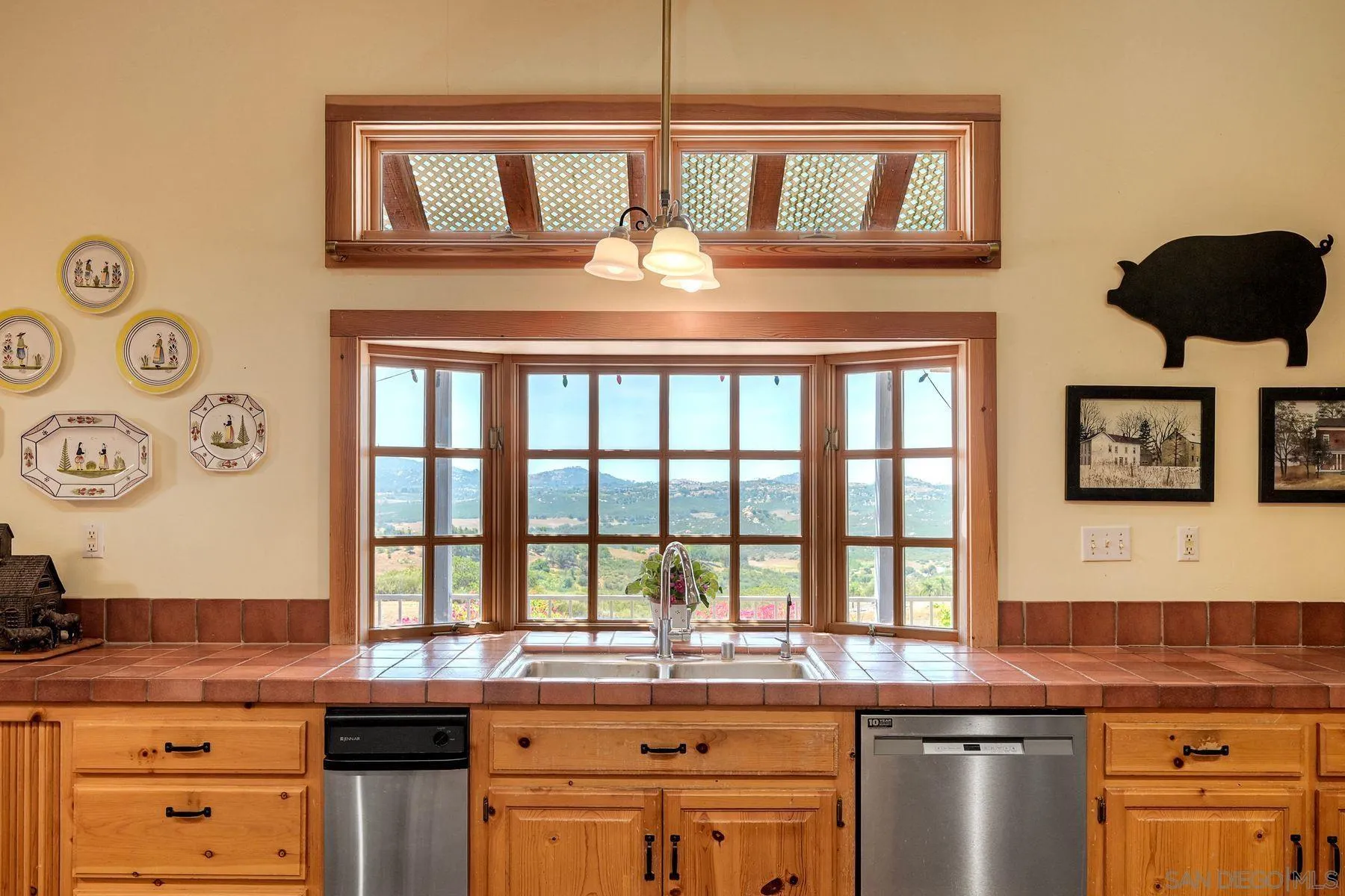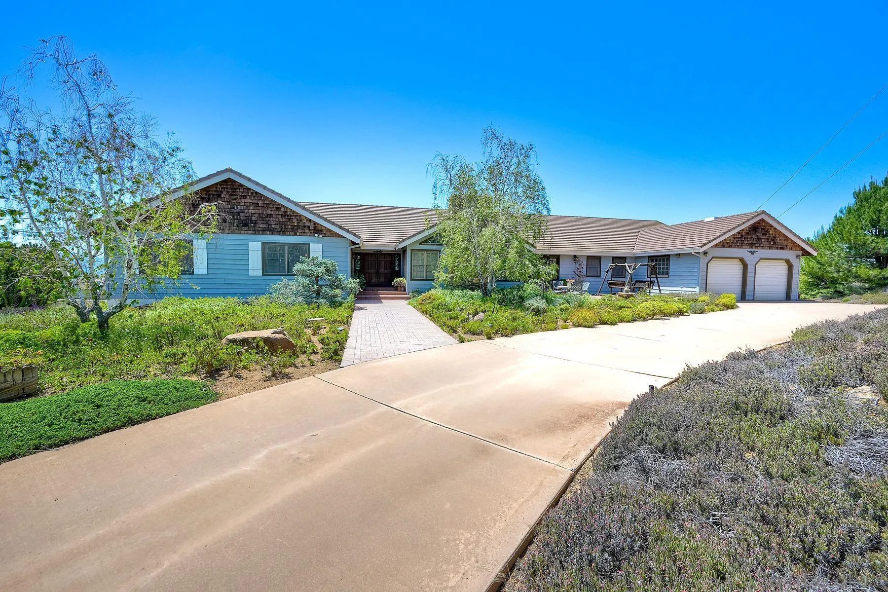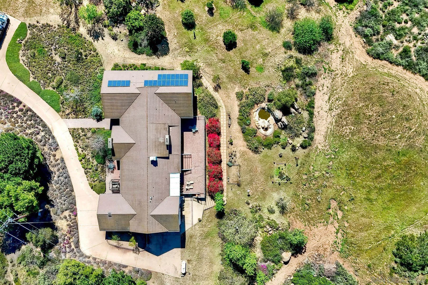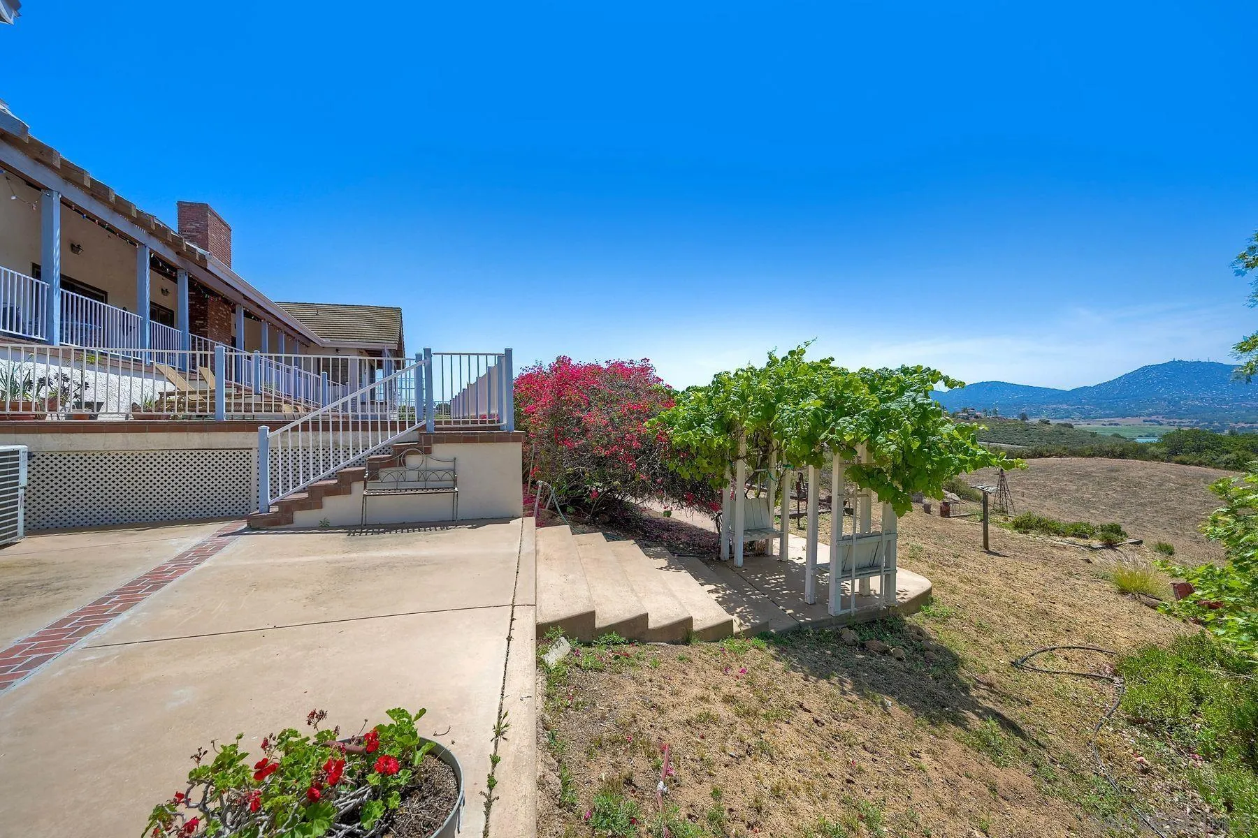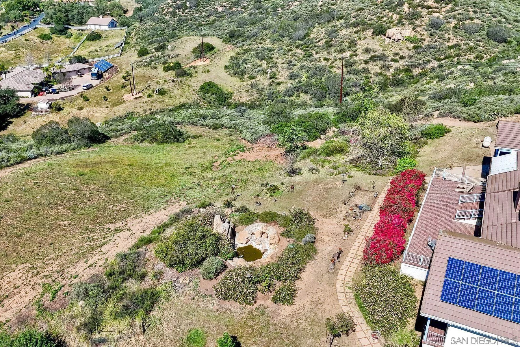 Set behind the gates of Highland Hills Estates on the west end of Ramona within close proximity to Poway rests this custom-built estate situated on 12.29 acres with views that stop you cold the moment you walk through the door. This home offers approximately 4,959 square feet, with 2 bedrooms, an office, a den/loft, and 3.5 baths, every room was designed to live large. Standout features include owned solar, dual AC and furnace systems, a private well, propane, and a walk-in basement round out a property that's as self-sufficient as it is stunning. The living room makes a statement from the start with soaring timber-framed vaulted ceilings, a floor-to-ceiling brick fireplace, and wood-paneled walls that bring the warmth of a mountain lodge to the Southern California countryside. The chef's kitchen is built to match, with its vaulted beamed ceilings, the massive butcher block island, professional-grade range with commercial hood, and terracotta tile floors that ground the whole space. A den/loft just off the kitchen gives you the flex space to make it your own. The primary suite is its own destination. Generous and airy under dramatic vaulted beams, it opens directly to the balcony through sliding glass doors framing mountain views that go on forever. Two walk-in closets, dual vanities, a walk-in shower, and a soaking tub complete the retreat. Outside, a sprawling split-level brick patio stretches across the back of the home, built for sunsets, dinners, entertaining or, if you prefer, doing absolutely nothing. Mature fruit dot the grounds (orange, lemon, grapefruit, avocado).
