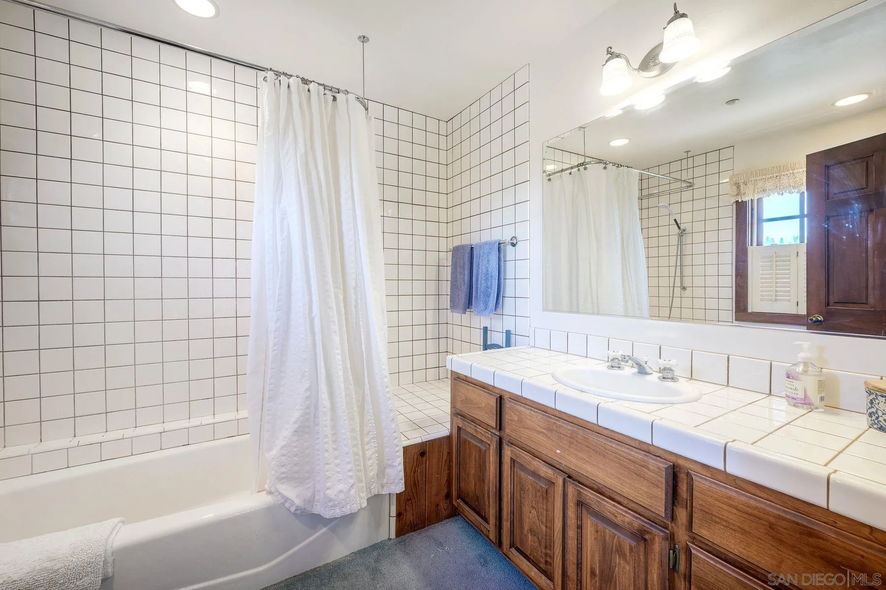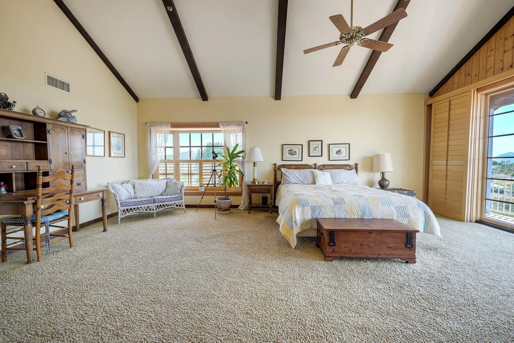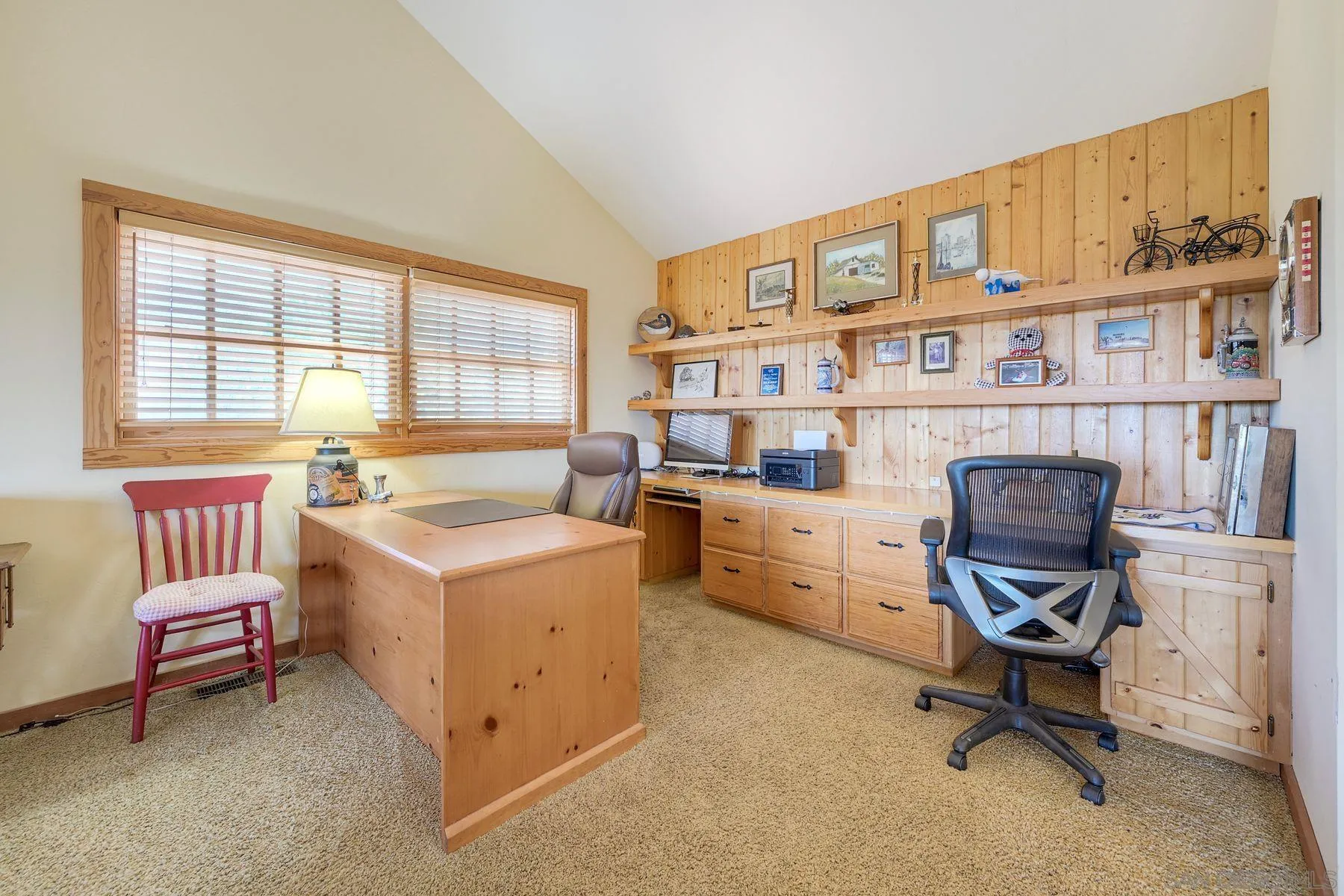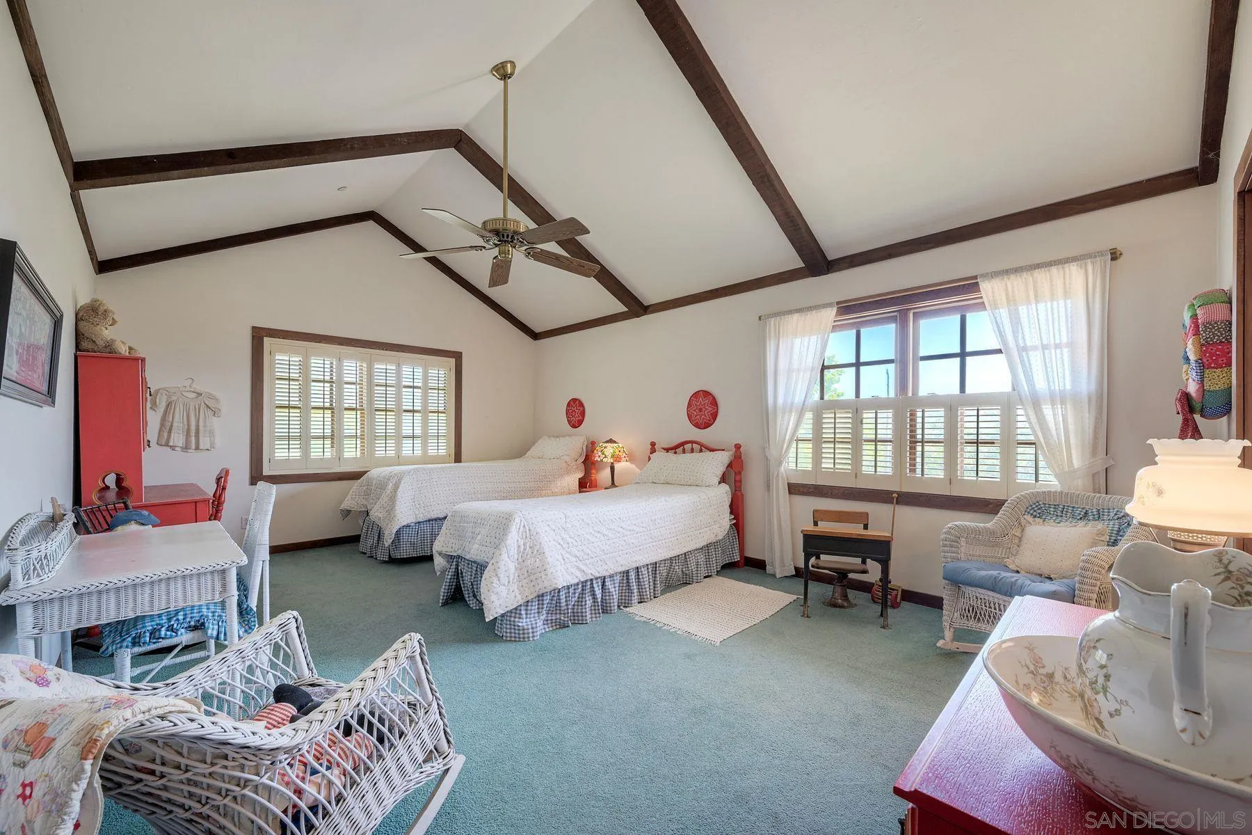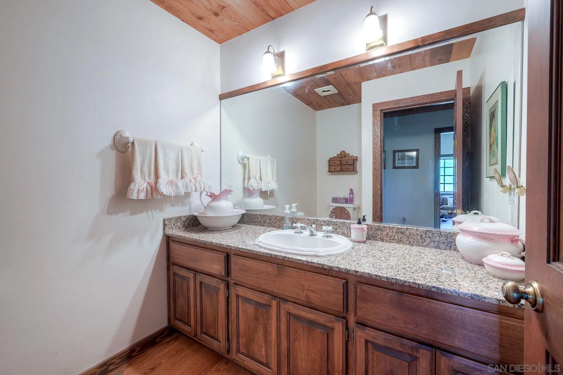 Set behind the gates of Highland Hills Estates on the west end of Ramona within close proximity to Poway rests this custom-built estate situated on 12.29 acres with views that stop you cold the moment you walk through the door. This home offers approximately 4,959 square feet, with 2 bedrooms, an office, a den/loft, and 3.5 baths, every room was designed to live large. Standout features include owned solar, dual AC and furnace systems, a private well, propane, and a walk-in basement round out a property that's as self-sufficient as it is stunning. The living room makes a statement from the start with soaring timber-framed vaulted ceilings, a floor-to-ceiling brick fireplace, and wood-paneled walls that bring the warmth of a mountain lodge to the Southern California countryside. The chef's kitchen is built to match, with its vaulted beamed ceilings, the massive butcher block island, professional-grade range with commercial hood, and terracotta tile floors that ground the whole space. A den/loft just off the kitchen gives you the flex space to make it your own. The primary suite is its own destination. Generous and airy under dramatic vaulted beams, it opens directly to the balcony through sliding glass doors framing mountain views that go on forever. Two walk-in closets, dual vanities, a walk-in shower, and a soaking tub complete the retreat. Outside, a sprawling split-level brick patio stretches across the back of the home, built for sunsets, dinners, entertaining or, if you prefer, doing absolutely nothing. Mature fruit dot the grounds (orange, lemon, grapefruit, avocado).