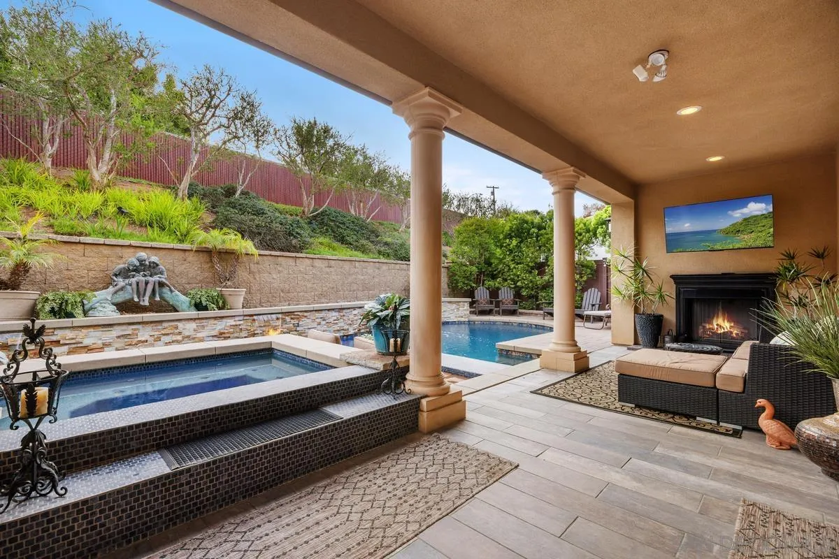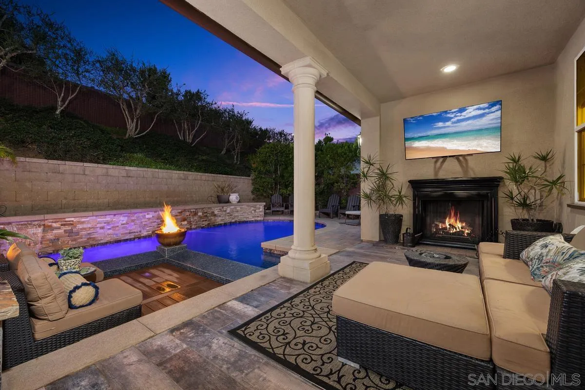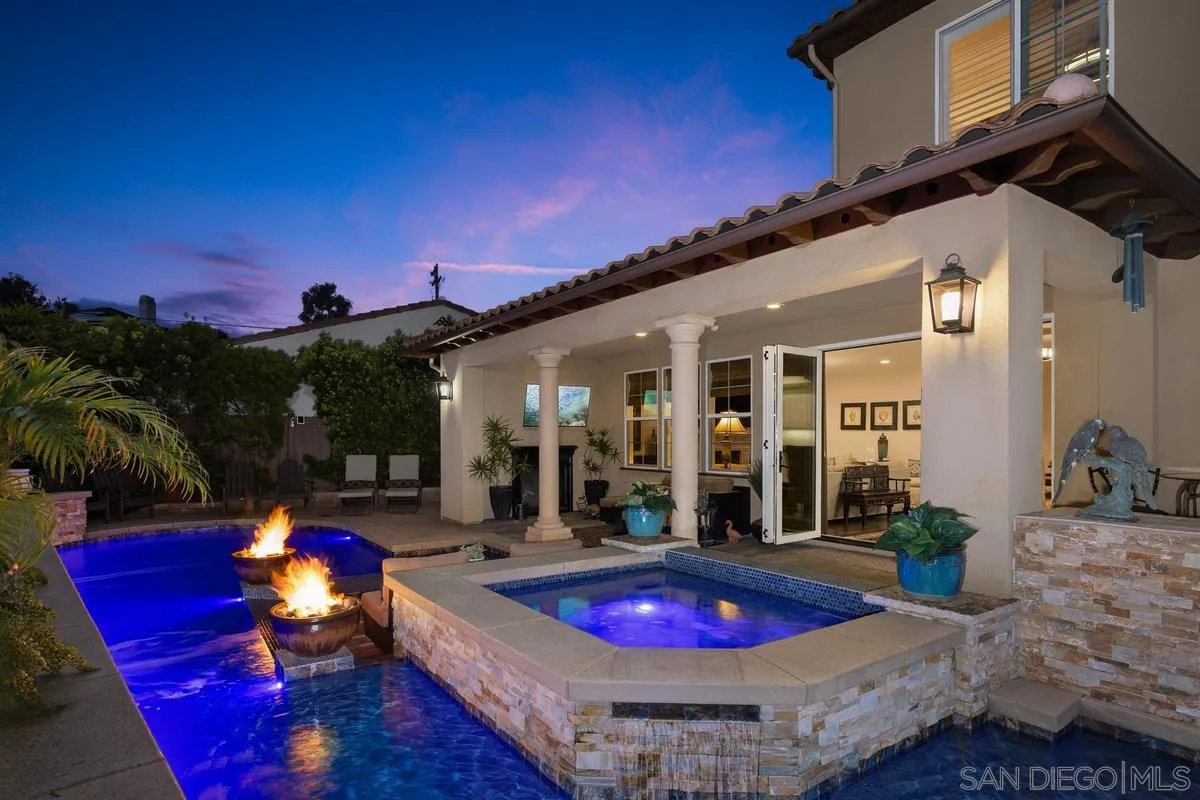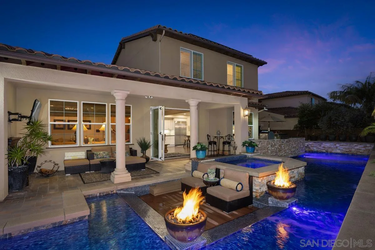 Enjoy relaxed coastal living in this beachside community of Carlsbad West. This very private home features a resort style backyard with a custom pool, lounge area, and jacuzzi. Enjoy the water features and fire boxes from your spa for that perfect zen experience. The stacked dining room door provides a seamless transition whether you are dining indoors or al-fresco. The Chef's kitchen is appointed with abundant storage, stainless steel appliances, built in refrigerator, trash compactor, and a fantastic island for extra seating. The open concept main living areas takes full advantage of the resort feeling of this home. The first floor ensuite bedroom with a walk in closet could be used as a second primary bedroom. The upstairs Primary bedroom with a private balcony and luxurious bathroom create a restful sanctuary. The two additional bedrooms also have walk in closets and share a full bath. The loft area upstairs provides a nice space for reading or just lounging. The laundry room is located directly off the garage and has a utility sink and storage. The garage has a charging station and epoxy flooring. The solar is included and owned. The Buena Vista Reservoir Park is located directly behind this home and has a panoramic ocean view.