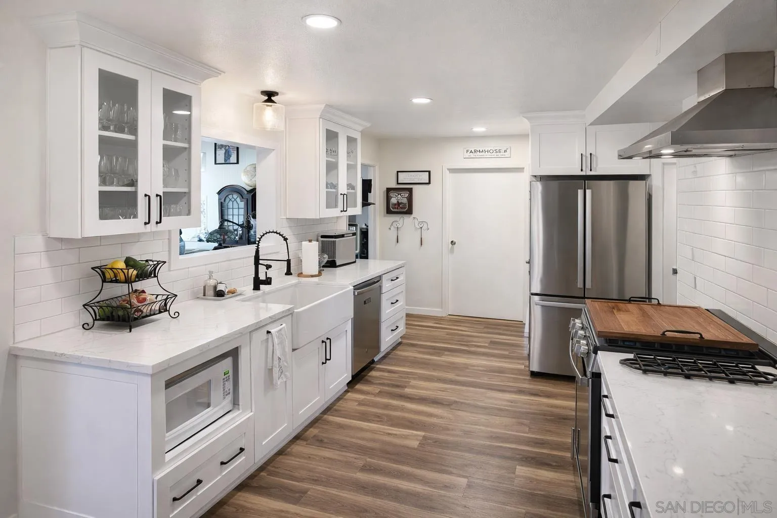 Beautifully remodeled single-story home in one of the most desirable 55+ communities. The expansive kitchen is a true showstopper, featuring white shaker cabinetry, over 23 feet of stunning quartz countertops, 5-burner gas range, brand-new GE stainless steel appliances, making it one of the largest kitchens in the community. A designer subway tile backsplash with elegant marble inlay adds a sophisticated finishing touch, tying the space together with both style and function. Enjoy stylish luxury vinyl plank flooring throughout and a thoughtfully updated interior. The large, finished sunroom offers flexible space and can easily be converted into an optional third bedroom, home office, or hobby room. Situated on a premium cul-de-sac lot with no rear neighbors, this home offers added privacy and peaceful views—one of the most sought after locations in the neighborhood. Energy efficiency is a bonus with a paid-off solar system equipped with a Tesla inverter, along with a reverse osmosis water filtration system. The spacious primary suite features an ensuite bath with a high-end Safe Step walk-in tub for comfort and accessibility. Additional upgrades include fresh exterior paint and a generous backyard filled with mature fruit trees, including orange, grapefruit, fig, peach, and olive. Residents enjoy access to the amenities of the Sun City Civic Association, including pools, a fitness center, clubs, and a variety of social activities—all with low HOA dues and low taxes. Conveniently located near shopping centers, banks, medical offices,
