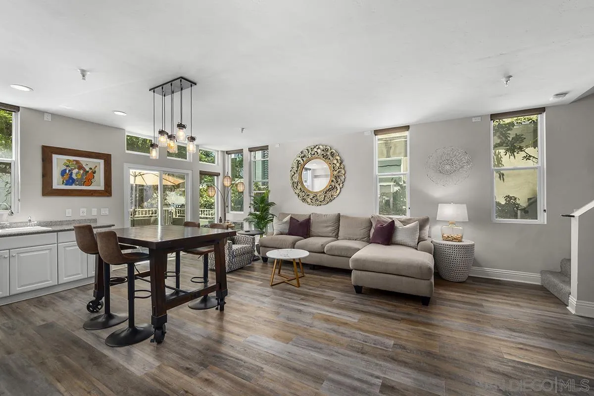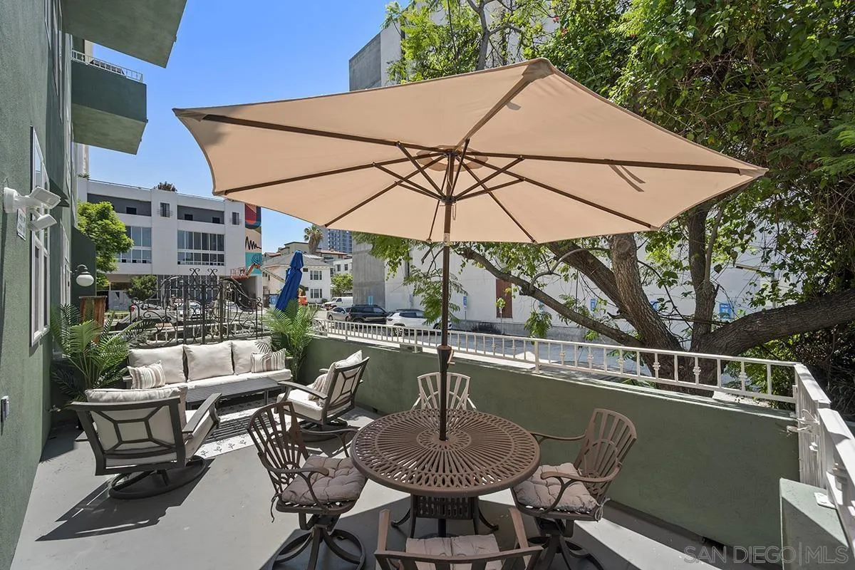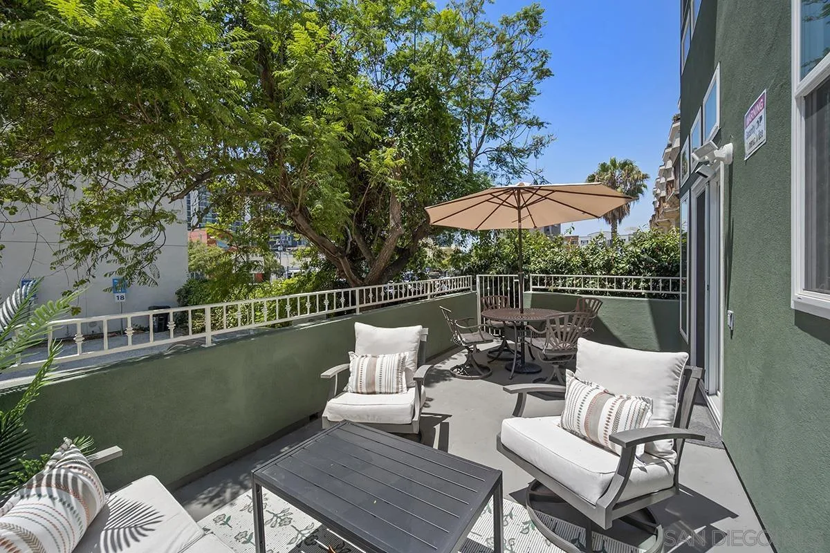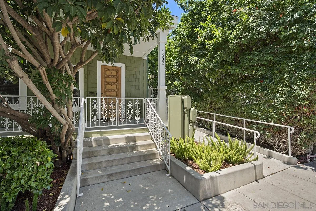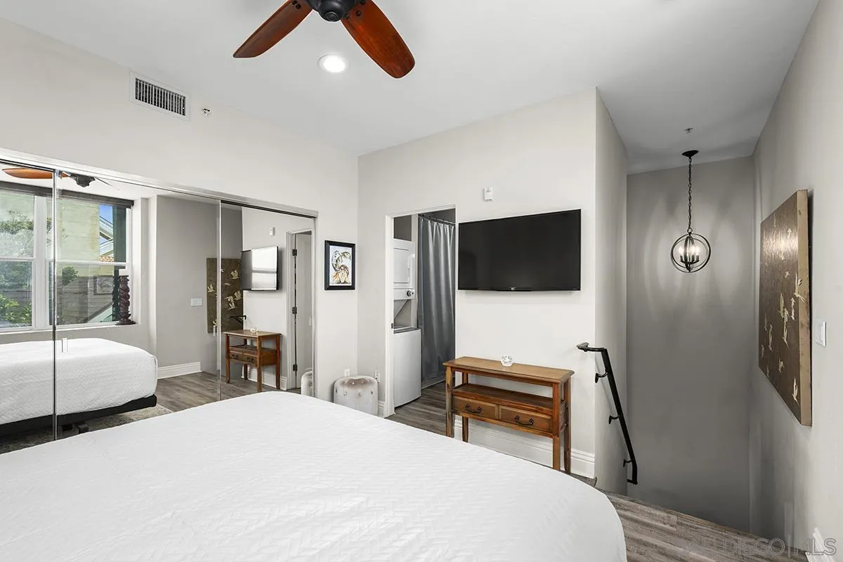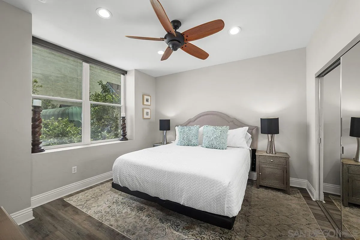 A unique property that offers a rare chance for non-high-rise living downtown, this one-bedroom, one-and-a-half-bathroom unit resides in a charming remodeled Victorian property. The ground floor is a sprawling open concept living-and-dining area that is equally cozy and airy, with comfortable furnishings to sink into and an abundance of windows that provide ample natural light. The room centers on an ultra-plush L-shape sofa and accent chair in front of a sizeable Smart TV, with a convenient corner bar cart nearby for easy access to a refreshing beverage. Off the main living area is a roomy patio shaded by verdant greenery that features an outdoor dining setup with seating for four, and a conversation area complete with a plush loveseat and swivel accents chairs, perfect for entertaining. The upstairs bedroom suite houses a luxurious king-size bed, Smart TV and ample storage space in the form of a multi-door closet that spans an entire wall and comes with built-in shelving. The ensuite bathroom offers a convenient combined shower-and-bathtub, and a thoughtfully updated vanity area with a modern lighted LED mirror.