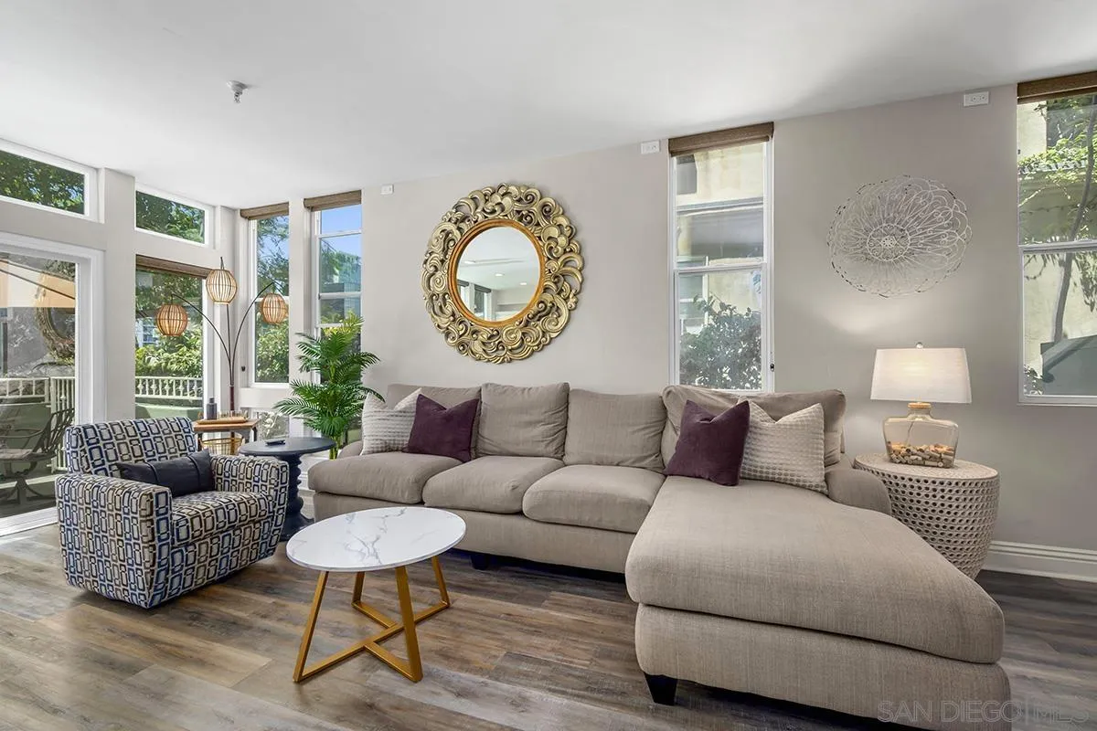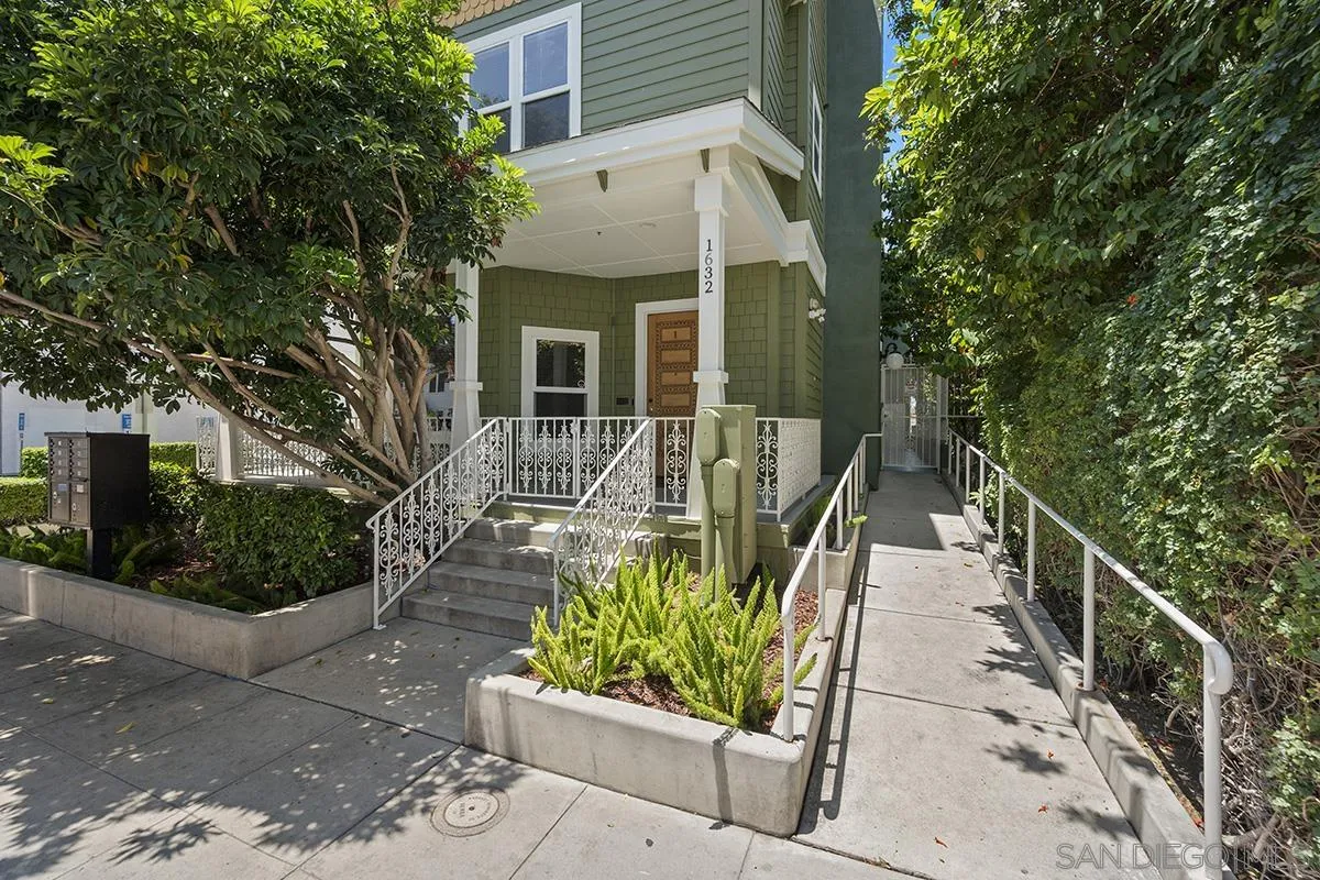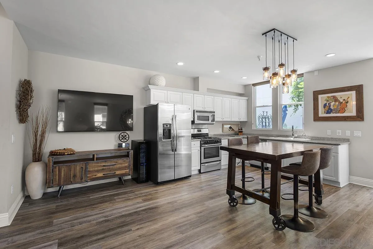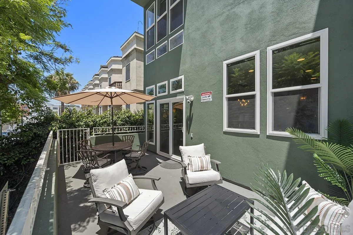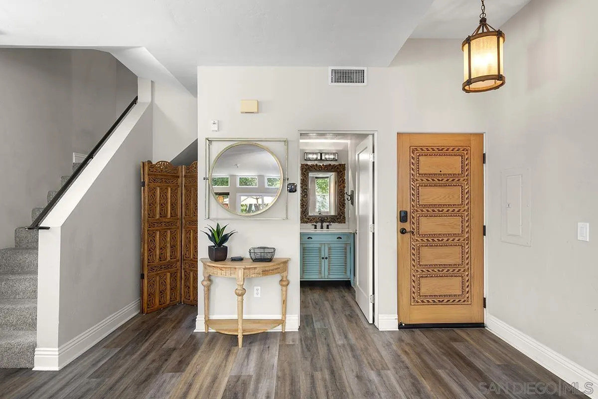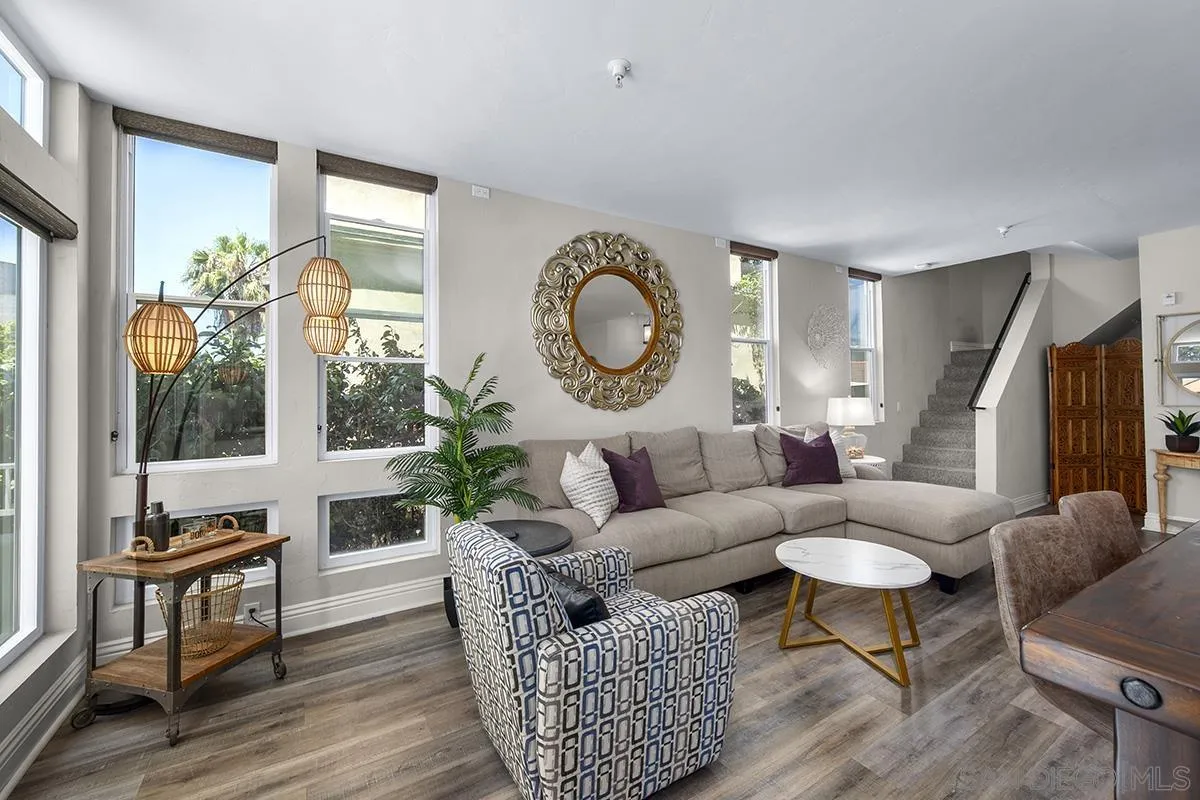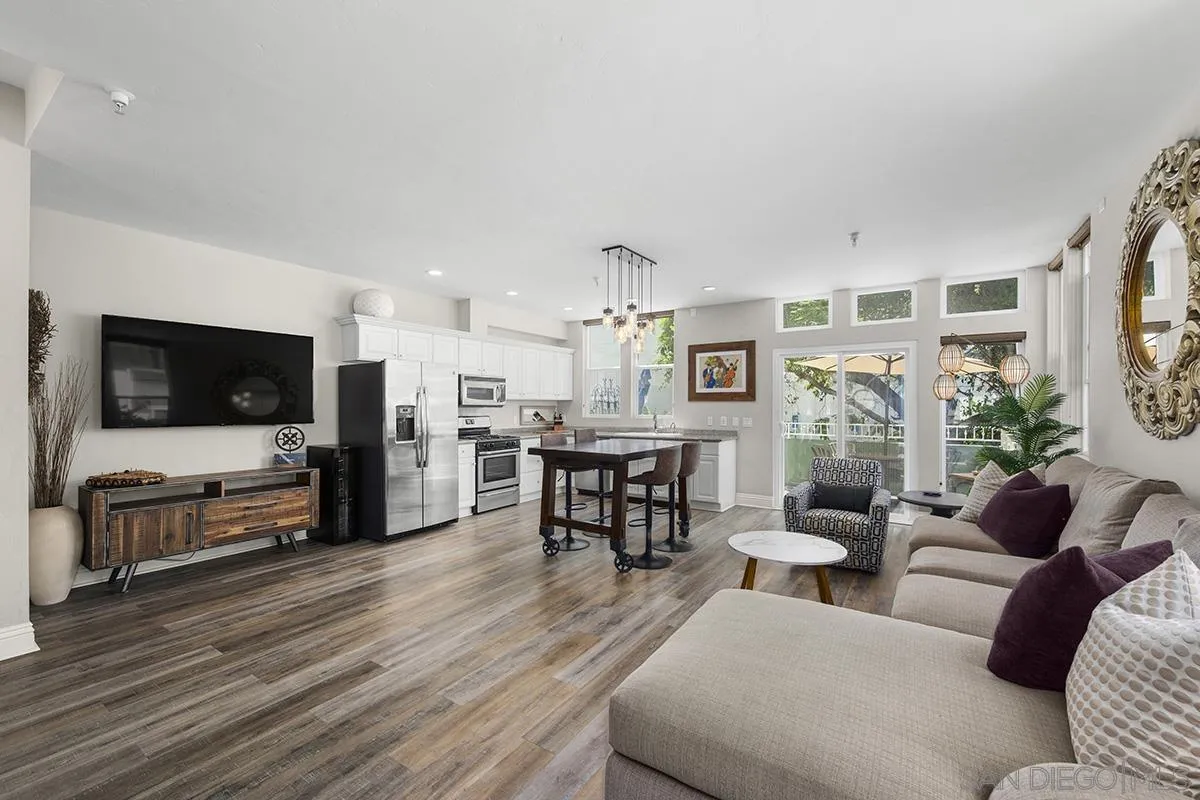 A unique property that offers a rare chance for non-high-rise living downtown, this one-bedroom, one-and-a-half-bathroom unit resides in a charming remodeled Victorian property. The ground floor is a sprawling open concept living-and-dining area that is equally cozy and airy, with comfortable furnishings to sink into and an abundance of windows that provide ample natural light. The room centers on an ultra-plush L-shape sofa and accent chair in front of a sizeable Smart TV, with a convenient corner bar cart nearby for easy access to a refreshing beverage. Off the main living area is a roomy patio shaded by verdant greenery that features an outdoor dining setup with seating for four, and a conversation area complete with a plush loveseat and swivel accents chairs, perfect for entertaining. The upstairs bedroom suite houses a luxurious king-size bed, Smart TV and ample storage space in the form of a multi-door closet that spans an entire wall and comes with built-in shelving. The ensuite bathroom offers a convenient combined shower-and-bathtub, and a thoughtfully updated vanity area with a modern lighted LED mirror.
