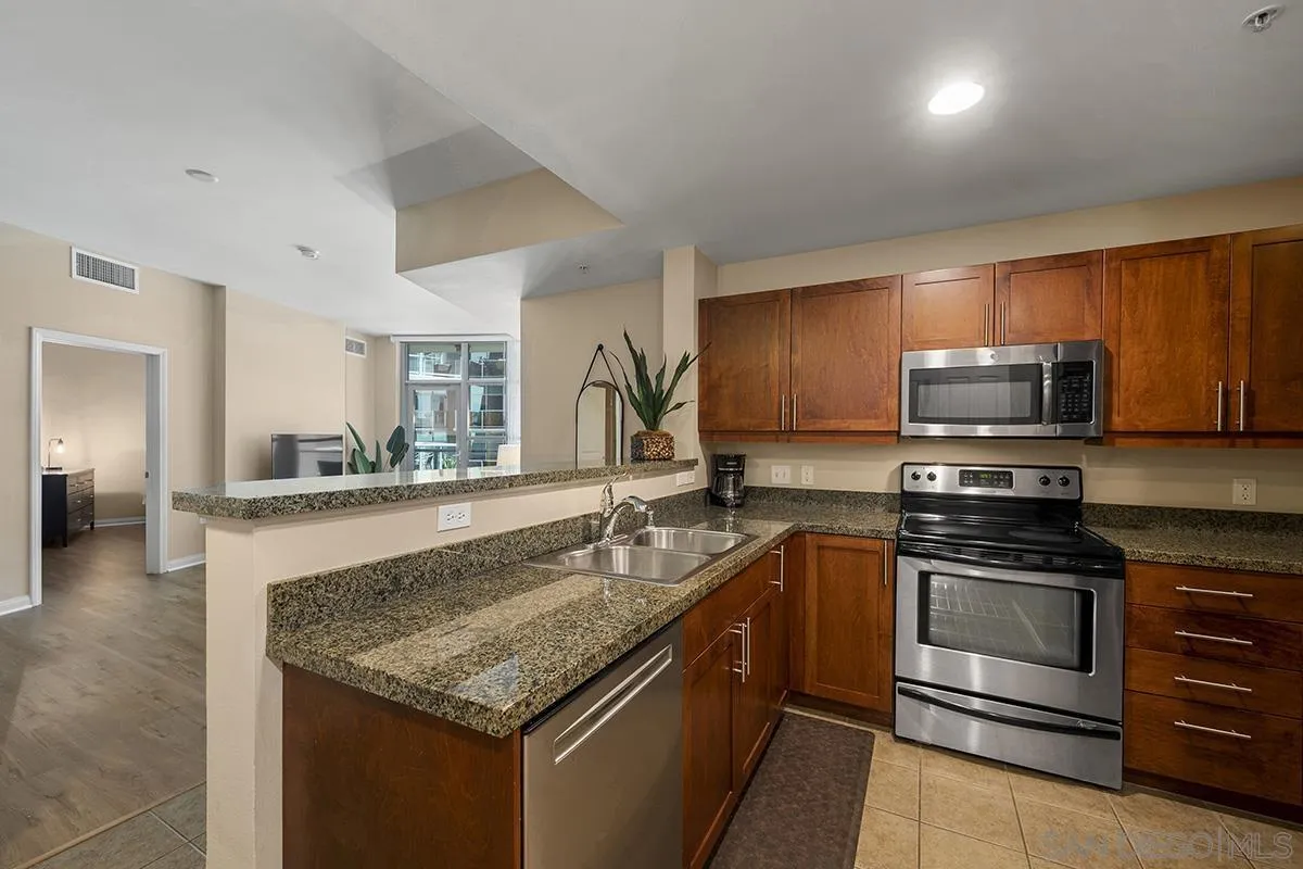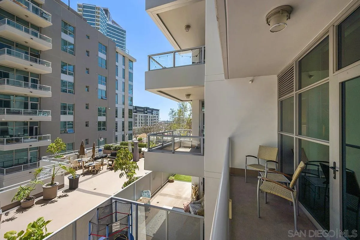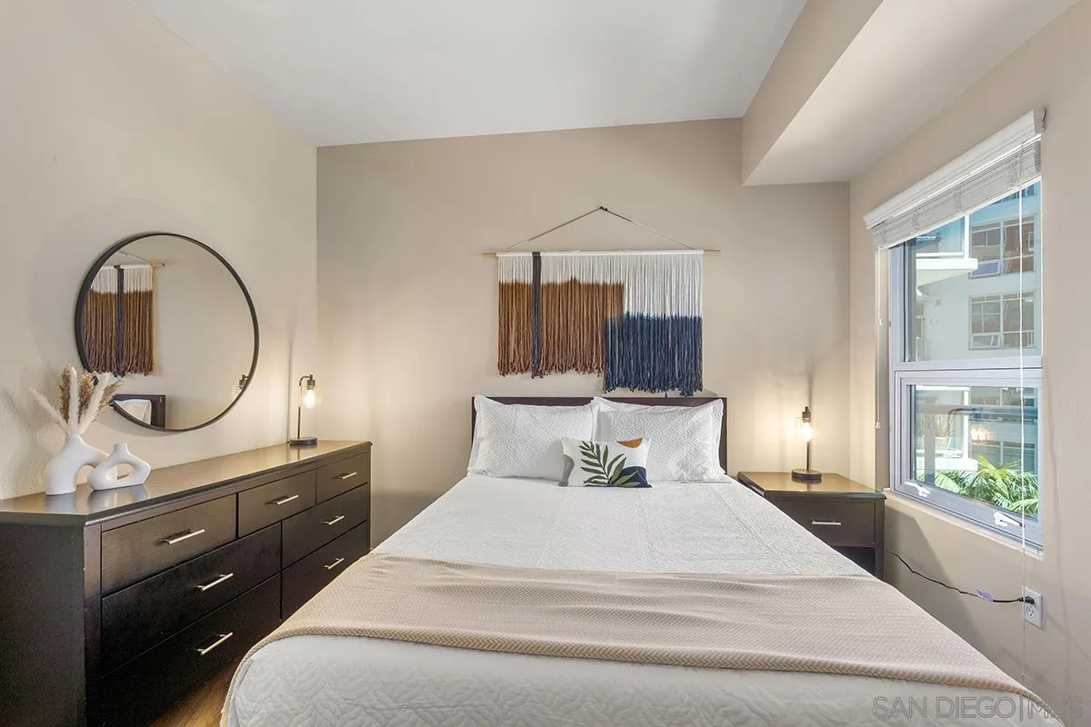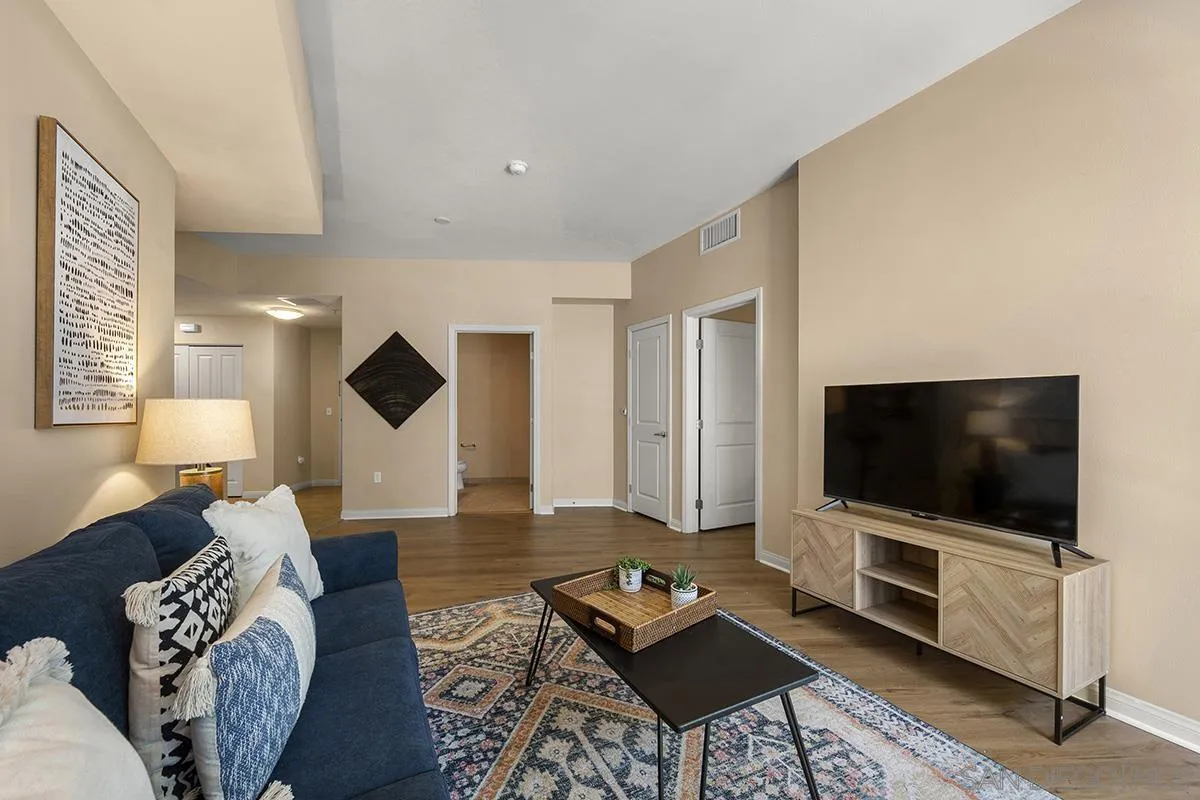 Stylish, relaxing shades of terracotta, navy blue and cream dominate this one-bedroom, one-bathroom unit with an open plan living space that features convenient hard flooring throughout. The living room area boasts a plush sofa, perfect for kicking back on at the end of a long day to watch something on the large Smart TV. Off of this space sliding glass doors lead to a balcony, complete with seating, overlooking the manicured, tranquil courtyard below. A comfortable queen size bed is the center of the bedroom, which also benefits from a spacious three-door closet and plenty of alternative storage space as well, with an additional large dresser on offer.