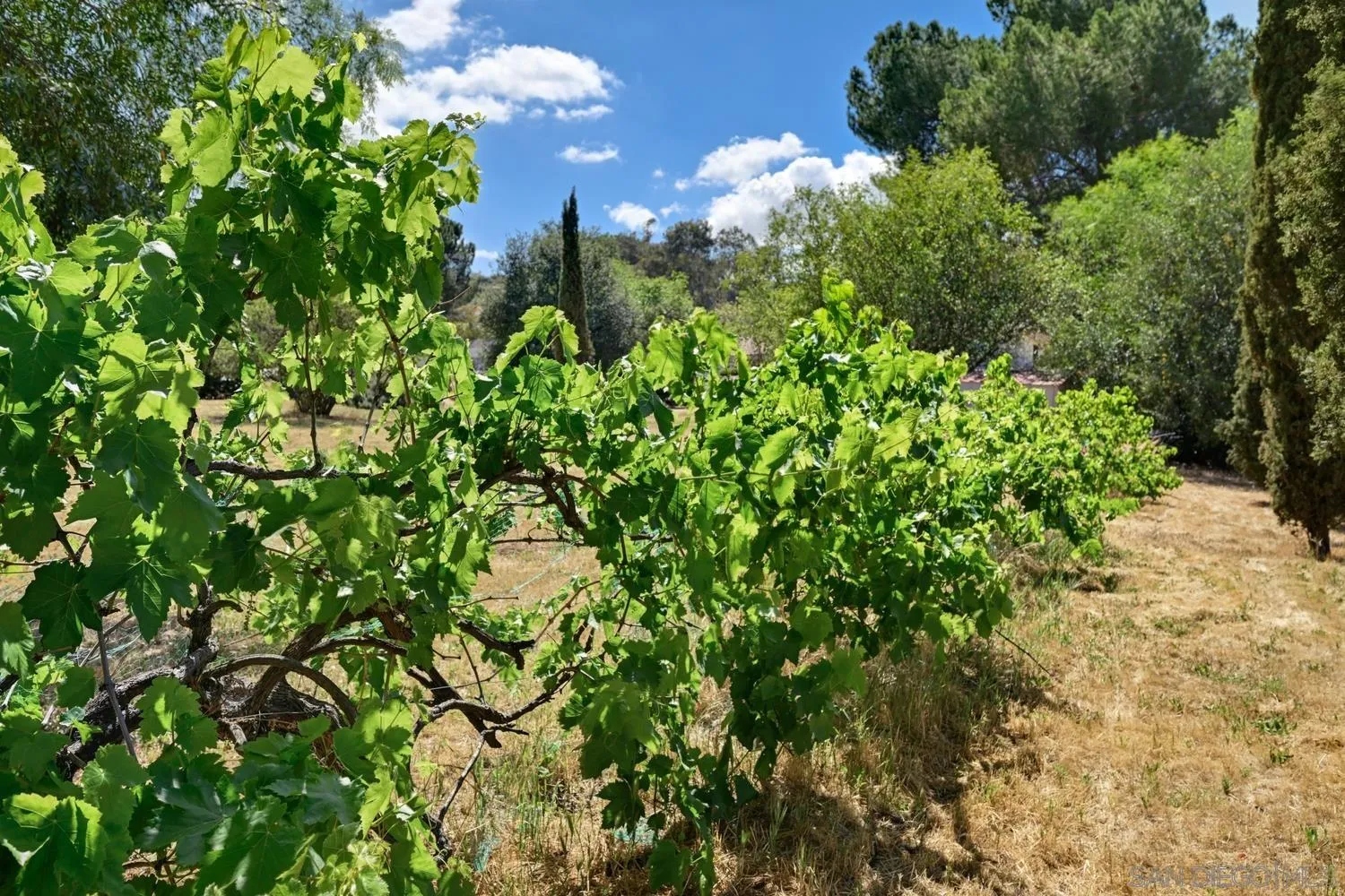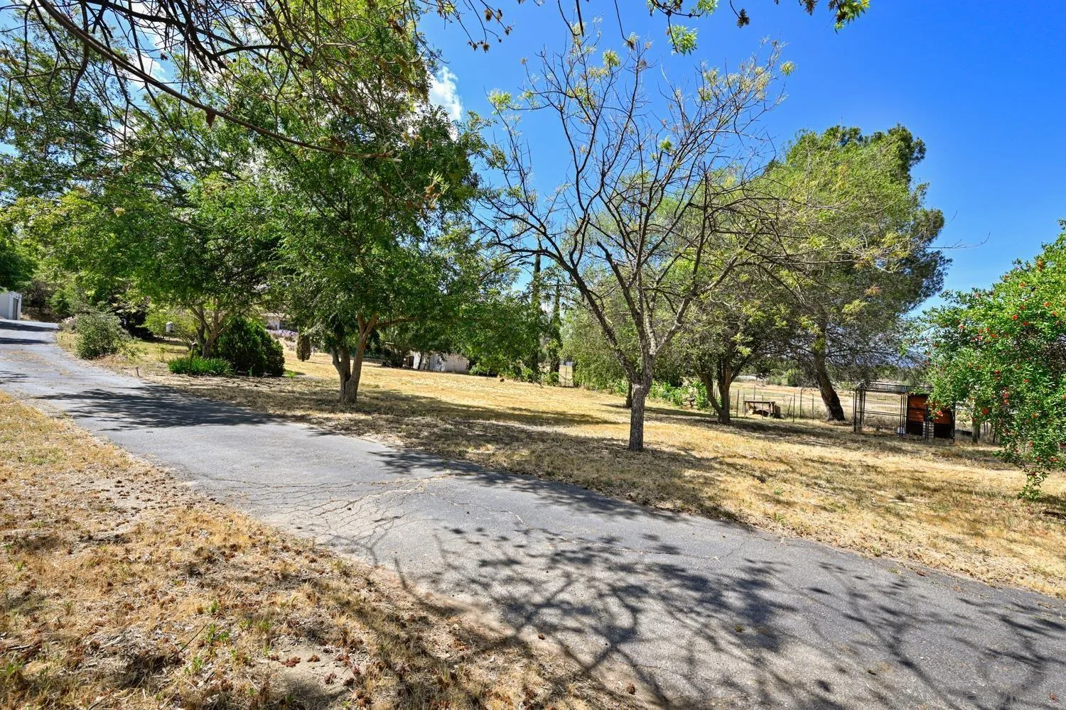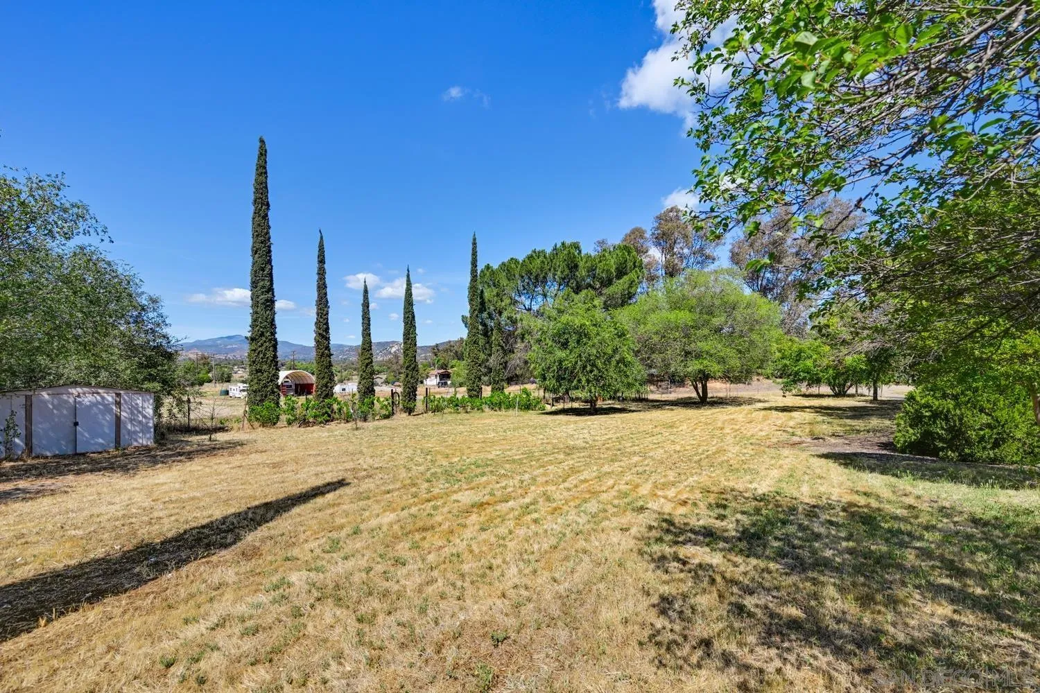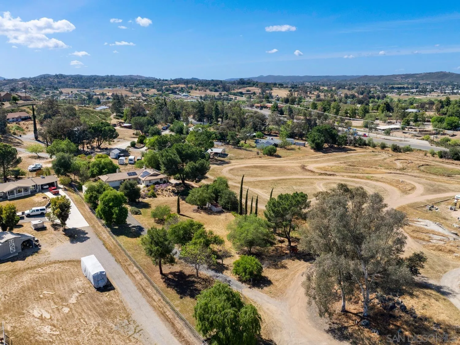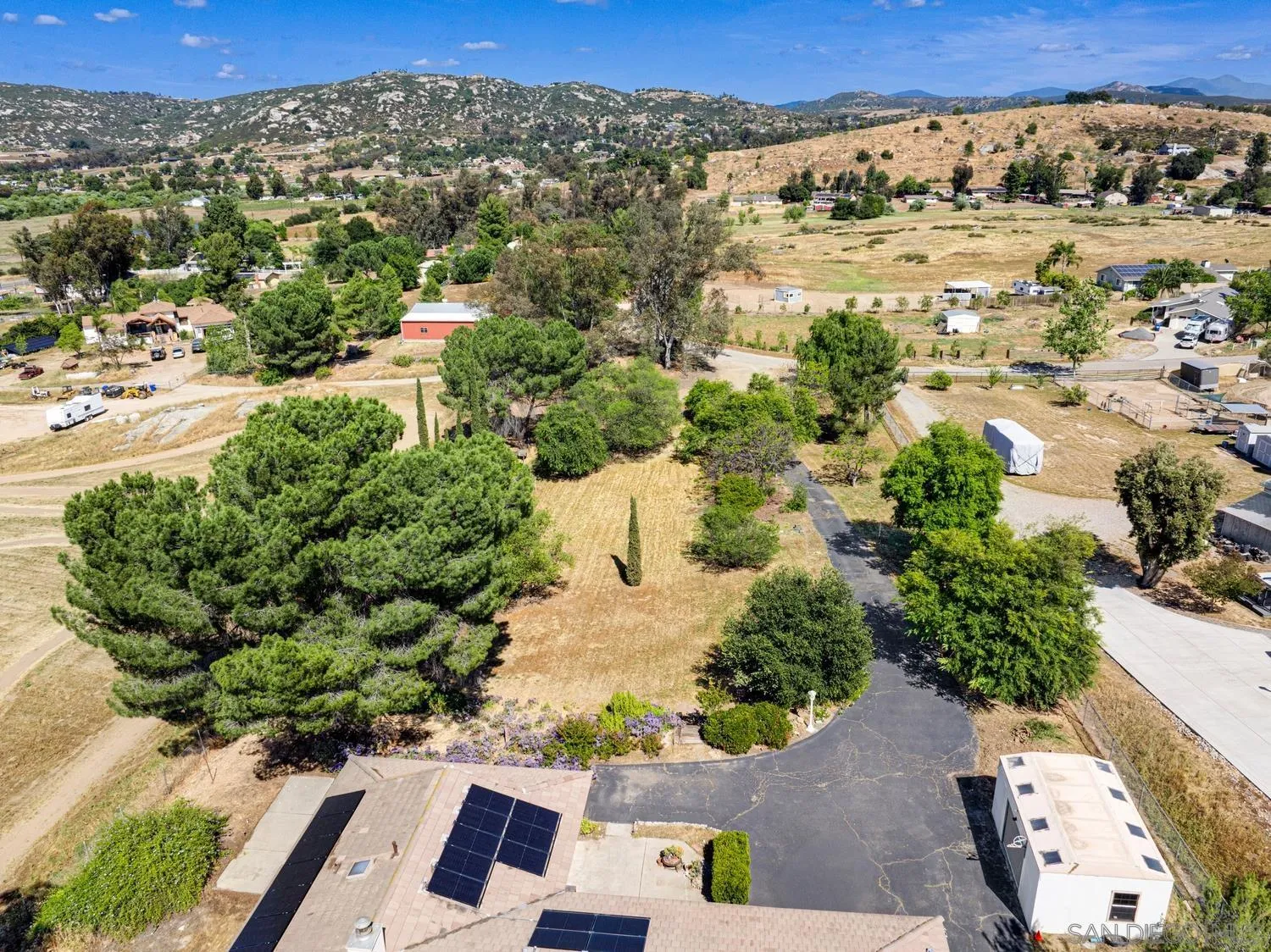 Set on a beautifully usable and expansive 1.23-acre flat parcel, this inviting property offers the perfect blend of privacy, functionality, and scenic charm. A long private driveway leads you to this fully fenced estate with a gated entry, ideally situated just off a paved road with convenient access to Highway 78 and close to town with nearby shops, restaurants, and grocery stores. The land is well suited for horse and animal enthusiasts, gardening, or creating your own grove, all while enjoying picturesque mountain and pasture views. The property also features charming grape vines and a chicken coop, adding to its appeal for those seeking a more self-sustained, country lifestyle. Thoughtfully improved, the property features RV parking, a metal workshop with 220 power, two storage sheds, and a leased solar system with a low monthly payment for added efficiency. The welcoming ranch-style home begins with a spacious front patio and flows into a foyer that opens to the dining area and an impressively large, renovated kitchen. This oversized kitchen is both stylish and functional, offering abundant cabinetry, a breakfast bar, pantry, recessed lighting, and stunning granite countertops—perfect for everyday living and entertaining. The dining room includes sliding doors to the backyard, while the family room features a cozy wood-burning fireplace with hearth, surrounded by built-ins. The primary suite offers a private bath, while two additional bedrooms share a well-appointed bathroom with dual sinks and a tub/shower combination. This home offers endless possibilities!