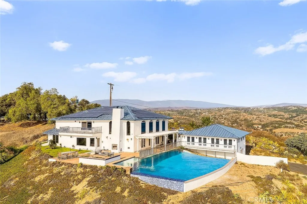 Back on the market...huge price adjustment! Opportunity is knocking!! HILLTOP CUSTOM ESTATE with DETACHED GUEST HOUSE1 ~ Stunning 360 Views ~ 6 Bedrooms (4 in main house, 2 in guest house) plus office ~ 5 1/2 Bathrooms ~ Dramatic high ceilings ~ 2 Fireplaces ~ 4 Car tandem style garage ~ EV Charging Station ~ Pre-Paid Solar ~ Newer 50 yr. Metal roof (metal roofs have a Class A fire rating, meaning they resist surface flame spread.) ~ Interior fire sprinkler system ~ Recent RHINO SHIELD Paint interior & exterior ~ 4-zone HVAC System ~ CAT-5 cable wiring ~ Large Deck off the Master bedroom ~ Circular Driveway ~ Grand double door entryway with Foyer and Chandelier ~ Double staircase ~ Blue glass windows ~ Large sized bedrooms ~ Bonus room off master ~ Office downstairs ~ Detached guest home is 1276 sqft, has 1 bedroom, an office (could be 2nd bedroom) sun/craft room, living room and kitchen area with full bathroom, laundry optional hookups and private patio with views. ~ Majestic Bonsall sunset views ~ Add additional homes, or make it your own Compound or consider the business opportunities that await ~ truly an Entertainer's paradise ~ Highly desired Bonsall Schools ~ Located right off of Highway 395 & the 15 freeway ~ Close to Restaurants, Golfing, Wineries, Shopping, Equestrian activities, Hiking & less than 30 mins to the beautiful San Diego Beaches.