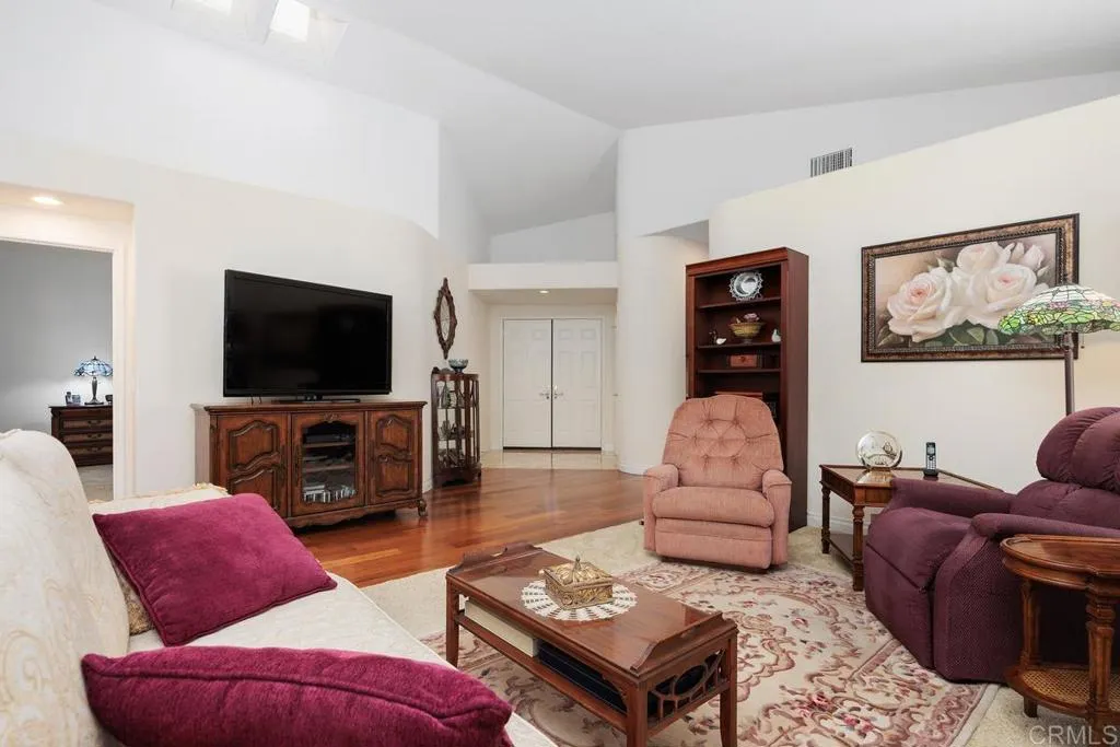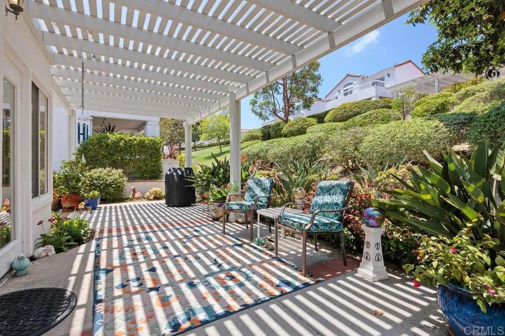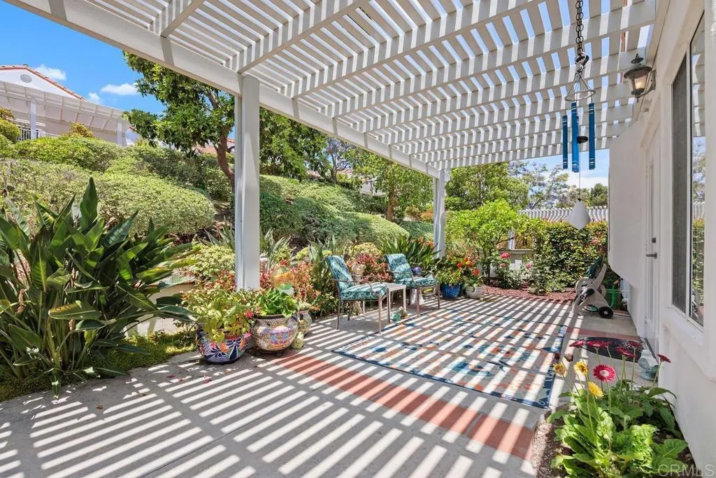Popular "Acadia" Model featuring 1592 SF, 2 Bedrooms and 2 baths, this turnkey, single-level home features vaulted ceilings and a cozy fireplace. The kitchen has beautiful honey-colored cabinets with under cabinet lighting, granite counters, SS appliances, a separate pantry and recessed lighting. The lower cabinets have been replaced with drawers. The spacious Primary bedroom suite has extra space for sitting area or a study as well as a large, walk-in closet. Both bathrooms have updated vanities, new sinks, toilets and faucets. The primary bathroom has been reconfigured to include a beautifully tiled shower and an added laundry closet with stackable washer/dryer. Recessed lighting has been installed above the vanity which has a quartz countertop and pull-out shelves. Flooring throughout the home is engineered wood, travertine tile (entry/ bathrooms) and carpeting (bedrooms, dining/living room) with updated baseboards. There is an oversized, 2 car garage with 5 large cabinets for storage. The private, outdoor living space features a lovely, wrap-around patio with an alumawood patio cover. The HVAC and attic insulation has been replaced. There are retractable invisible screens on the front door and kitchen French doors. This home is immaculate & move-in ready-come make it your own & enjoy the unique, active Ocean Hills lifestyle!