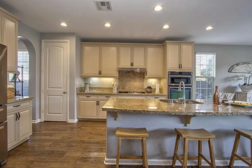 Located within the top-rated Encinitas Union and San Dieguito Union High School Districts, perched on a private lot with sweeping hillside views, this move-in-ready La Costa Oaks gem combines luxury, flexibility, and exceptional value. Ideally situated at the top of a quiet cul-de-sac of just sixteen homes, it offers privacy and a true sense of community. With 4 bedrooms, 3 full baths, and a versatile bonus room, the open-concept floorplan is designed for modern living. Enjoy hardwood floors throughout, updated baths with new granite and custom sinks, a cozy fireplace and a downstairs bedroom with full bath, perfect for guests or multigenerational living. The bonus room easily adapts as a home office, gym, or playroom. Step outside to your low-maintenance backyard oasis featuring lush artificial turf, a covered pavilion with outdoor TV, and a relaxing hot tub ideal for year-round entertaining. The expansive lot offers endless potential for a future pool or ADU. Residents enjoy resort-style community amenities including pools, clubhouse, and fitness center, all with low Mello-Roos and a low tax rate. This is La Costa Oaks living at its best, a rare opportunity to own a stylish, move-in-ready home in one of North Countys most coveted communities.