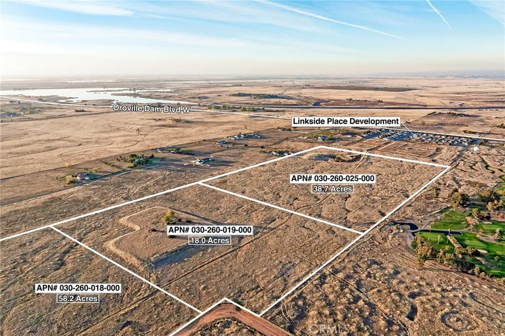 PRIME DEVELOPMENT OPPORTUNITY with this 115 acre land offering located at the edge of the Oroville City Limits and directly adjacent to the 18-Hole Table Mountain Golf Course. Featuring approximately 2,200 feet of golf-course boundary frontage, this property presents exceptional potential for a rural-residential or golf-oriented development concept, including 5-acre estate lots under the current RR-5 zoning. The land borders Linkside Place Phase II to the north, including the tentatively approved Linkside Place Phase II subdivision consisting of 56 future homesites. Phase II has underground utilities already installed and roads graded, awaiting paving, signaling strong forward momentum for continued residential growth in this corridor. Linkside Place Phase I, just north of Phase II, was completed in recent past with 65 homes and demonstrates proven development success in this immediate area. This prime 115 acres is made up of three legal parcels: APN 030-160-019 (18.08 acres), APN 030-260-025 (38.79 acres), and APN 030-260-018 (58.24 acres). Just over 1,000 feet west lies the previously City-approved 421-acre Oro Bay master plan area, once approved for approx. 2,400 homes, showing the long-term development vision for this part of Oroville. Power, water, and sewer currently extend to Linkside Place Phase II at the northern boundary of this property. With Orovilles growing population, multiple new housing projects underway, and demand for quality development opportunities, this acreage sits directly in the path of expansion. Located just south of Oro Dam Blvd, the main connec