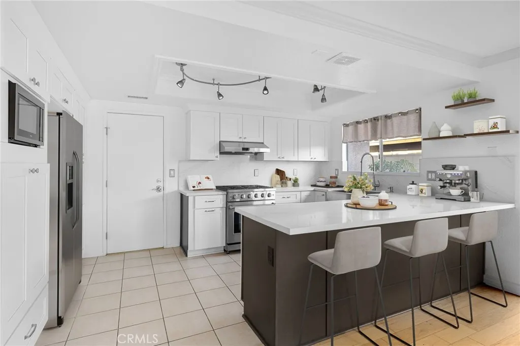 Remodeled Pool Home on a Private Cul-De-Sac. A manicured front yard with a lawn, clean planters, and a concrete walkway leads to a welcoming covered porch. Inside, the open-concept layout features rich wood flooring, crown molding, and recessed lighting throughout. The remodeled kitchen offers white shaker cabinetry, quartz counters, stainless steel appliances, including a sleek slimline wine fridge, a farm sink, and a peninsula with bar seating. An adjacent dining area provides abundant natural light and direct access to the side yard through a sliding glass door. The spacious family room showcases a brick fireplace with a raised hearth and mantel, recessed lighting, and French doors framing views of the pool and backyard. Just off the family room is an office with an arched opening and double-door hallway access (previously the fourth bedroom and easily convertible back if desired.) Down the hallway, the primary bedroom overlooks the pool and features tiled flooring, crown molding, a ceiling fan, dual closets, and a sliding door to the backyard. The primary bath includes a walk-in shower with a glass enclosure and a pedestal sink. Two additional bedrooms also offer ceiling fans and share a well-appointed hall bath with a tub/shower combo and pedestal sink. The backyard is designed for entertaining, offering a sparkling pool and spa, expansive concrete decking, elevated brick planters, and block walls on all sides for privacy.