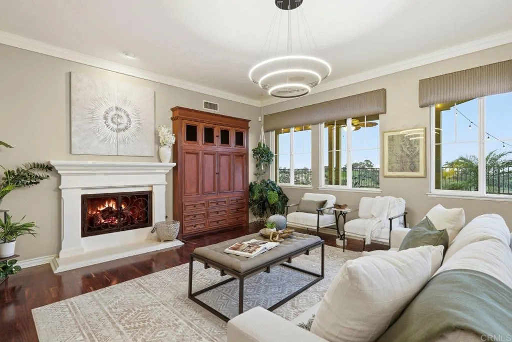 Bathed in golden coastal light and cooled by ocean breezes, this west facing Quail Ridge home offers a daily connection to beauty, tranquility, and elegance. From its elevated position overlooking the 5th and 6th holes of Encinitas Ranch Golf Course to the endless blue of the shimmering Pacific, life here feels intentional and unhurried. A marble entry welcomes you at the front door, while a peaceful courtyard offers a secondary entrance into light filled interiors where quality finishes, custom craftsmanship, rich hardwood floors, and a dramatic formal living room with soaring ceilings create a sense of timeless sophistication. The heart of the home unfolds toward the view, where the family room and chefs kitchen are designed for both lively gatherings and quiet mornings, anchored by an extended island, six burner gas range, double ovens, butlers pantry, and casual dining with ocean and fairway vistas. Indoor and outdoor living blends seamlessly as fires glow, wine is poured from the dedicated wine room, and the backyard becomes a private retreat with a water feature pool and spa, built-in grill, and expansive spaces to linger as the sun melts into the horizon. Upstairs, the primary retreat feels like a sanctuary, where mornings begin on a balcony with picturesque views and evenings unwind in a spa inspired bath with dual walk-in closets and a serene sitting area with a cozy fireplace. Three additional bedrooms upstairs and a flexible den with potential for a fifth bedroom downstairs offer space to host, create, and recharge, while thoughtful upgrades including a new roof