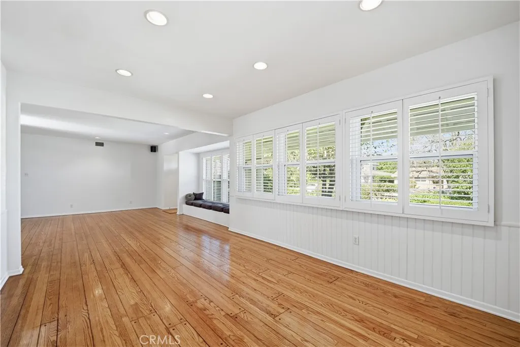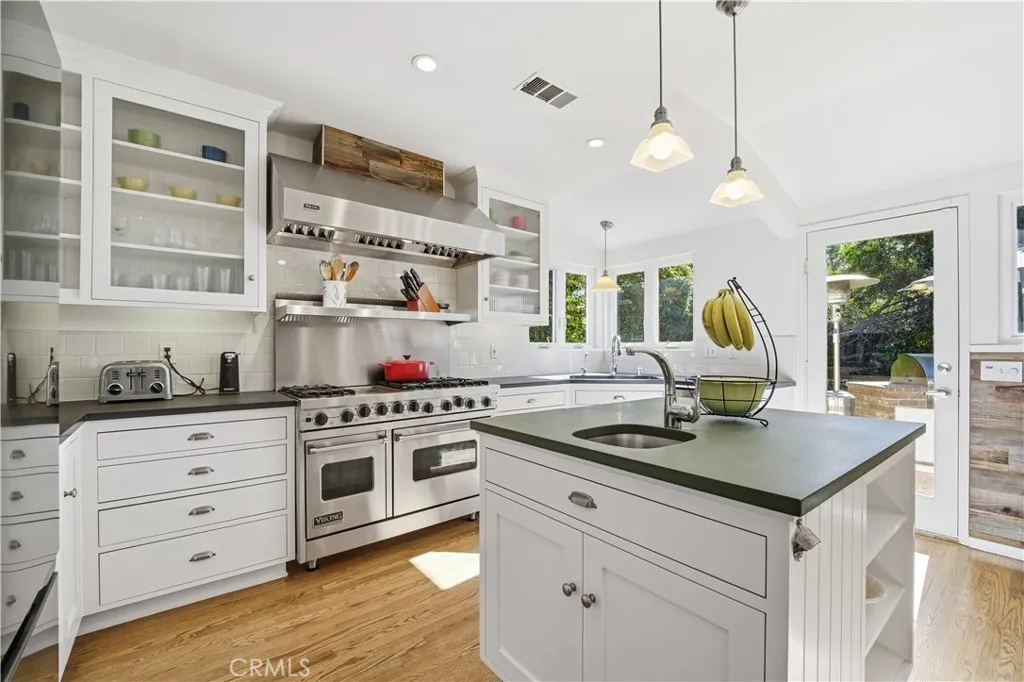 Located in the acclaimed Hesby Oaks School district, this single-story California Ranch/Traditional residence offers comfortable living in a tranquil setting. Welcomed by gorgeous curb appeal, the 3 bedroom, 3 bath main home plus detached studio with half bath showcase an open, airy floor plan that flows seamlessly to the exterior spaces, creating an ideal atmosphere for entertaining. Natural light floods the home through walls of windows, creating a warm, inviting aesthetic, while gleaming hardwood floors, plantation shutters, French doors, and bead board accents further enhance the interiors. The common rooms include a living room with used brick fireplace and built-in window seat with under-bench storage, a formal dining room, and a family room with fireplace, built-in cabinetry, exposed beam tongue & grove ceiling and a raw wood accent wall. Both stylish and functional, the fabulous center island kitchen is a true chefs kiss and features a 6-burner dual oven Viking range with griddle, custom cabinetry with glass-front accent cupboards, contrasting Fire Slate countertops, a cheerful breakfast area, and a butlers pantry with wine storage. Overlooking the manicured rear grounds, the attractive primary suite offers French doors, exposed beam ceilings, walk-in closet, and a luxurious spa-quality bath with free-standing soaking tub, separate multi-head shower, furniture-grade cabinetry, and a private water closet. The expansive grounds are framed by mature landscaping for added privacy and provide the perfect setting to enjoy a relaxed California lifestyle, complete with a la