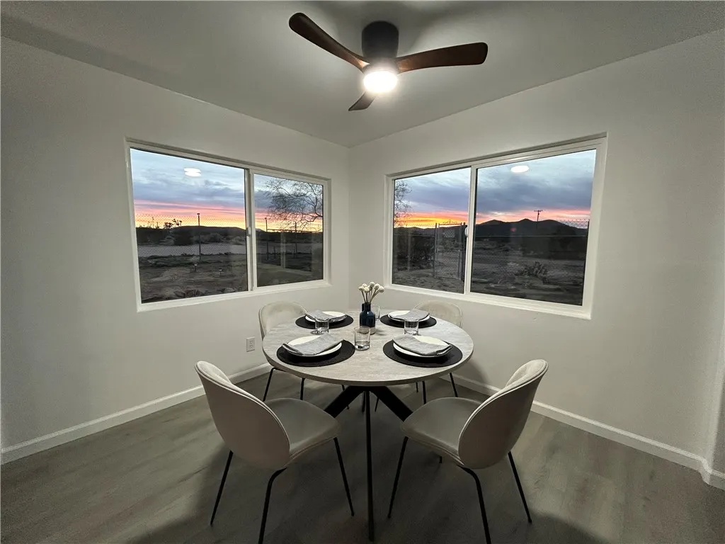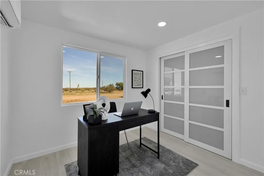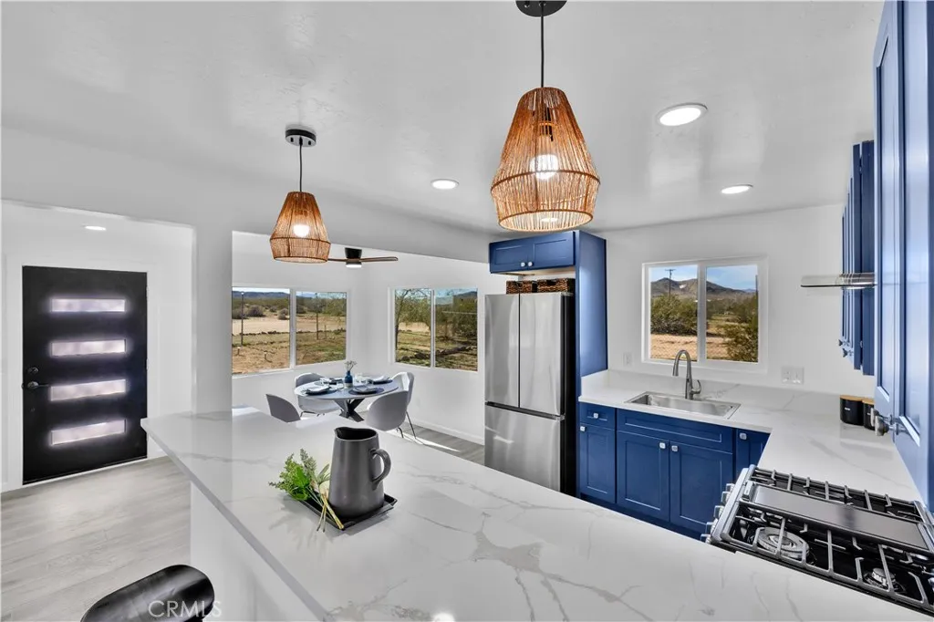 New construction look and feel! Nearly everything has been redone in this stunning 3 bed 2 bath desert oasis. This soon to be fully fenced desert gem offers sprawling 360 degree views with incredible sunrises and mesmerizing sunsets. You'll feel like kings and queens with new drywall, windows, floors, recessed lighting, updated electric and plumbing, brand new septic, all new Samsung appliances, quartz countertops, luxury Italian tiles in both bathrooms, modern finishes, new mini splits in every bedroom, French doors and more! And check out the garage! Brand new Samsung washer and dryer await with new epoxy floors, drywall, recessed lighting, a new vanity/sink/cabinet combo, fridge, and even a mini split! Finalize the conversion into an ADU or use the space for a huge entertainment area, music/yoga studio, weekend guest sleeping space, man cave/she shed, or just have one really nice garage! Priced to sell!!! No other 3/2 on 2.5 acres with detached garage and new septic tank compares at this price! Come and get it today before this gorgeous home is someone else's.