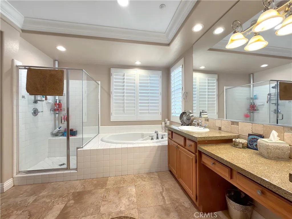 Welcome to this exquisite Bel Maisson estate located on a quiet cul-de-sac, ideal for even the most discerning buyers. This exceptional home showcases top-of-the-line upgrades and amenities throughout. The beautifully landscaped front yard offers outstanding curb appeal, while the private backyard is an entertainers dream, featuring a cocktail pool and spa with waterfall and newer pump, built-in BBQ, outdoor lighting, speakers, and a relaxing seating area. Inside, the home is filled with designer finishes, beginning with a grand entry highlighted by a custom front door with speakeasy, elegant chandelier, and travertine flooring with mosaic inlays. The gourmet kitchen features granite countertops, a large center island, double ovens, custom cabinetry with glass doors, stone backsplash, and a walk-in pantry. The home features a downstairs bedroom or office and fully remodeled bathroom with travertine floors and shower great for in-laws. Spacious living and family rooms each include fireplaces, complemented by a detailed wrought-iron staircase. Upstairs offers a large loft or secondary family room, Jack-and-Jill bedrooms connected by a beautifully remodeled bathroom with granite countertops, dual vanity, stone shower, and flooring. The luxurious primary suite features an upgraded bathroom and walk-in closet. Additional highlights include hardwood floors, travertine, and designer carpet throughout, plantation shutters, crown molding, upgraded baseboards, newer air-conditioning system, intercom/radio system, newer water heater, closet organizers, and a three-car attached garage
