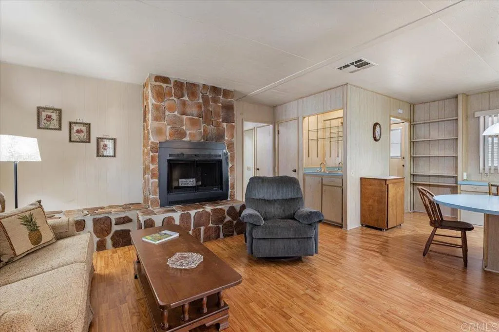 Fully Furnished home that shows pride of ownership located on a corner lot in a 55+ community! NO property taxes, as home is still on HCD registration. This open floor plan offers separate Living and Family rooms that can be shut off from one another with pocket doors or opened up to flow together. There are also multiple dining options including a built in breakfast nook and formal Dining room area. Lots of built in storage, including a built in desk conveniently located in the Kitchen, and a built in wet bar. The fireplace is purely decorative, as the homeowner opted to discontinue it in the recent re-roof. Newer roof, new dishwasher and toilet. The exterior boasts a low maintenance yard, private covered porch, and storage shed. Conveniently located just a short walk form the community pool and other amenities! Vista Royal Lodge is a 55+ park that allows second resident to be age 45+. 2 small pets okay with management approval. Monthly space rent is $1,056.20. Walking distance to Sprouts, Albertsons, Rite Aid, dining & shopping, near Downtown Vista; breweries, movie theater, transportation, Moonlight Amphitheater & a short drive to beaches!