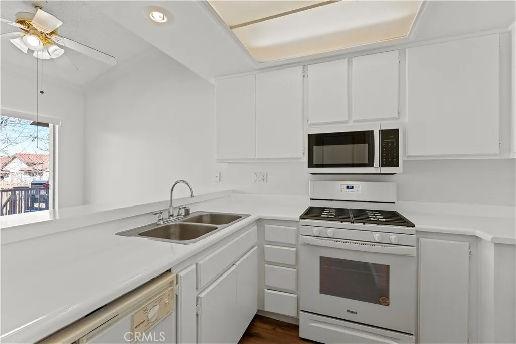 Welcome to this beautifully updated upper-level condominium located in a desirable gated community in Corona. This light-filled 2-bedroom, 2-full-bath home features soaring cathedral ceilings that create an open and airy living environment rarely found at this price point. The interior has been thoughtfully refreshed with brand-new flooring throughout, fresh paint, and numerous upgrades including a new stove, microwave, toilets, thermostat, updated plumbing, and all new window blindsmaking this home truly move-in ready. Comfort is ensured year-round with central air conditioning. Enjoy the convenience of a private garage plus a second assigned parking space. Located within a secure gated community with easy access to shopping, dining, commuter routes, and local amenities, this home combines comfort, convenience, and turnkey living. Perfect for first-time buyers, downsizers, or investors seeking a low-maintenance property in a prime Corona location.