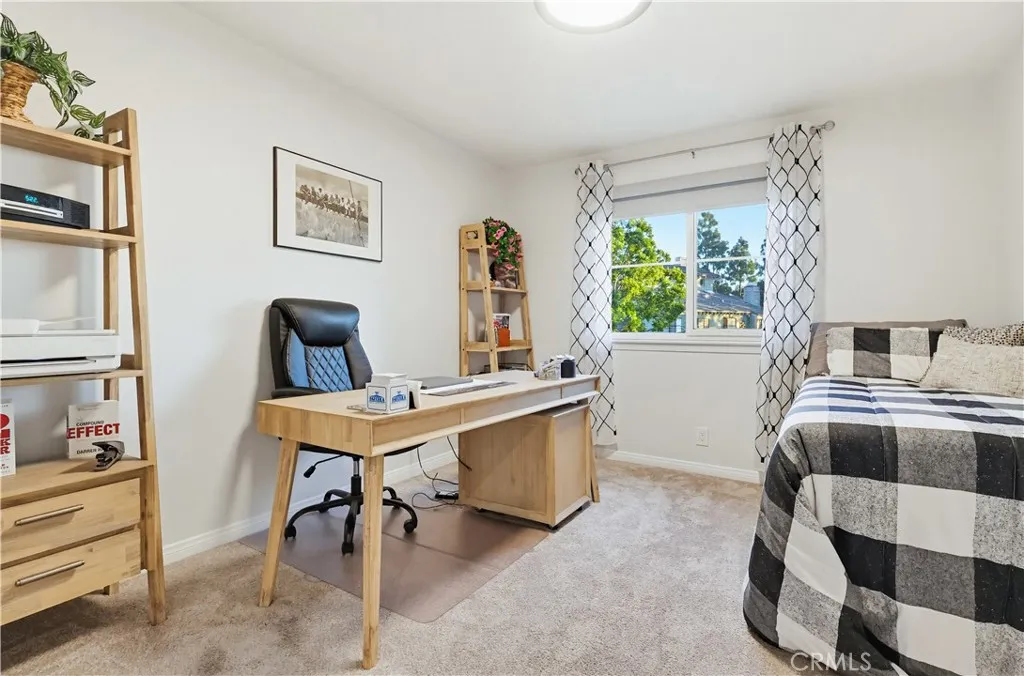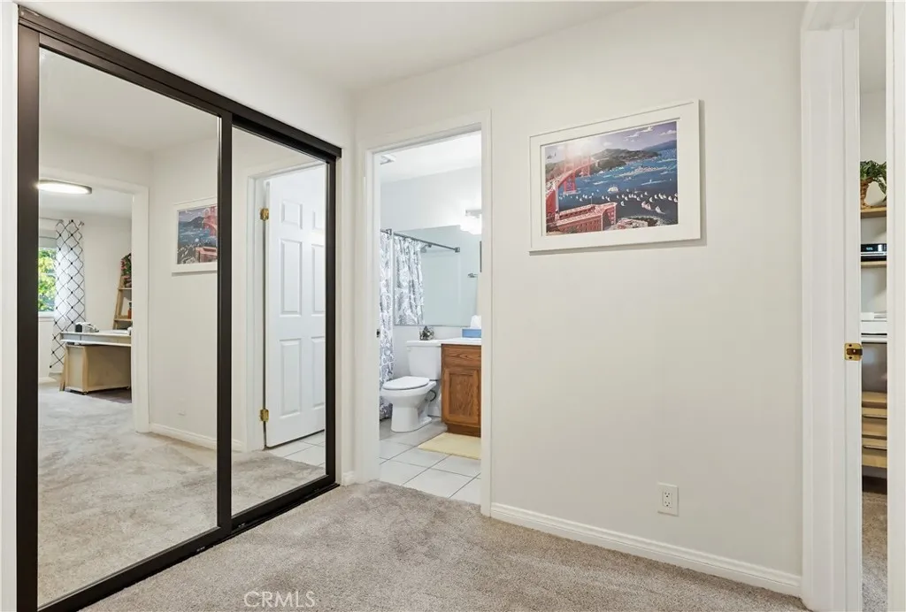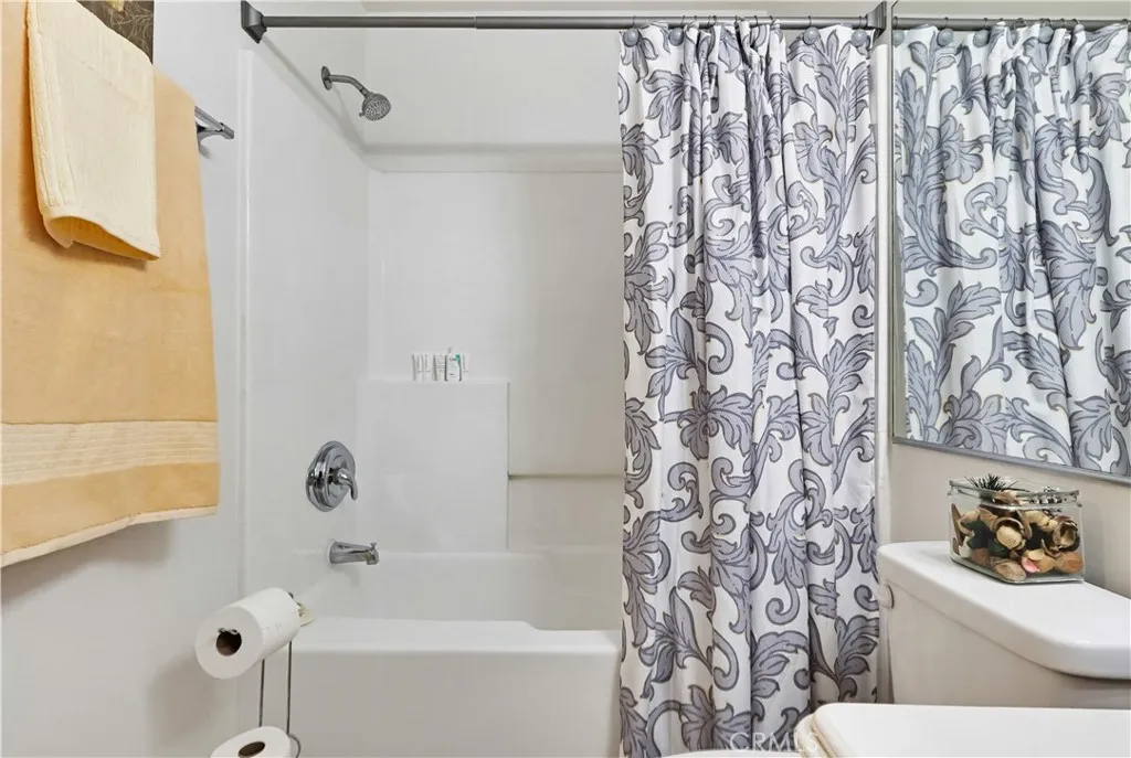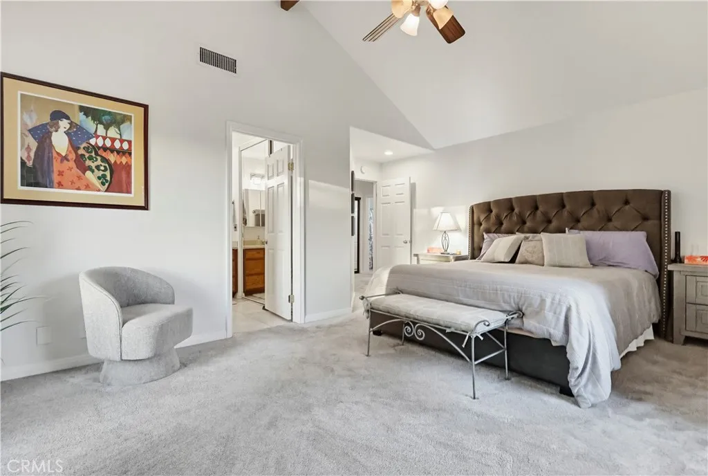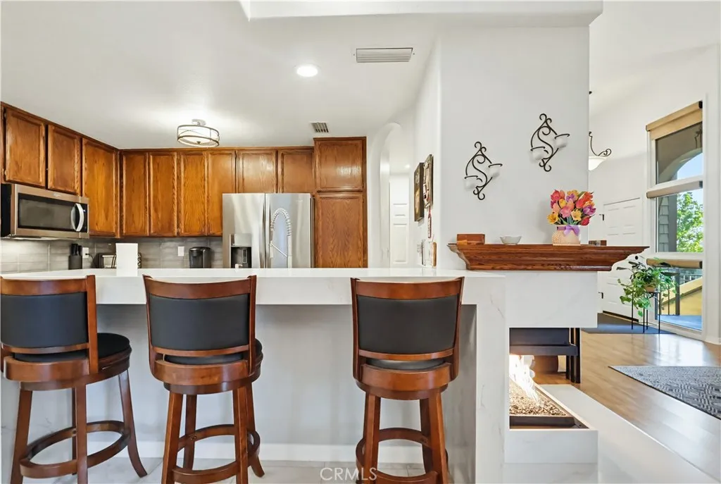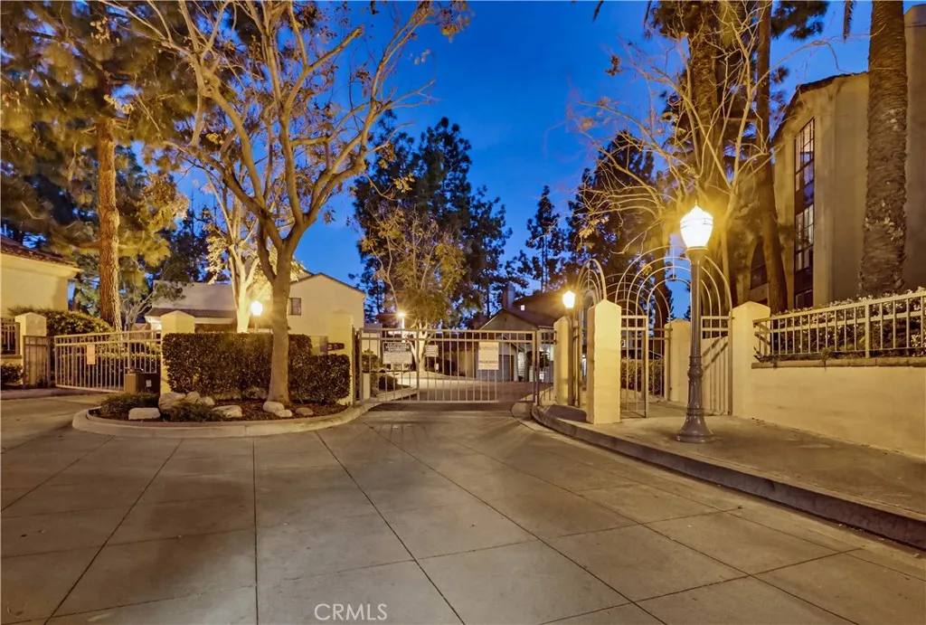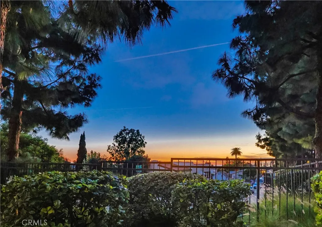 This beautifully maintained 2-bedroom, 2-bath split-level view home offers 1,356 square feet of comfortable living in a desirable gated community now featuring a brand new HVAC system. Cathedral ceilings in both the living room and primary bedroom create an open, airy feel, while the west-facing orientation delivers breathtaking sunsets and sparkling city-light views each evening. The inviting living room features a cozy gas fireplace with modern glass rock accents, perfect for relaxing at the end of the day. The updated kitchen includes quartz countertops, stainless steel appliances, tile flooring, and custom window coverings. Warm wood flooring runs through the main living areas, with soft carpet in the bedrooms for comfort. The spacious primary suite offers a Jacuzzi soaking tub and separate walk-in shower, creating a relaxing retreat. A second full bathroom provides flexibility for guests or family. Additional highlights include indoor laundry, a 2-car attached garage with extra storage, and a full-size private patio (not a balcony) with direct gate access to the pool and walkway. Set among mature pine trees and beautifully landscaped grounds, the community offers a pool, two spas, ample guest parking, and nightly security patrol, creating a peaceful resort-like environment. Views, comfort, and convenience all in one exceptional home.
