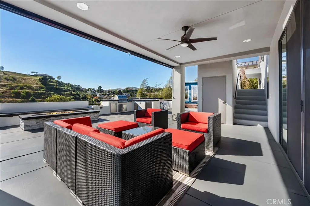 New build in 2021, this stunning modern single-story home offers hillside, mountain & ocean views with exceptional indoor-outdoor living. Designed with high ceilings, abundant natural light, and an open-concept layout, the home features a split floorplan with 4 bedrooms & 3 full bathstwo bedrooms & 2 baths on one side & two bedrooms & 1 bath on the other for ideal privacy & flexibility. All bedrooms with ample storage closets. The gourmet kitchen is thoughtfully designed for both everyday living & effortless entertaining, offering abundant prep space & expansive quartz countertops accented by a stunning glass tile backsplash that adds depth & sophistication. Contemporary pendant lighting & sleek floating shelves enhance the kitchens modern aesthetic, creating an open & inviting atmosphere. Premium appliances include a built-in Sub-Zero refrigerator/freezer, a commercial-grade KitchenAid 6-burner range with double oven, grill, dishwasher & a built-in wine & beverage refrigerator. An expansive quartz island with a breakfast bar provides generous seating, along with ample storage. Completing the space is a large walk-in pantry featuring built-in drawers, pull-outs & shelving for exceptional organization & functionality. The spacious dining area, open to the kitchen, enjoys beautiful eye-catching views. The great room showcases a stacked stone fireplace, recessed lighting, ceiling fan & sliding doors to a covered patio for seamless indoor-outdoor living. Large windows capture backyard & view vistas from the great room, kitchen, dining area, and primary suite. The spacious prima