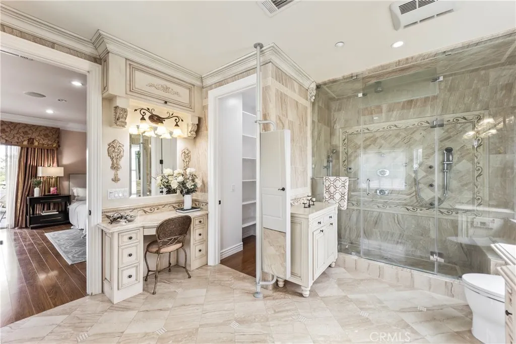 Welcome to this timeless Georgian Colonialstyle estate. Built in 2008, this elegant residence offers 6 bedrooms, 6.5 bathrooms, and a detached 3-car garage. The breathtaking grand foyer is highlighted by a dramatic chandelier, a beautifully stenciled dome, and soaring 26ft ceilings. The main level is thoughtfully designed for both everyday living and sophisticated entertaining. There is a refined library with custom cabinetry and fireplace, living room with another cozy fireplace, family room, formal dining room and a primary suite. The gourmet kitchen is a chefs dream, featuring a large marble center island, high end appliances, double ovens, warming drawers, and a separate wok kitchen. The adjoining family room is warm and inviting, complete with custom built-ins, a central AV console, and a full wine bar. Upstairs, the luxurious primary suite offers a private sanctuary, a spa-inspired bathroom with a steam shower, spacious walk-in closet, and a custom vanity. A unique highlight is the offices with a balcony overlooking the stunning San Gabriel Mountains. Additional bedrooms include a junior suite, two full-size bedrooms with a shared bath, and a generous den. The lower level basement is designed for ultimate entertainment and flexibility. It features a dance studio, entertainment/ game room, bar, and a private suite with marble steam shower, custom cabinetry, and its own exterior access. (Perfect for multi-generational living.) The beautifully landscaped backyard offers a resort-like setting with a waterfall and over 20 fruit trees. Located within the prestigious Arcadia