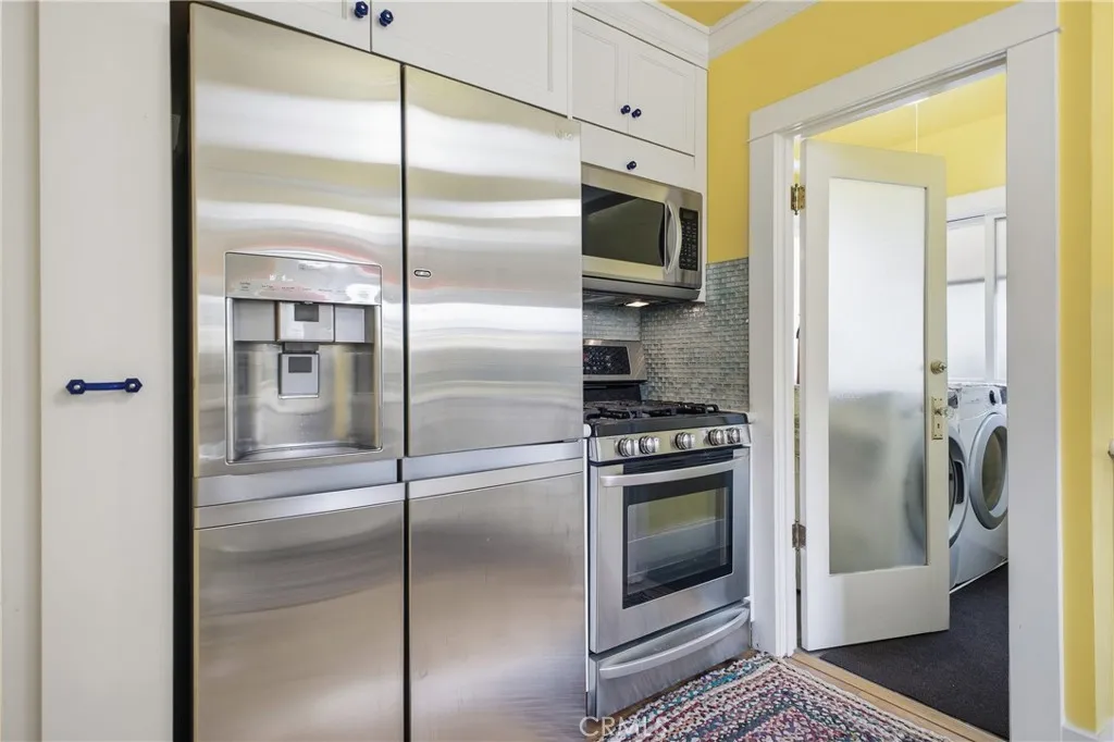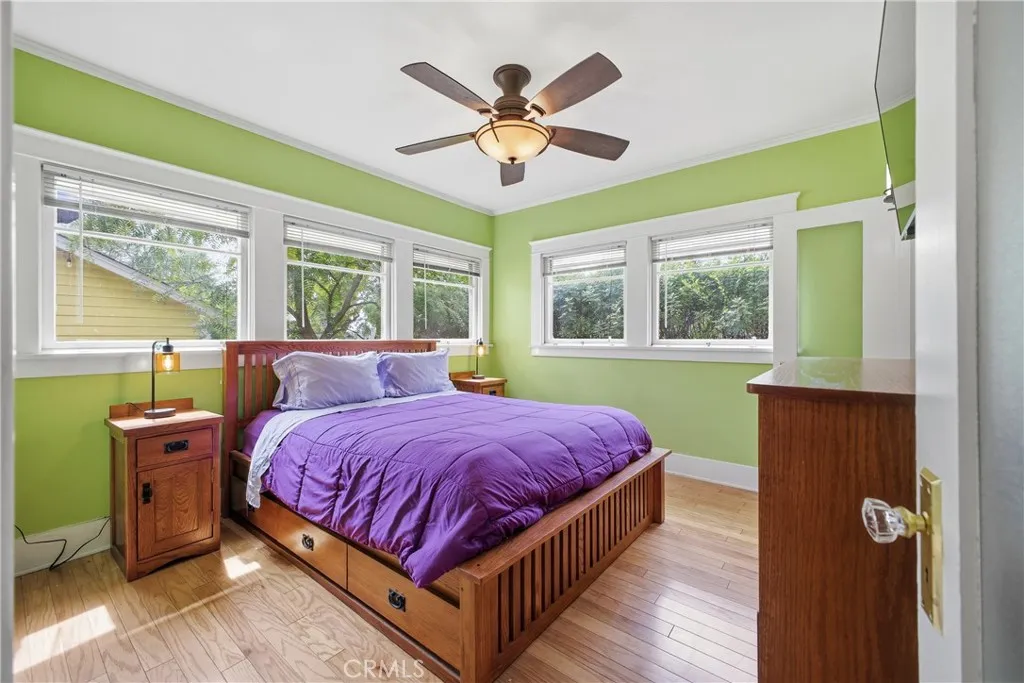Nestled in the heart of Monrovia's famous Wildrose Avenue, this enchanting 1923 California Bungalow effortlessly blends timeless charm with modern convenience. From the picturesque white picket fence, blooming gardens and covered front porch, the home exudes classic appeal. Step through the handsome front door into a light-filled living room with hardwood floors, river rock fireplace, built-in bookshelves and vintage fixtures that create a cozy ambiance. The spacious dining room has hardwood floors, built-in hutch and dual French doors leading to an expansive wrap-around wood deck offering a warm and inviting space for gatherings. This well-appointed home has two comfortable bedrooms, each with hardwood floors, and one period-inspired bathroom. The updated kitchen includes custom cabinets, marble countertops, glass tile backsplash, under cabinet lighting, pull-out spice rack, farmhouse sink, LG stainless steel appliances and a Bosch dishwasher. Other amenities include a separate laundry room with washer and dryer, hardwood floors, wood windows, crown and door moldings, central air and heat, ceiling fans, wall sconces, recessed lighting, rain glass interior doors, glass doorknobs, copper plumbing, updated electrical system and a tankless water heater. Situated on a north facing corner lot, additional features include a one-car garage and a custom-built shed with electricity that is perfect to use as a workout room or office. This delightful residence is more than just a home, its part of Monrovia's architectural heritage, perfect for those seeking a blend of historic charm a