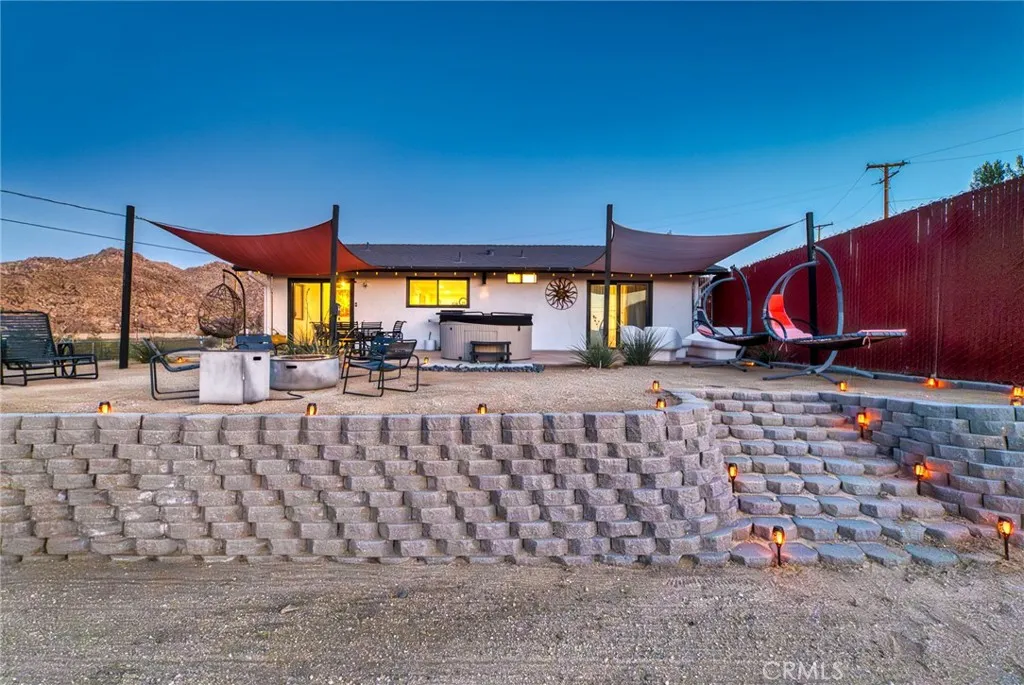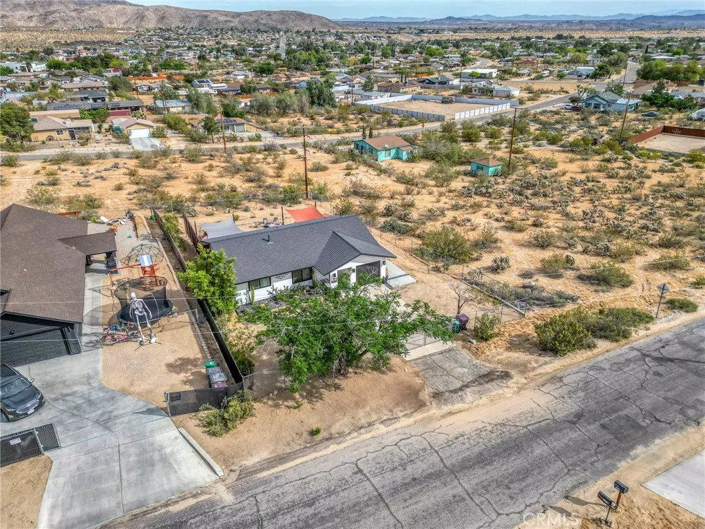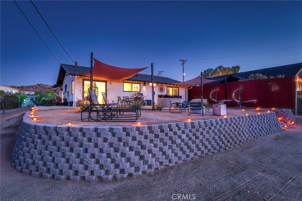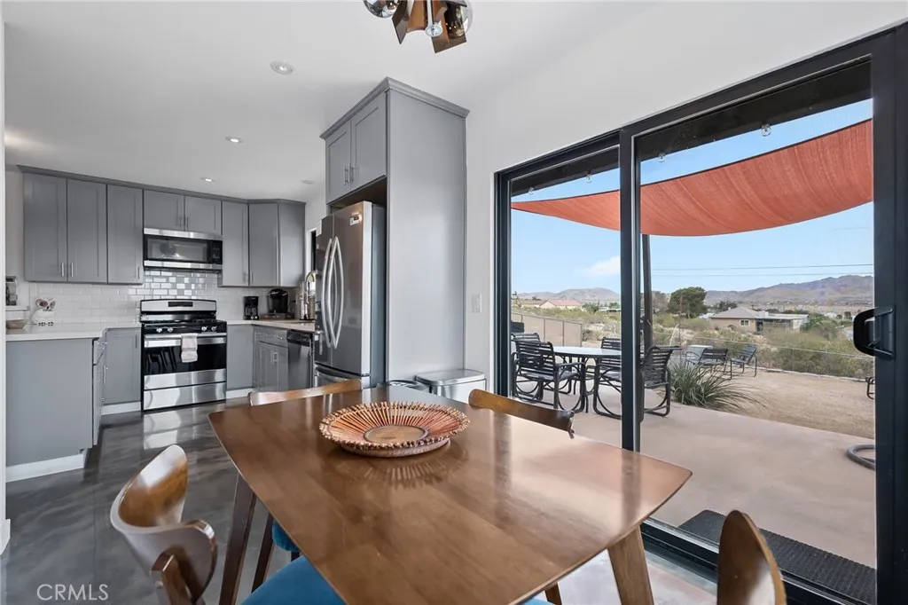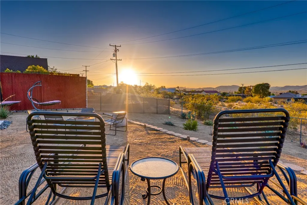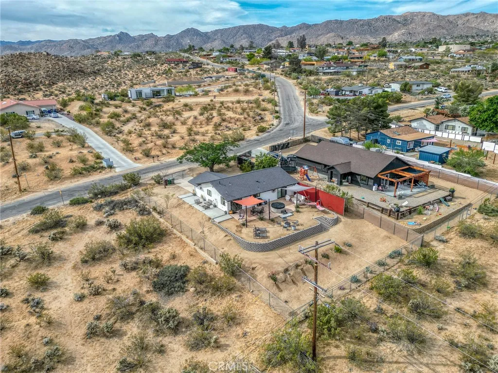 Perched walking distance from the heart of Joshua Tree Village and uniquely positioned across from protected land at Coyote Hole Canyon, home to ancient petroglyphs, this beautifully curated two-bedroom, one-bathroom home offers an exceptional blend of modern design, comfort, and iconic desert surroundings. Set on a thoughtfully situated lot with sweeping views of boulder formations, the valley and the Bartlett Mountain Range, all just minutes to Joshua Tree National Park. Inside, the home is bright and intentionally designed, featuring custom concrete epoxy flooring and an open concept layout. The living room flows into a stylish kitchen with a breakfast bar for casual dining. Through a large glass expanse, the kitchen sink frames dramatic northern mountain and valley views, while the dining area is bathed in natural light from generous windows and a sliding glass door that opens to the backyard. Updated modern Milgard windows enhance energy efficiency, comfort, and quiet while showcasing the surrounding landscape, and mini-split systems throughout provide year-round comfort. Both bedrooms serve as inviting retreats with abundant natural light, with one offering direct access to the backyard through a sliding glass door, while the bathroom is tastefully finished with a single-sink vanity and a spacious walk-in shower with glass enclosure. The attached garage has been finished to include laundry hookups and an electric garage door, adding both convenience and everyday functionality. Designed for both relaxation and entertaining, the outdoor space features wraparound views o