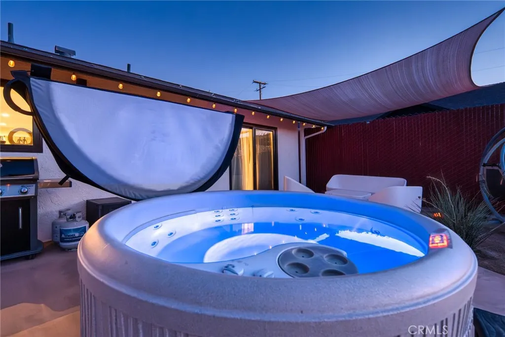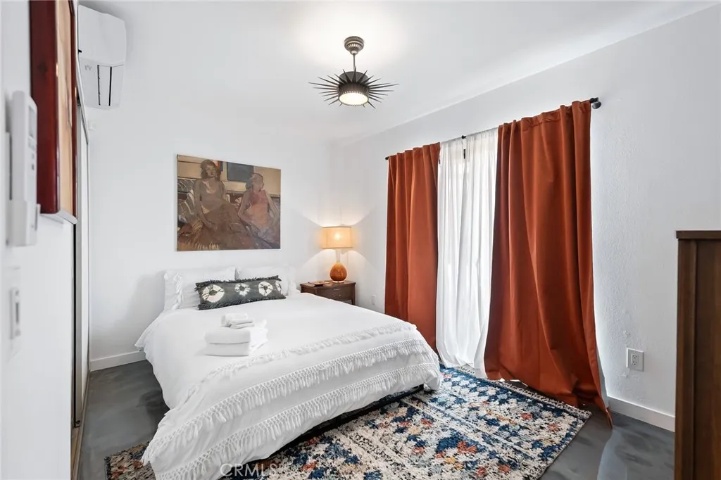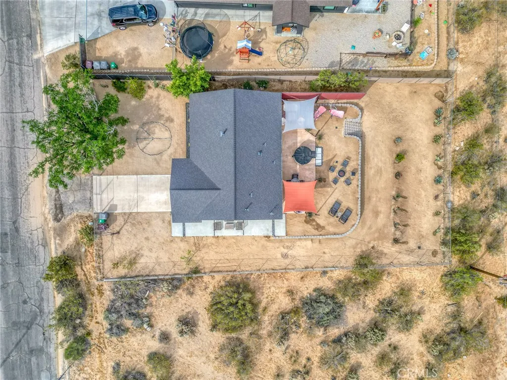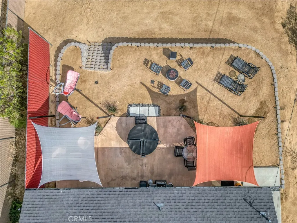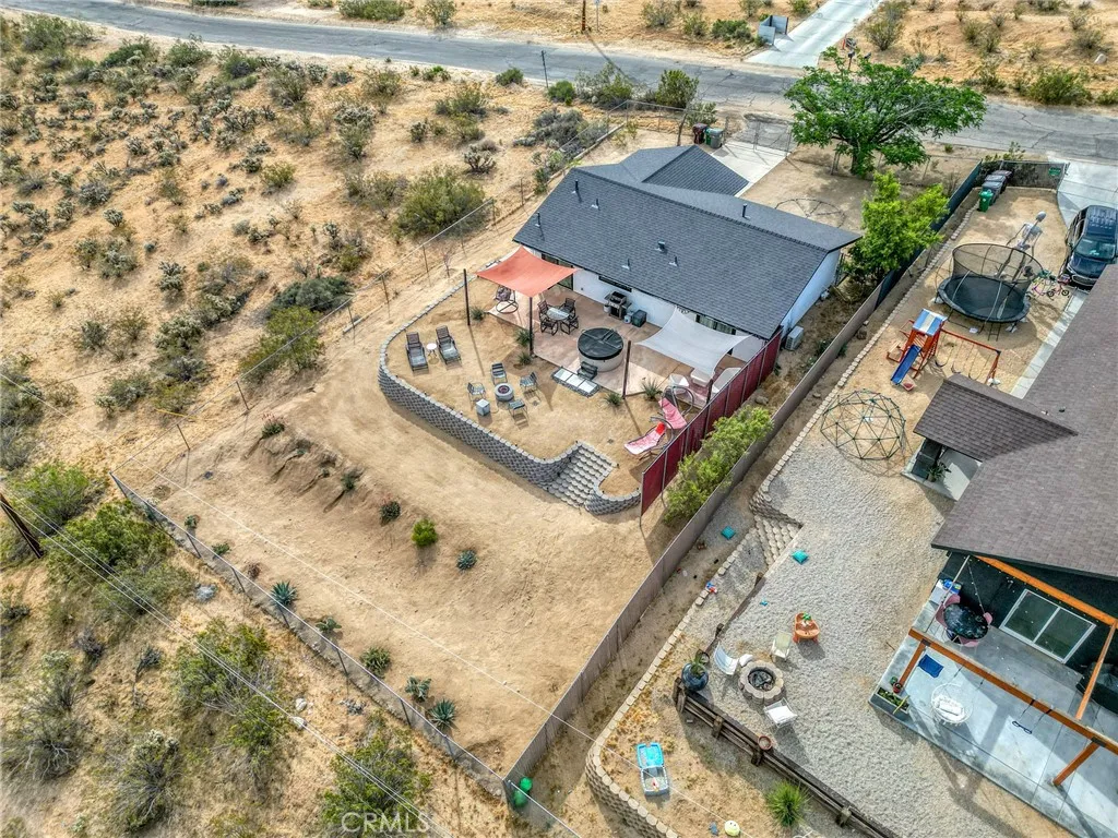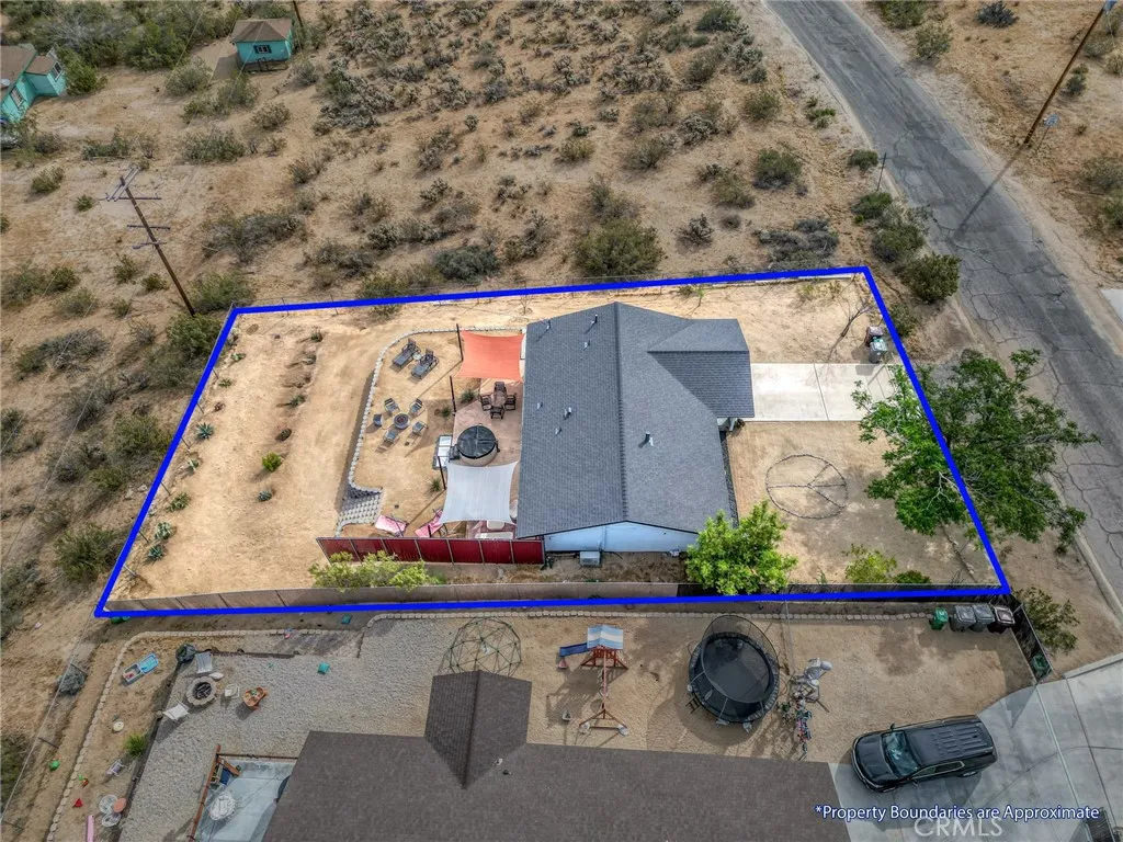 Perched walking distance from the heart of Joshua Tree Village and uniquely positioned across from protected land at Coyote Hole Canyon, home to ancient petroglyphs, this beautifully curated two-bedroom, one-bathroom home offers an exceptional blend of modern design, comfort, and iconic desert surroundings. Set on a thoughtfully situated lot with sweeping views of boulder formations, the valley and the Bartlett Mountain Range, all just minutes to Joshua Tree National Park. Inside, the home is bright and intentionally designed, featuring custom concrete epoxy flooring and an open concept layout. The living room flows into a stylish kitchen with a breakfast bar for casual dining. Through a large glass expanse, the kitchen sink frames dramatic northern mountain and valley views, while the dining area is bathed in natural light from generous windows and a sliding glass door that opens to the backyard. Updated modern Milgard windows enhance energy efficiency, comfort, and quiet while showcasing the surrounding landscape, and mini-split systems throughout provide year-round comfort. Both bedrooms serve as inviting retreats with abundant natural light, with one offering direct access to the backyard through a sliding glass door, while the bathroom is tastefully finished with a single-sink vanity and a spacious walk-in shower with glass enclosure. The attached garage has been finished to include laundry hookups and an electric garage door, adding both convenience and everyday functionality. Designed for both relaxation and entertaining, the outdoor space features wraparound views o