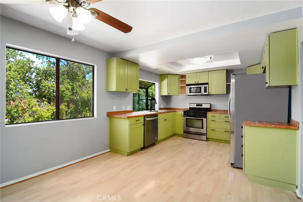 Resort style living in a stunning tri-level Tarzana townhome. Tarzana Courts, a gated and highly sought-after community, offers the perfect combination of privacy, security and comfort. Nestled in a serene, park-like setting with lush landscaping and cozy park benches, this beautifully appointed 2 bedroom + 2.5 bathroom townhome has all the space and features you need for modern living. Situated at the very back of the complex, this spacious townhouse offers the added convenience of not only being light and bright, but also extremely private and quiet. The home opens to a large private patio, ideal for relaxing weekends or evening gatherings. Inside, the living room welcomes you with high ceilings, a cozy gas fireplace, recessed LED lighting and wood laminate flooring that runs throughout the home's interior, enhancing its warmth and elegance. Up a level, you'll find a spacious formal dining room with adjacent wet bar, storage closet/pantry and half bathroom. The remodeled kitchen features stylish butcher block counter tops, updated timeless wood shaker cabinets as well as stainless steel appliances, all of which opens to a stunning breakfast nook or versatile den/family room. Upstairs, the spacious primary suite is a true retreat, with loads of windows that drench the space in sunlight, dramatic 20' tall soaring ceilings, a romantic gas fireplace & skylight as well as a private balcony overlooking the community greenbelt. In addition, the primary features a large attached sitting area, ideal for any office or home gym! Dual closets, one of which is a large walk-in, as well