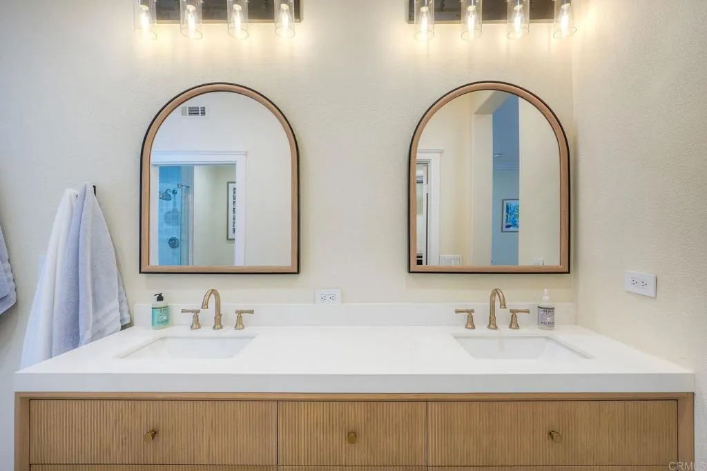 Fully Furnished Executive Rental in Carlsbad! West of the I-5 and steps from the water, experience the ultimate S CA lifestyle in this stunning, fully furnished residence. Available for minimum 30-day stays, this completely renovated corner end-unit in the exclusive, gated Ocean Pointe community offers a turnkey sanctuary for those seeking luxury, comfort, and coastal convenience. This spacious 1,704 sq. ft. single-level home has been meticulously updated with premium finishes and high-end modern amenities such as new laminate flooring, custom trim, modern lighting, and 60 ceiling fans throughout. The chefs kitchen offers brand-new quartz countertops and backsplash, custom painted cabinetry with under-lighting, and top-tier GE stainless steel appliances, including a gas cooktop. The spa-inspired bathrooms offers two primary en-suites featuring brand-new luxury vanities, Kohler soaking tubs, custom tile work, and high-end hardware, plus a beautifully remodeled guest powder room. The sophisticated great room features tranquil wooden tiled accent walls with a quartz hearth and a full-motion TV mount. The expansive floor plan includes two generous primary suites, a versatile den, a large great room, and an open dining area. There is brand-new custom closet systems by The Container Store and a private storage room off the patio. The home equipped with a Google Nest Thermostat (4th Gen), Ring video doorbell, and Schlage electronic smart lock for ultimate peace of mind. Enjoy the ocean breeze from your large, covered patio with views of the serene hillside, lush greenery, and the