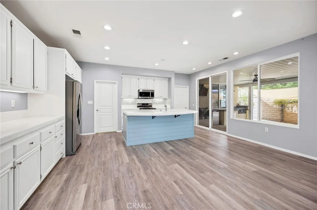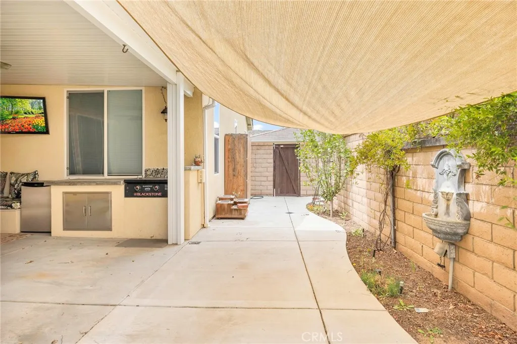 Welcome to elevated 55+ living in the prestigious guard and gated golf course community of The Legends at Hemet Four Seasons, where comfort, convenience, and lifestyle come together beautifully. Ideally positioned with a greenbelt on one side, this home offers added privacy and a peaceful setting, while HOA-maintained landscaping ensures truly low-maintenance living. This highly desirable floor plan features 2 bedrooms plus a dedicated office, offering flexible space for guests, hobbies, or a home workspace. Thoughtfully updated with a modern, cohesive design, the home showcases a large and open kitchen area, updated kitchen appliances, stylish laminate flooring, all complemented by high ceilings throughout. The inviting family room is centered around a custom fireplace and built-in entertainment unitperfect for cozy evenings or hosting friends. Plantation shutters and an all-glass screen storm door bring in beautiful natural light, enhancing the warm and welcoming feel throughout. The primary suite offers a comfortable retreat with added privacy to the en-suite bath, while the secondary bedroom and office are bright and airy. Step outside to your own private outdoor oasisdesigned for both relaxation and entertaining. Enjoy the custom Alumawood patio cover with ceiling fan, built-in BBQ area featuring a Blackstone grill, TV, lighting, and built-ins. Lown maintenance landscaping complete this tranquil spaceyour perfect happy place to unwind. Convenience is unmatched with guest parking located right next to the home, plus a 2-car garage with alley access. Even better, youre j