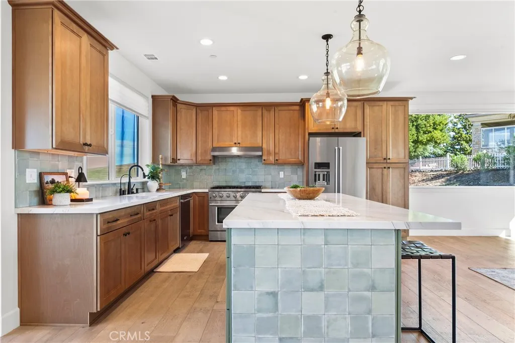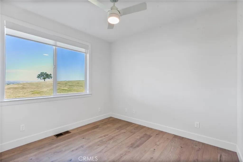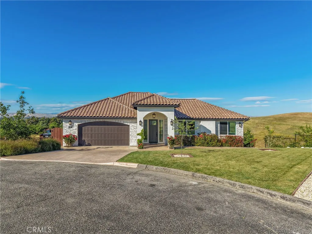 Set behind the gates of Kapareil Estates, this newly built 2024 residence offers a rare blend of modern design, privacy, and sweeping Paso Robles viewsall on a full acre. Thoughtfully positioned to capture the surrounding landscape, the home invites you in with clean architectural lines, warm natural finishes, and an effortless indoor-outdoor flow. Luxury plank flooring carries through the open-concept living space, where expansive glass doors frame rolling hills and lead to a covered deck designed for year-round enjoymentmorning coffee, golden hour dinners, and everything in between. At the heart of the home, the kitchen delivers both style and substance. Custom cabinetry, a striking two-tone design anchored by a soft seafoam island with subtle gray undertones, designer lighting, and a beautifully tiled backsplash create a space that feels both elevated and invitingequally suited for quiet evenings or effortless entertaining. The layout offers four well-appointed bedrooms and 2.5 baths across approximately 2,488 square feet, including a serene entry-level primary suite with direct access to outdoor living and a spa-inspired bath. Each space has been carefully considered to balance comfort, light, and functionality. Beyond aesthetics, the home is equipped with owned solar, bringing long-term efficiency to its modern appeal. Set on a full acre, the property offers a sense of openness and quiet possibility, with almond and pomegranate trees thoughtfully dotting the landscapeall just minutes from Paso Robles renowned wineries, dining, and downtown charm. A contemporary take on