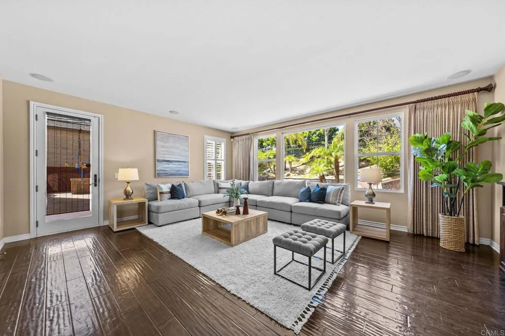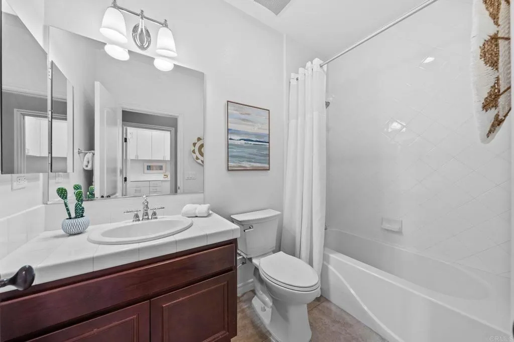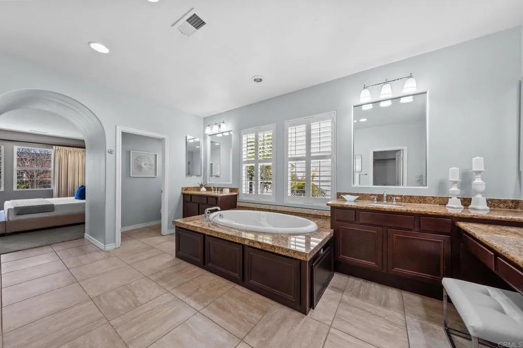 Located in the highly sought-after Arrowood master-planned community in Oceanside, this expansive 5-bedroom, 4.5-bath home offers approximately 4,159 SQFT of thoughtfully designed living space, featuring a flexible floor plan ideal for multigenerational living, remote work, and modern Southern California lifestyles. The home welcomes you with spacious living areas, soaring ceilings, and a well-appointed kitchen featuring granite countertops, double ovens, gas range, and abundant cabinetry, opening seamlessly to the main living areas for everyday living and entertaining. The bedroom layout is both functional and versatile. On the main level, youll find a private bedroom located next to a full bathroom, creating a convenient setup for guests or extended family. This area can also be easily closed off to create a private guest or in-law suite. Upstairs, the spacious primary suite offers a comfortable retreat with generous proportions and room to unwind. The second level also features three additional bedrooms, including two connected by a Jack-and-Jill bathroom, while the third bedroom has access to another full bath. Adding even more flexibility is the ginormous bonus room, currently set up as a home movie theater, but easily adaptable as a game room, media room, home gym, playroom, or additional living space. Step outside to your own private backyard oasis designed for true California indoor-outdoor living. The resort-style yard features a solar-heated pool and spa with a water slide, creating the perfect space for entertaining, relaxing, and hosting unforgettable gatherings