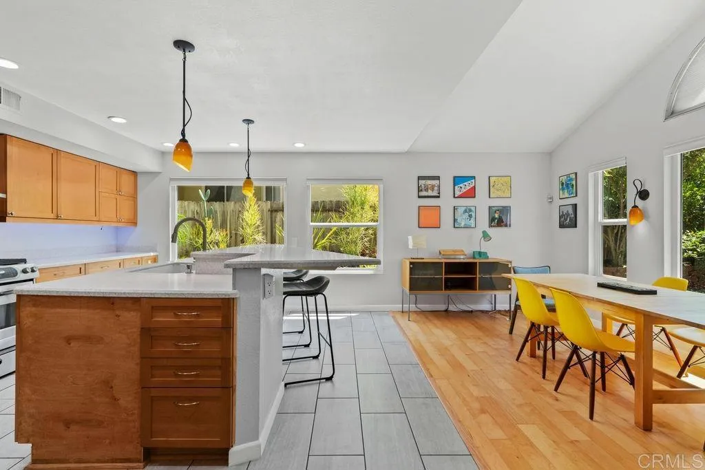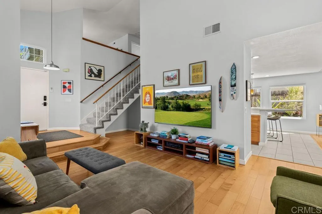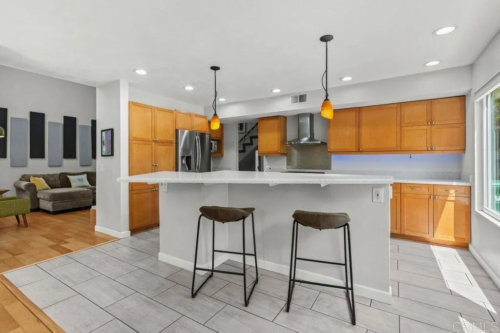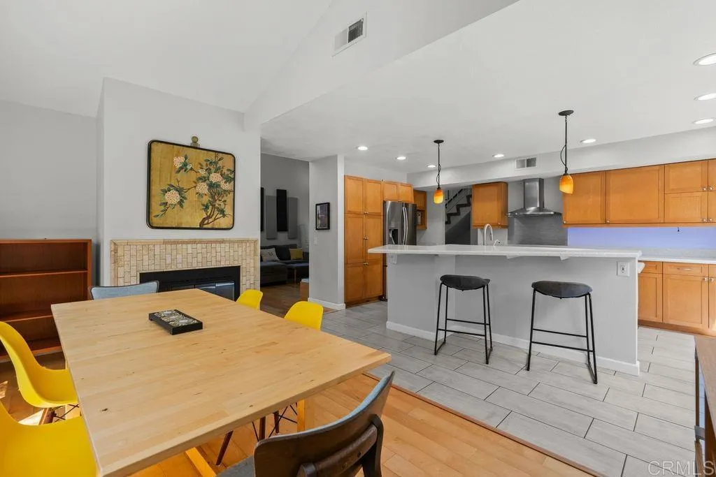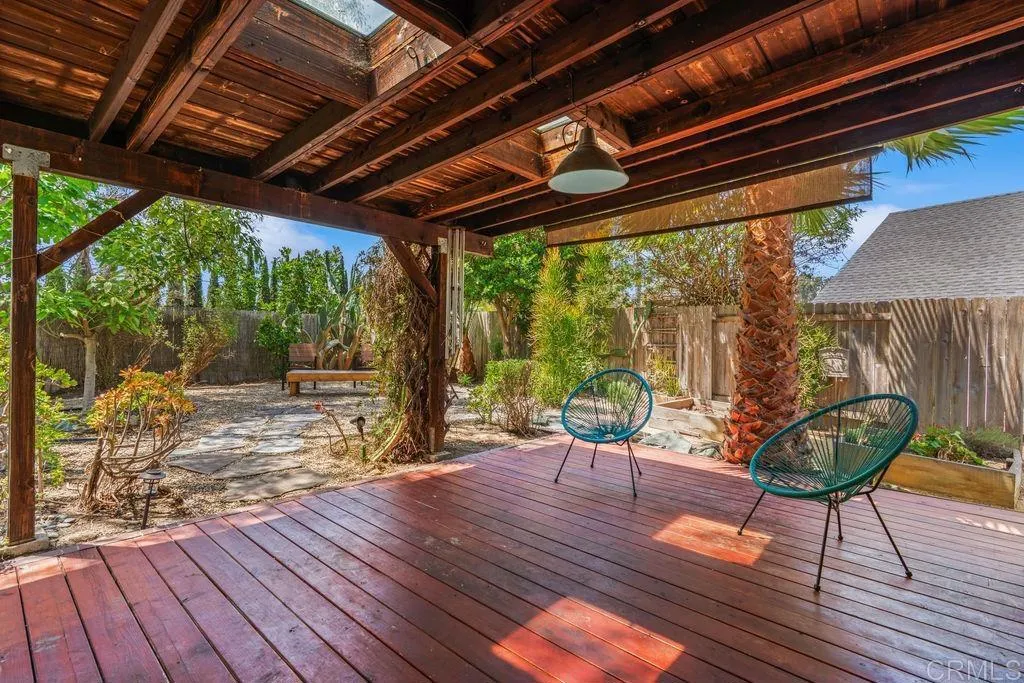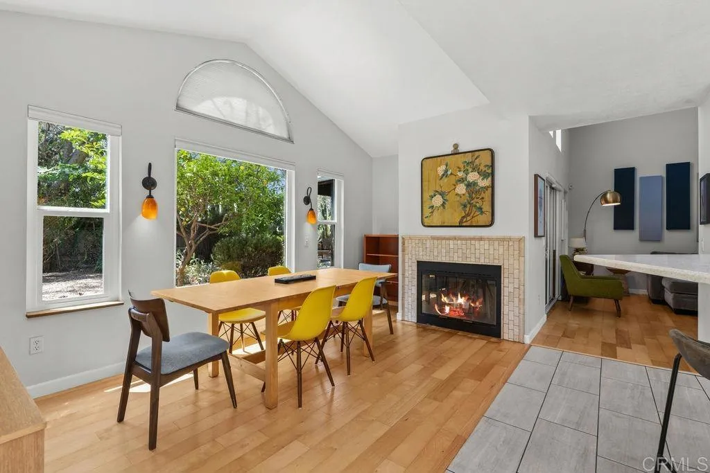 Welcome to 4221 Via Tercero in the highly sought after community of Rancho del Oro. This beautiful two story home offers an exceptional opportunity in a prime Oceanside location. Step inside to vaulted ceilings, dual pane vinyl windows, and abundant natural light, creating a bright and open feel throughout. The main level showcases real birch hardwood flooring, a cozy fireplace, and a modern kitchen with an oversized island, birch wood cabinetry, and stainless steel appliances. A guest bathroom, dedicated laundry room with washer and dryer, and direct access to the two car garage complete the main level. Upstairs offers newer carpeting and a spacious primary suite with ample closet space and an ensuite bath featuring dual sinks and a walk in shower. Two secondary bedrooms share a Jack and Jill bathroom. One includes a walk in closet, while the other is currently configured as an office or loft. A builder option provides the flexibility to convert this space into a true third bedroom by adding a door and finishing the wall. The outdoor space includes a covered wood deck, mature fruit trees, and plenty of room to relax, entertain, or play. The lot extends beyond the fence line and spans just over 9,000 square feet. Residents enjoy low HOA fees and no Mello Roos. The location offers convenient access to parks, recreation, shopping, dining, local beaches, Oceanside Harbor, and downtown Oceanside, along with nearby commuter routes.
