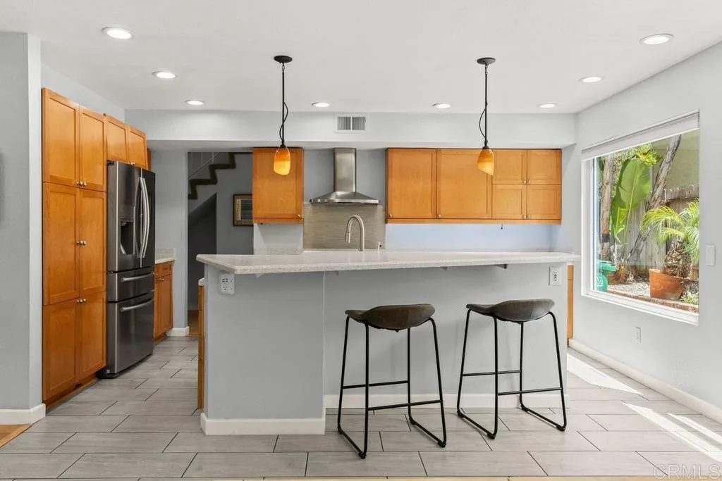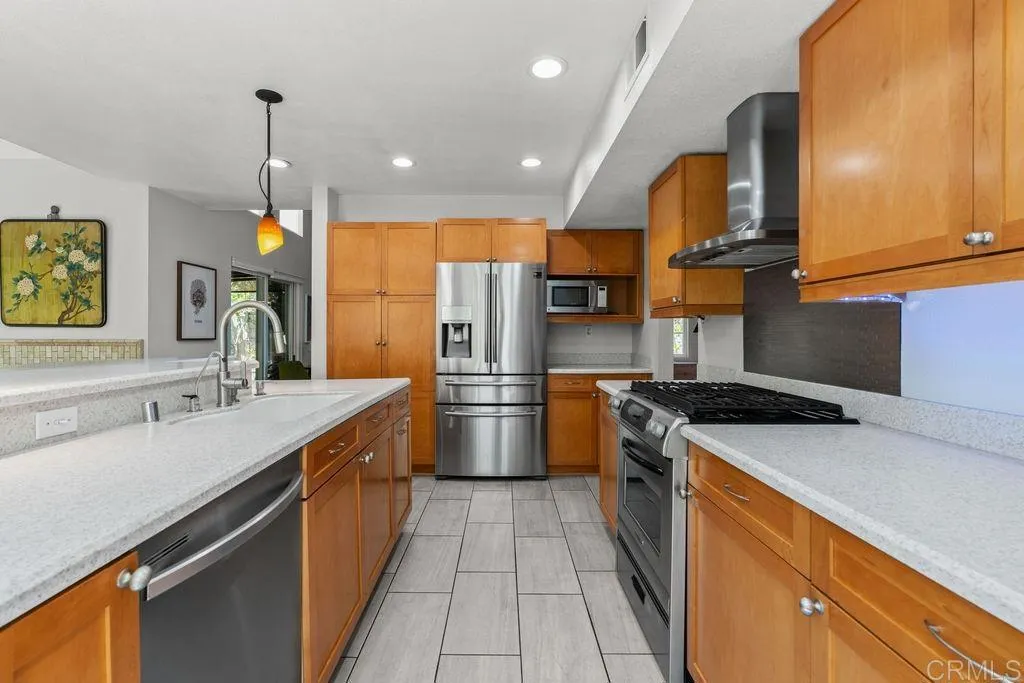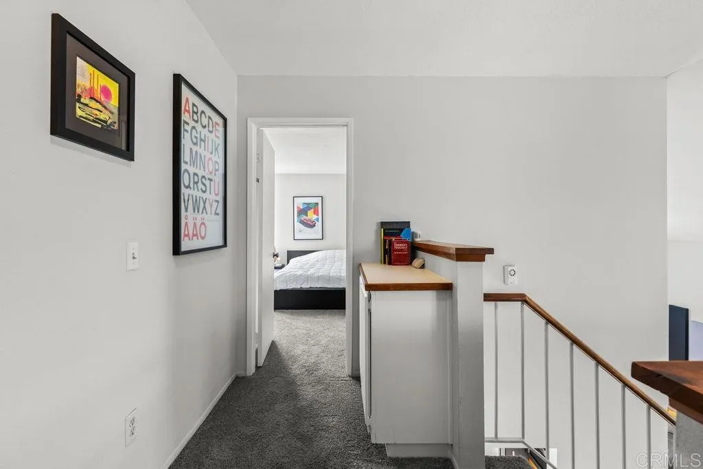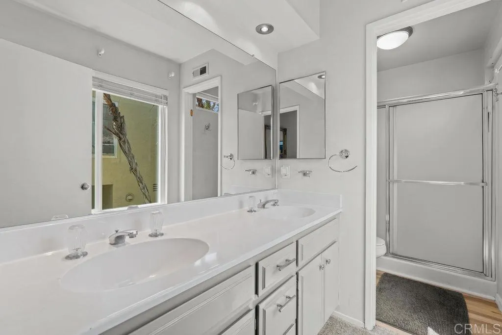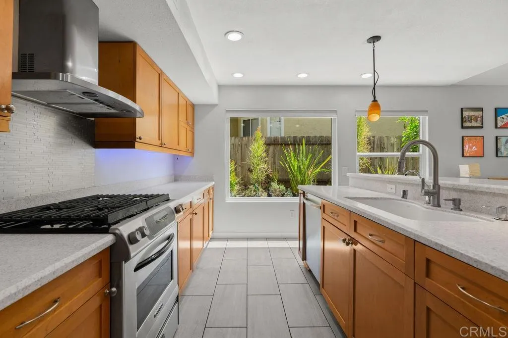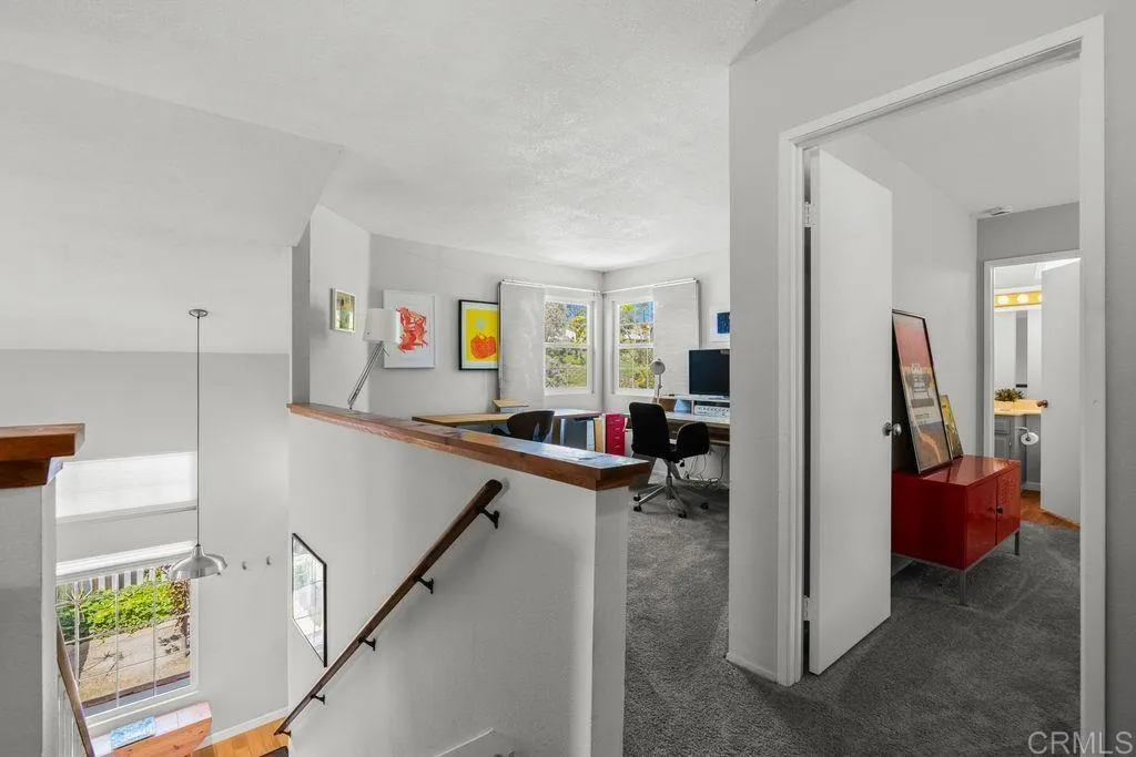 Welcome to 4221 Via Tercero in the highly sought after community of Rancho del Oro. This beautiful two story home offers an exceptional opportunity in a prime Oceanside location. Step inside to vaulted ceilings, dual pane vinyl windows, and abundant natural light, creating a bright and open feel throughout. The main level showcases real birch hardwood flooring, a cozy fireplace, and a modern kitchen with an oversized island, birch wood cabinetry, and stainless steel appliances. A guest bathroom, dedicated laundry room with washer and dryer, and direct access to the two car garage complete the main level. Upstairs offers newer carpeting and a spacious primary suite with ample closet space and an ensuite bath featuring dual sinks and a walk in shower. Two secondary bedrooms share a Jack and Jill bathroom. One includes a walk in closet, while the other is currently configured as an office or loft. A builder option provides the flexibility to convert this space into a true third bedroom by adding a door and finishing the wall. The outdoor space includes a covered wood deck, mature fruit trees, and plenty of room to relax, entertain, or play. The lot extends beyond the fence line and spans just over 9,000 square feet. Residents enjoy low HOA fees and no Mello Roos. The location offers convenient access to parks, recreation, shopping, dining, local beaches, Oceanside Harbor, and downtown Oceanside, along with nearby commuter routes.
