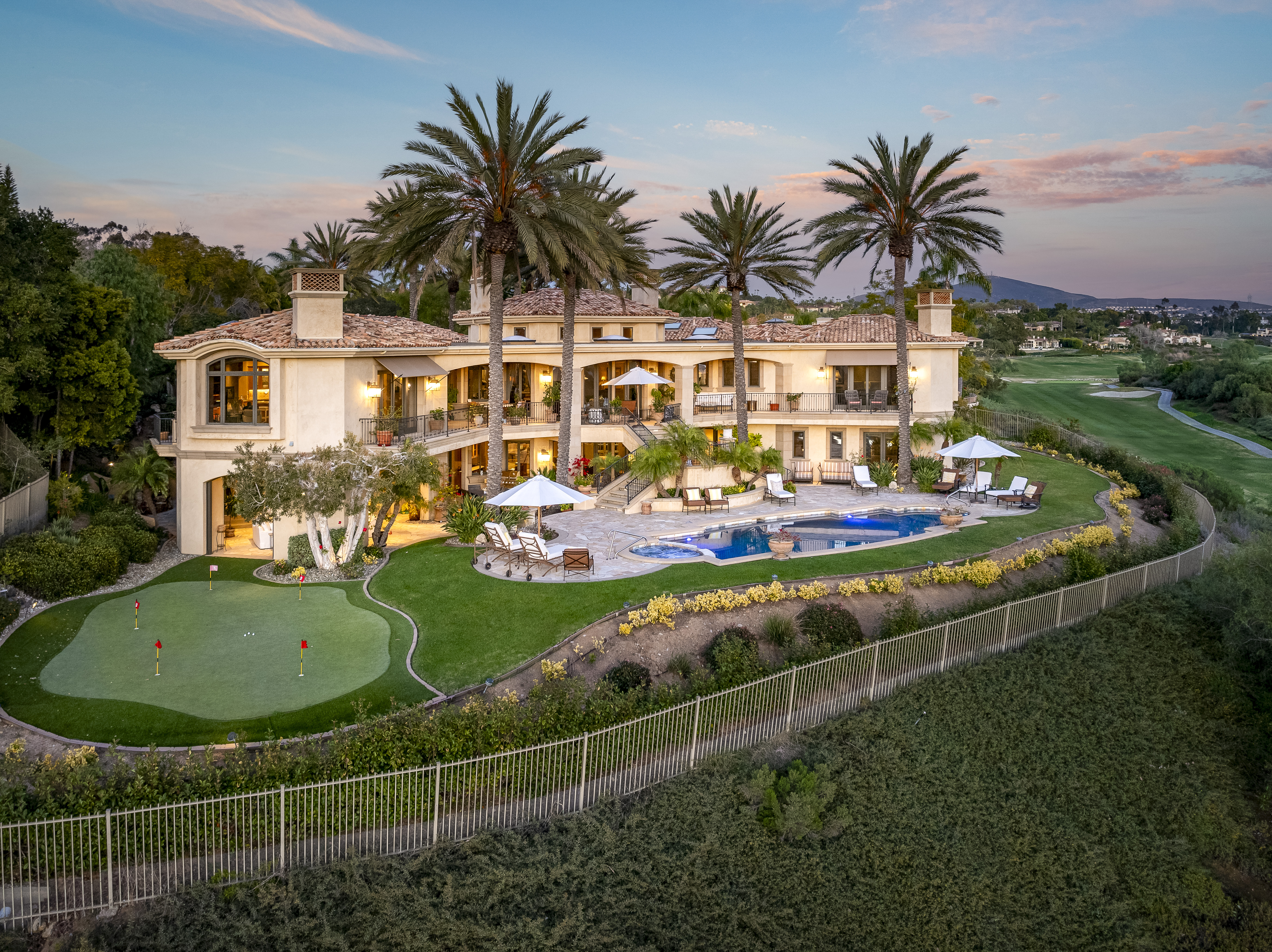 This architecturally significant residence is positioned on over an acre of elevated, exceptionally private grounds in Del Mar, surrounded by mature landscape and natural beauty. Inside, a dramatic two-story living room framed by walls of glass and skylights captures expansive valley and hillside views, establishing an immediate connection between interior and exterior spaces. The floor plan unfolds with intention, enabling a natural flow between living areas that feel both open and grounded. The living experience spans multiple levels, each offering a distinct sense of space and perspective. The entry-level primary suite provides a quiet retreat with direct access to the outdoors. Below, three bedrooms and a secondary living area, anchored by a striking wine display, allow flexibility for guests, entertaining, or everyday living. At the top, a sculptural staircase leads to a private office with bath and access to a view deck overlooking the polo fields, easily adaptable as a fifth bedroom or creative workspace. Outside, the property transforms into a true retreat. A curved pool and spa anchor the grounds, surrounded by multiple lounge areas, an outdoor kitchen, and layered greenery that provide both privacy and atmosphere. From sunlit terraces to shaded gathering spaces, the setting is designed for both quiet moments and effortless entertaining. A home that lives like a private resort, where architecture, landscape, and light come together to create rare scale, privacy, and a sense of escape in one of Del Mar’s most sought-after rural settings.